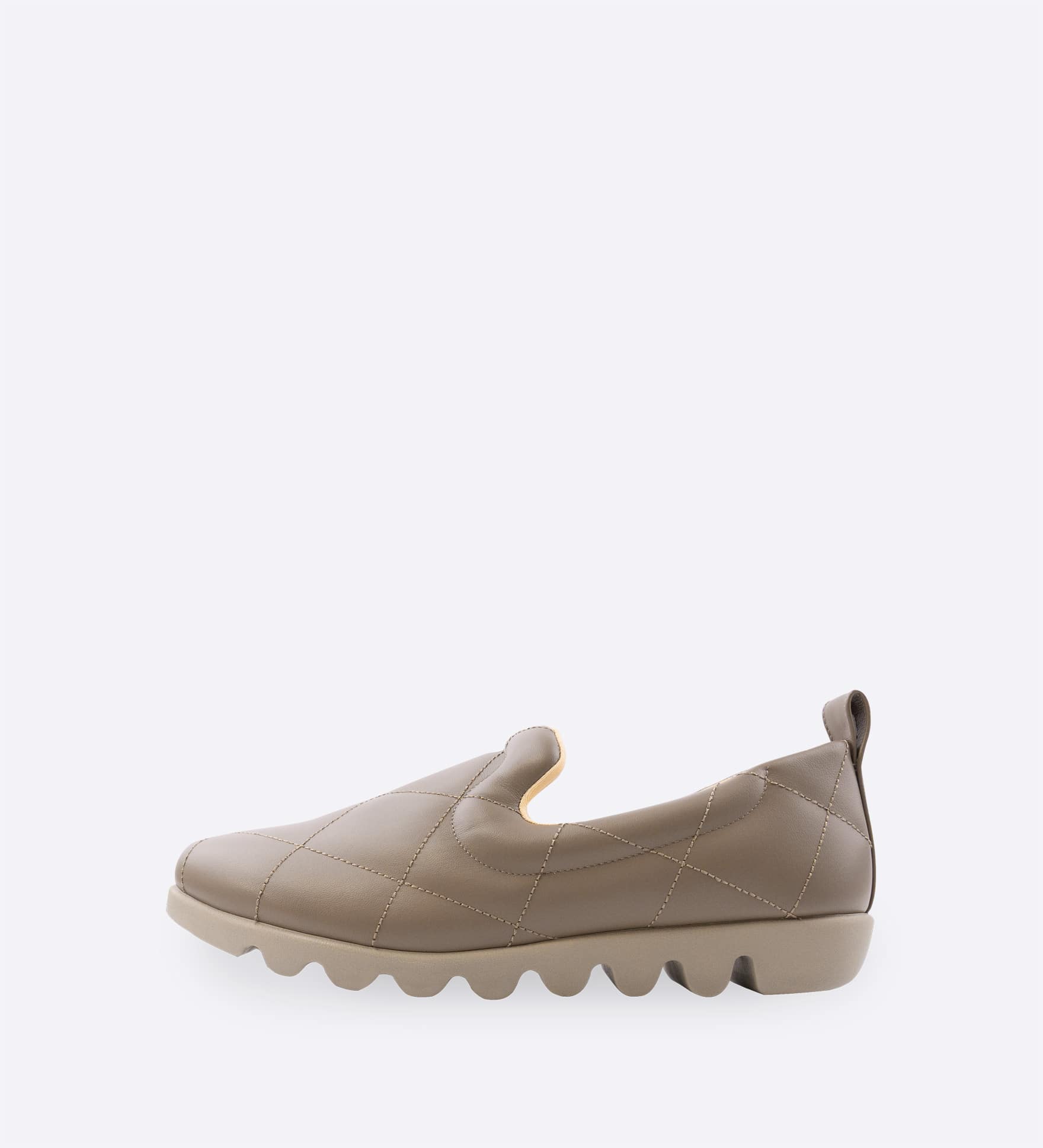 キルティングのやわらかな素材感が心地よく、足元にあたたかみを添える一足。丸みのあるフォルムと、すっきりとした甲のラインで、リラックス感の中にも上品な印象を演出します。アッパーに施したインナースポンジがやさしく足にフィットし、軽くグリップ力のある3cmの「ウェーブソールリップル」を採用しています。
