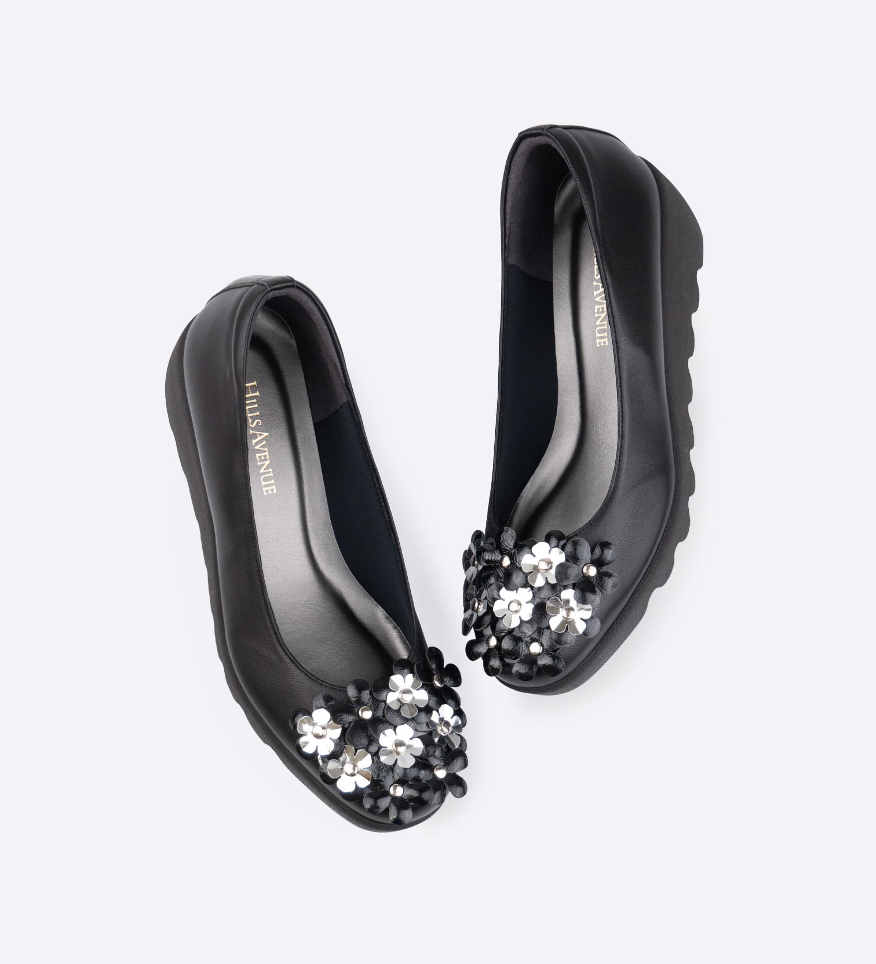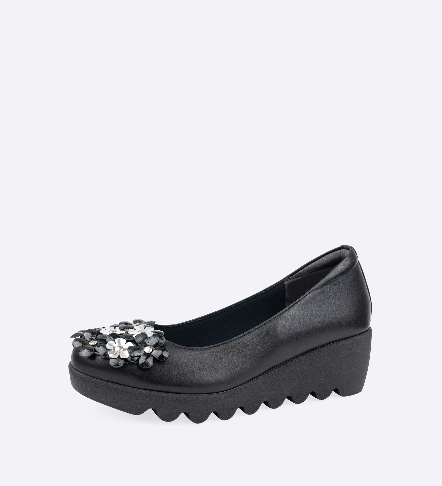 柔らかなスムースレザー素材に、可憐な小花モチーフをあしらいました。大人の装いに文字通り華を添える一足です。アッパーに施したインナースポンジがやさしく足にフィットし、屈曲性とグリップ力に優れた「ウェーブソール」が、快適な歩行をサポートします。
