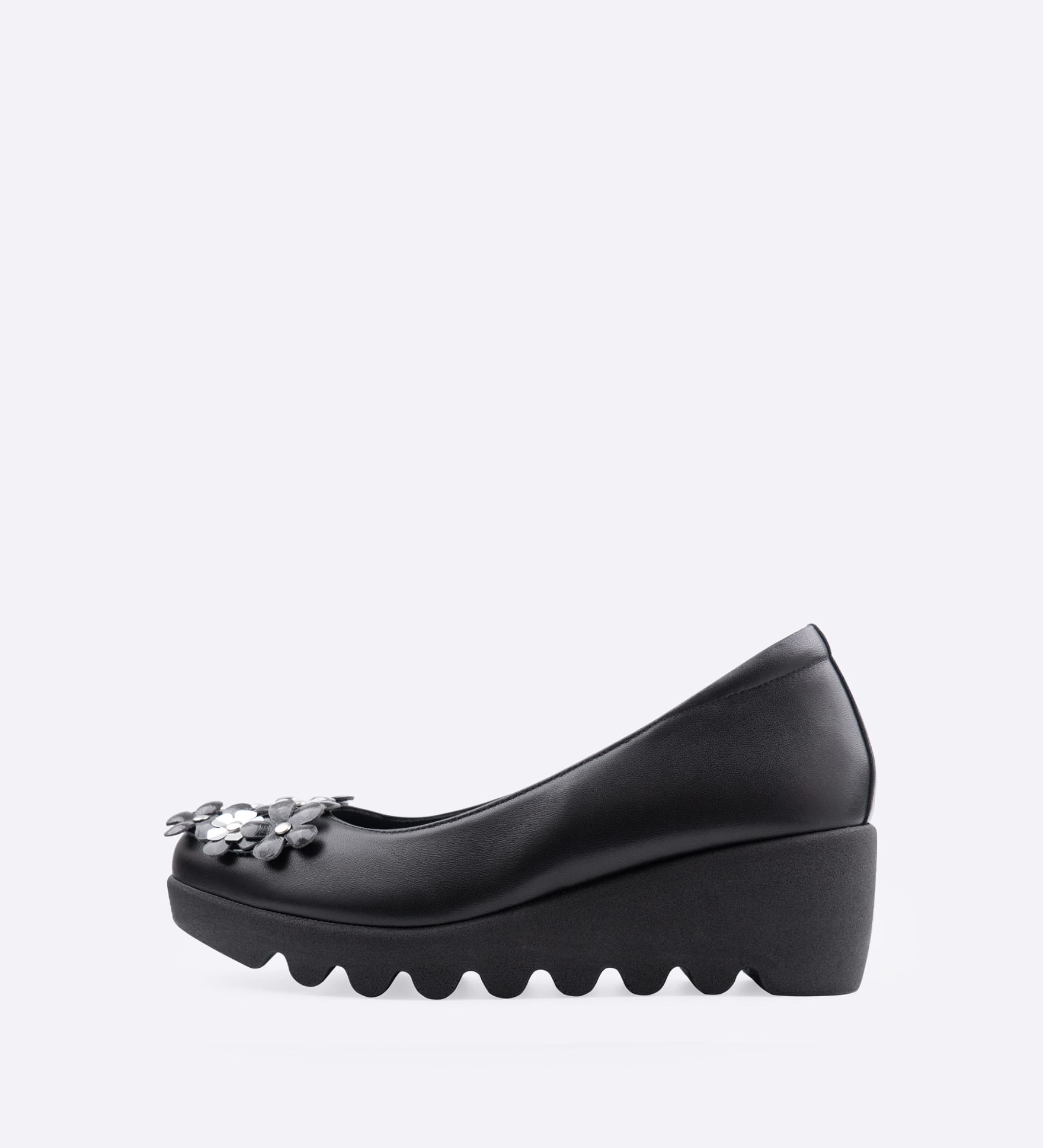 柔らかなスムースレザー素材に、可憐な小花モチーフをあしらいました。大人の装いに文字通り華を添える一足です。アッパーに施したインナースポンジがやさしく足にフィットし、屈曲性とグリップ力に優れた「ウェーブソール」が、快適な歩行をサポートします。