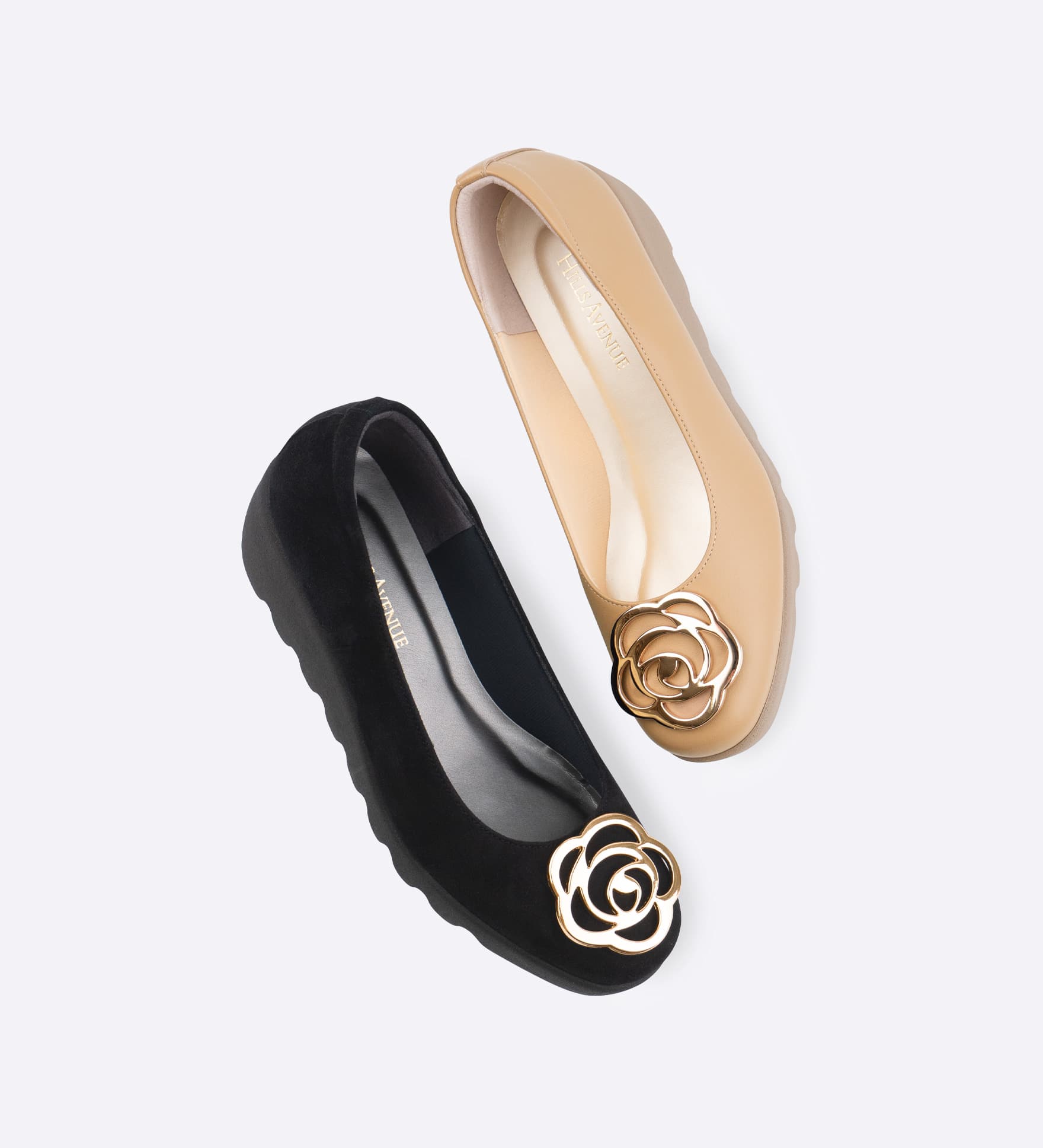 柔らかなレザー素材に、ゴールドのフラワーを配しアクセントを効かせました。足元を主役にする一足です。アッパーに施したインナースポンジがやさしく足にフィットし、屈曲性とグリップ力に優れた「ウェーブソール」が、快適な歩行をサポートします。