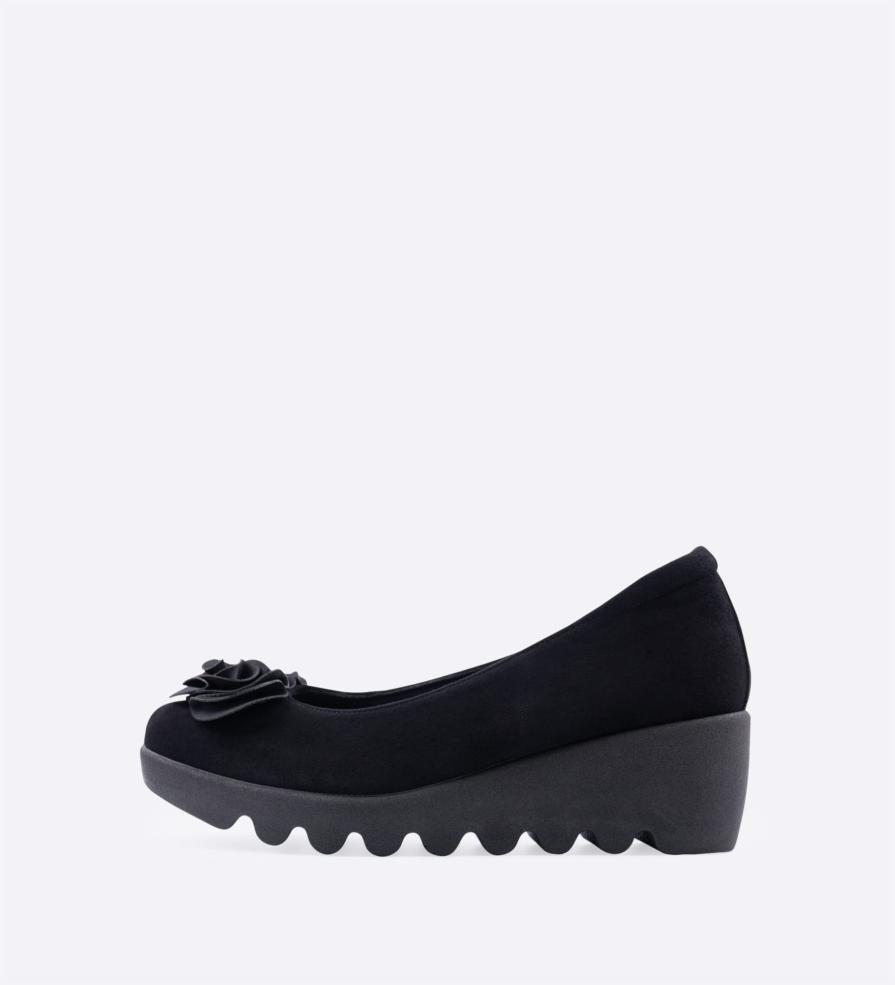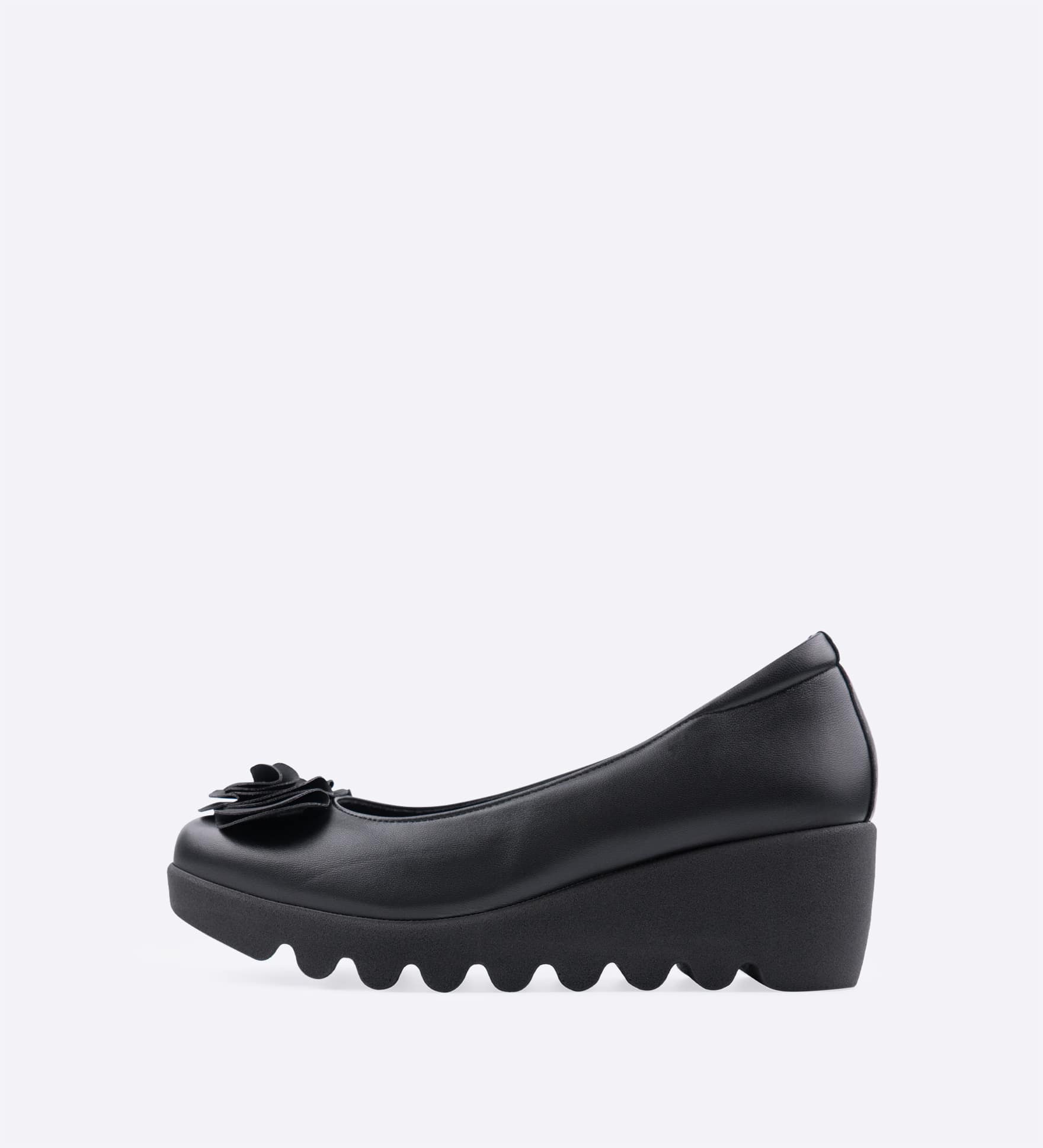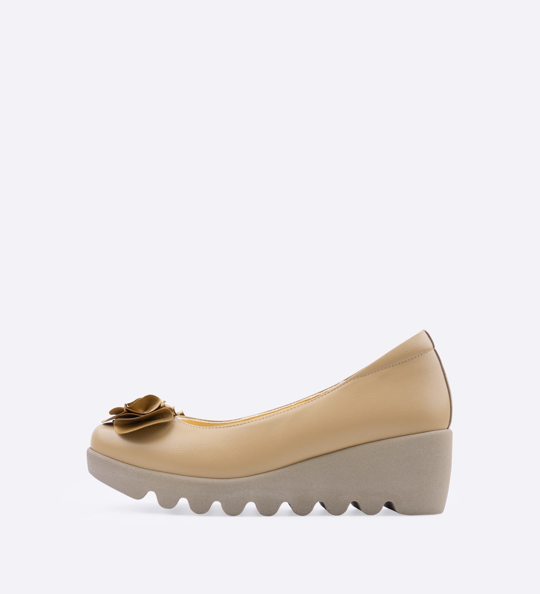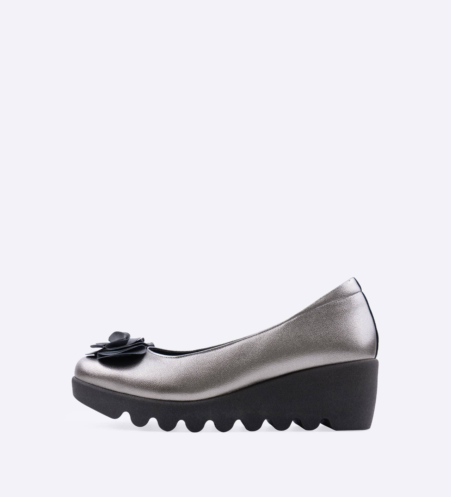 やわらかなレザーのパンプスに、優雅なサテン素材のフラワーを添えました。アッパーに施されたインナースポンジで足あたりがよく、屈曲性とグリップ力に優れた「ウェーブソール」を採用しています。
