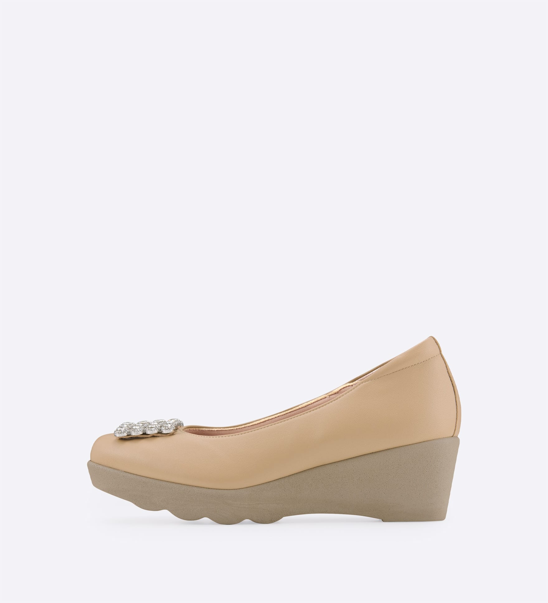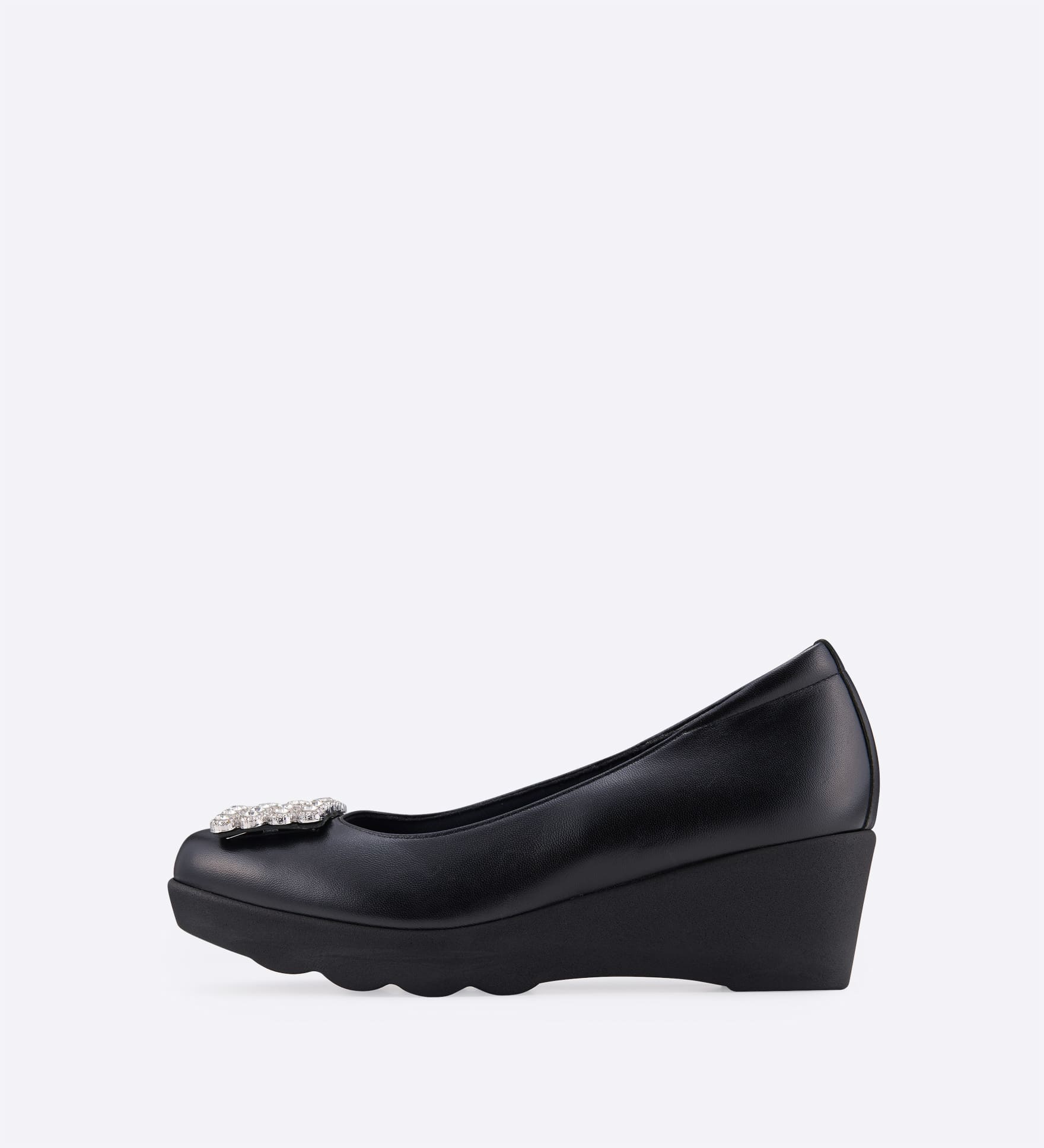 小粒のビジューを贅沢にあしらった、華やかな印象のパンプスです。すっきりとしたクリアウェーブソールが足元に軽やかさを添え、上品な輝きを引き立てます。シンプルなフォルムながら存在感があり、デイリーからオケージョンまで幅広く活躍する一足です。
