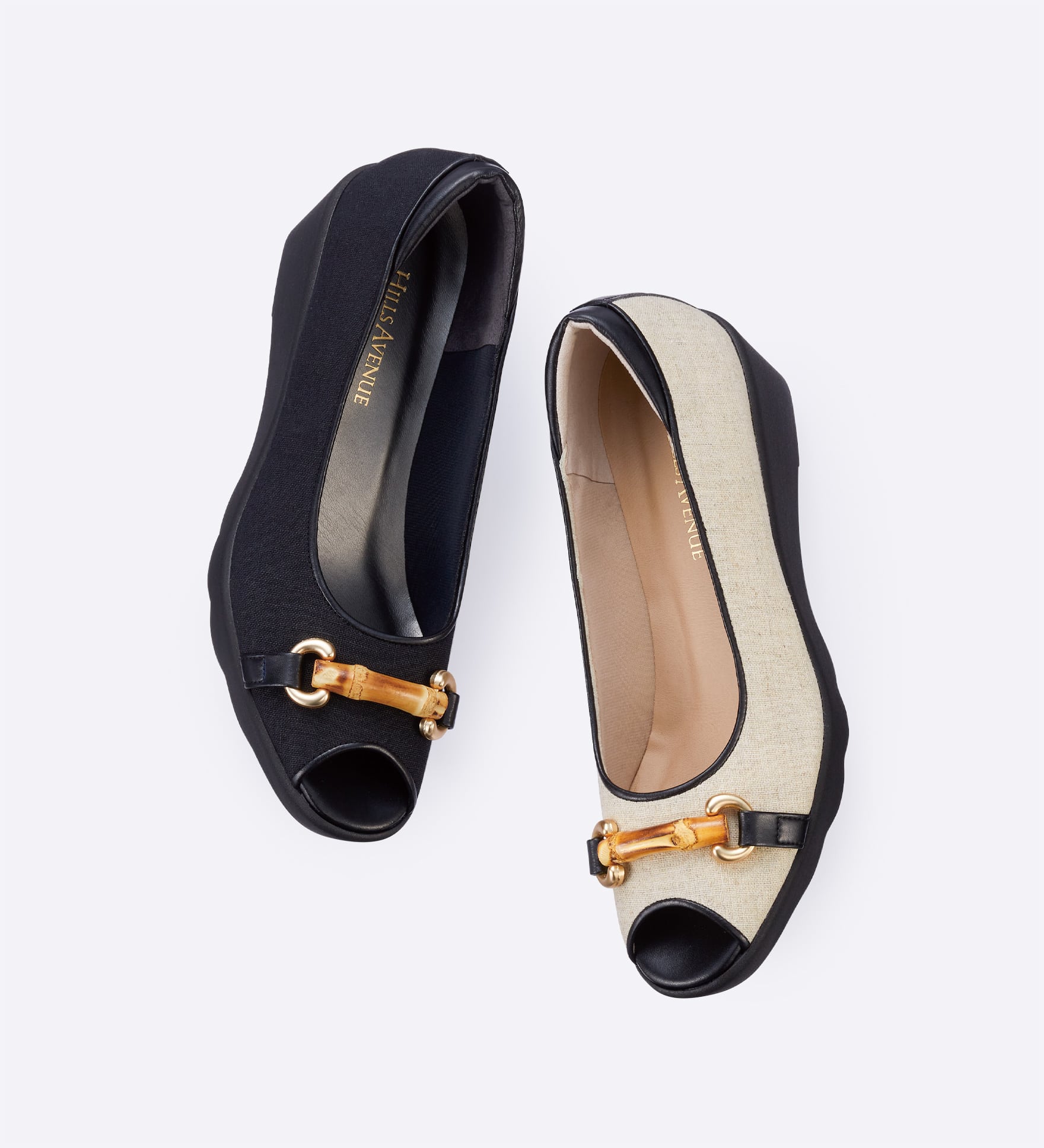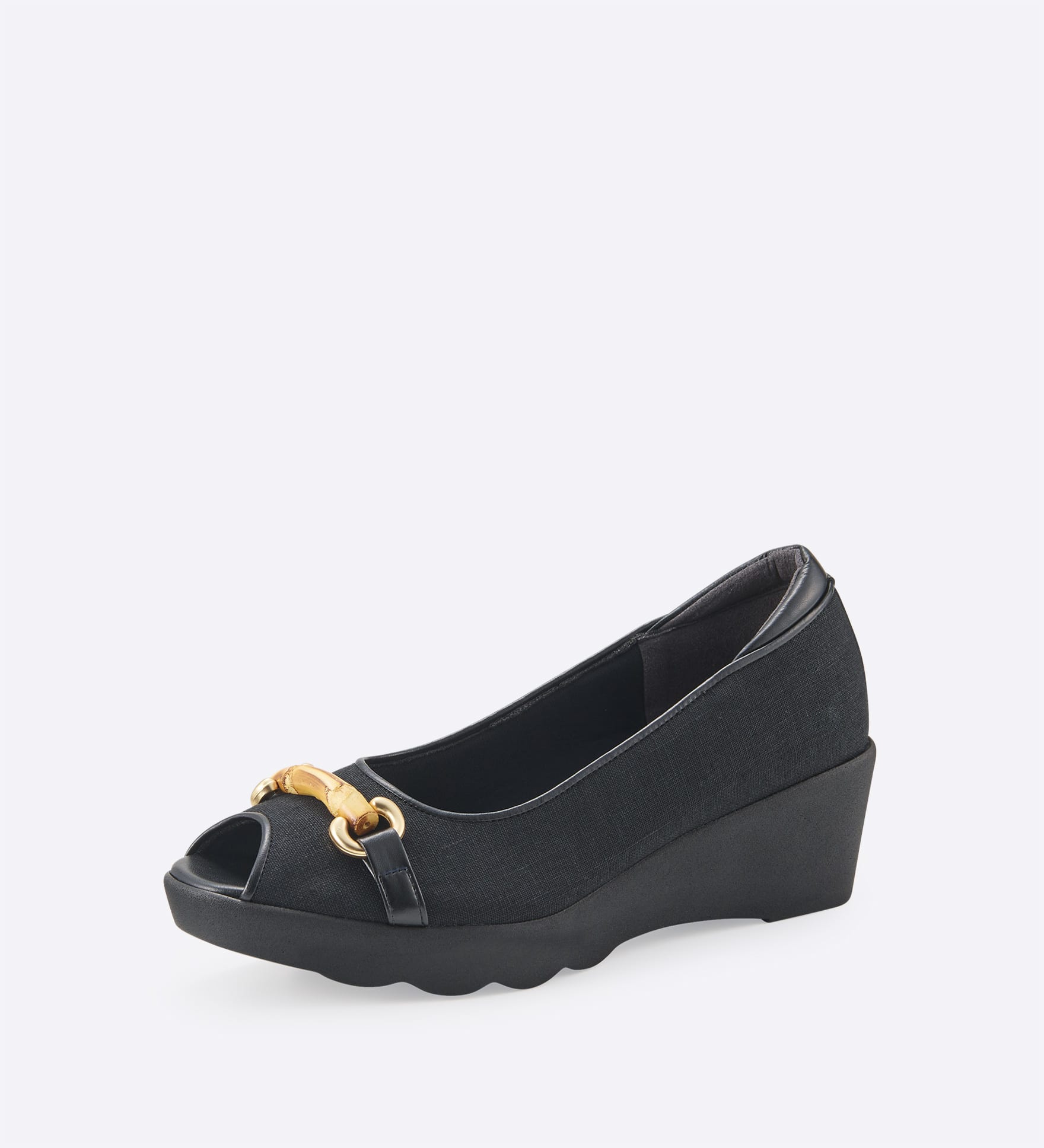バンブービットをあしらった、オープントゥパンプスです。麻素材のナチュラルな風合いに、本革パイピングを組み合わせ、足元を引き締めた印象に。カジュアルにもきれいめにも合わせやすく、季節感のあるスタイリングを楽しめます。