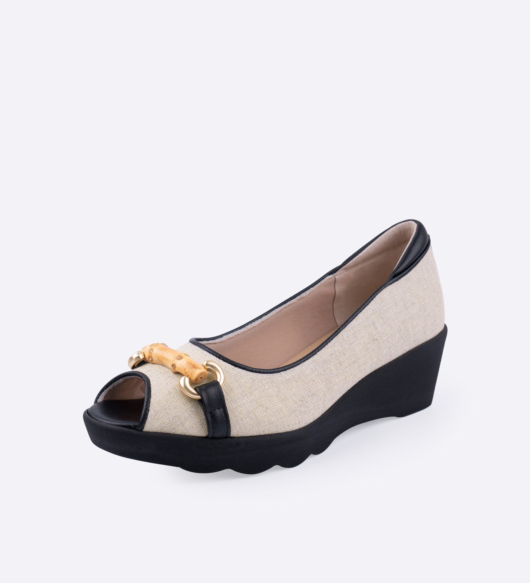バンブービットをあしらった、オープントゥパンプスです。麻素材のナチュラルな風合いに、本革パイピングを組み合わせ、足元を引き締めた印象に。カジュアルにもきれいめにも合わせやすく、季節感のあるスタイリングを楽しめます。