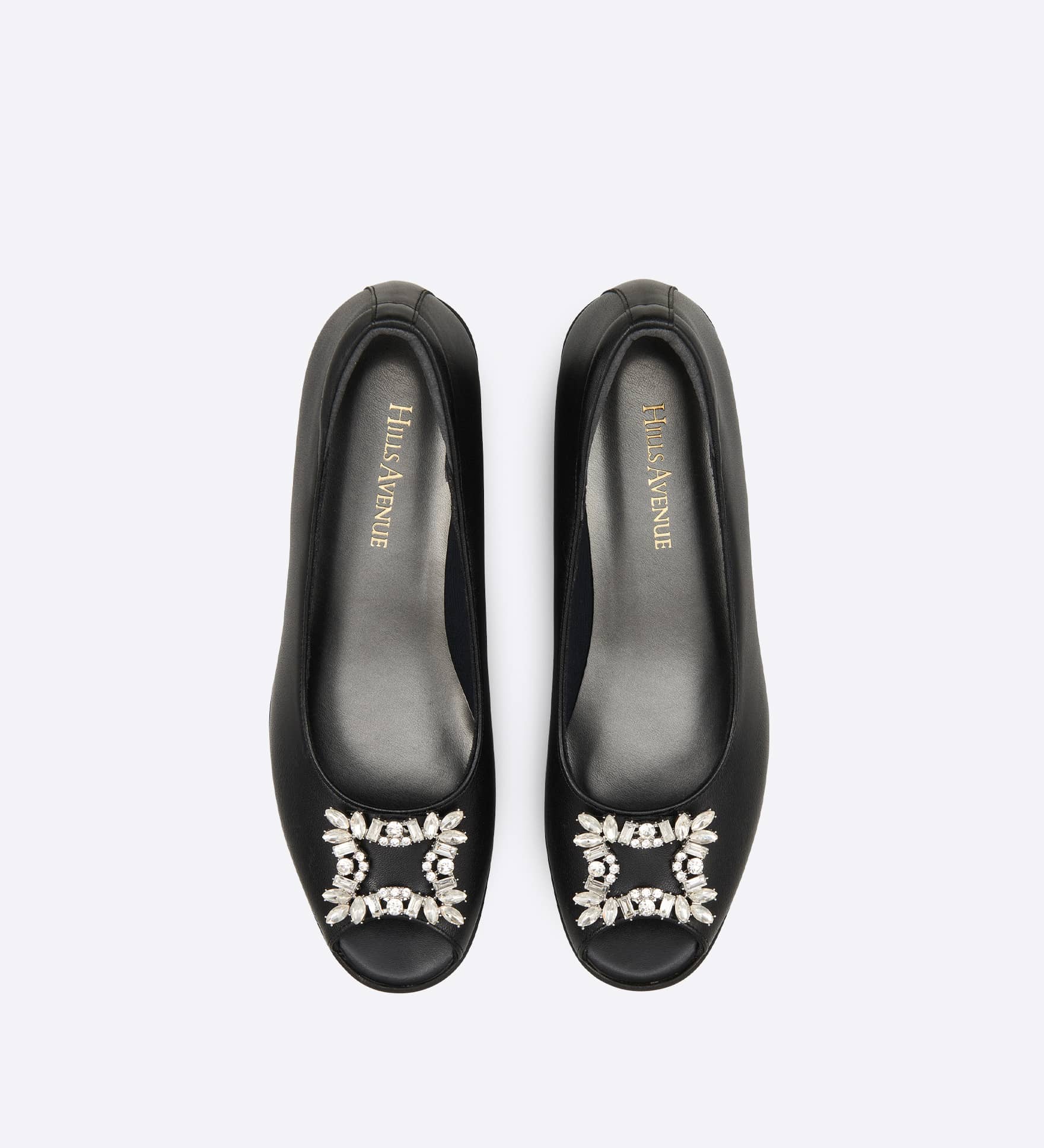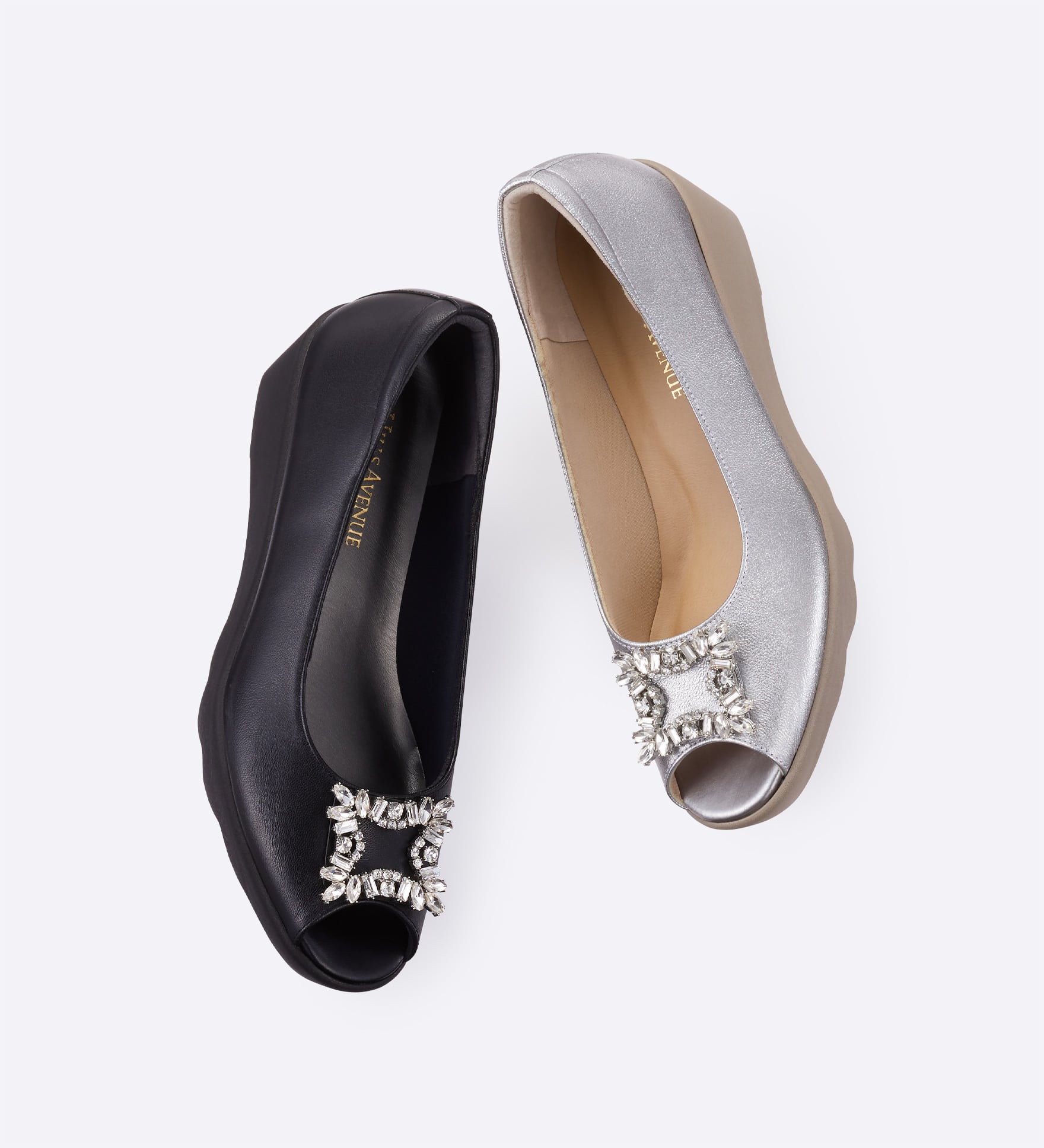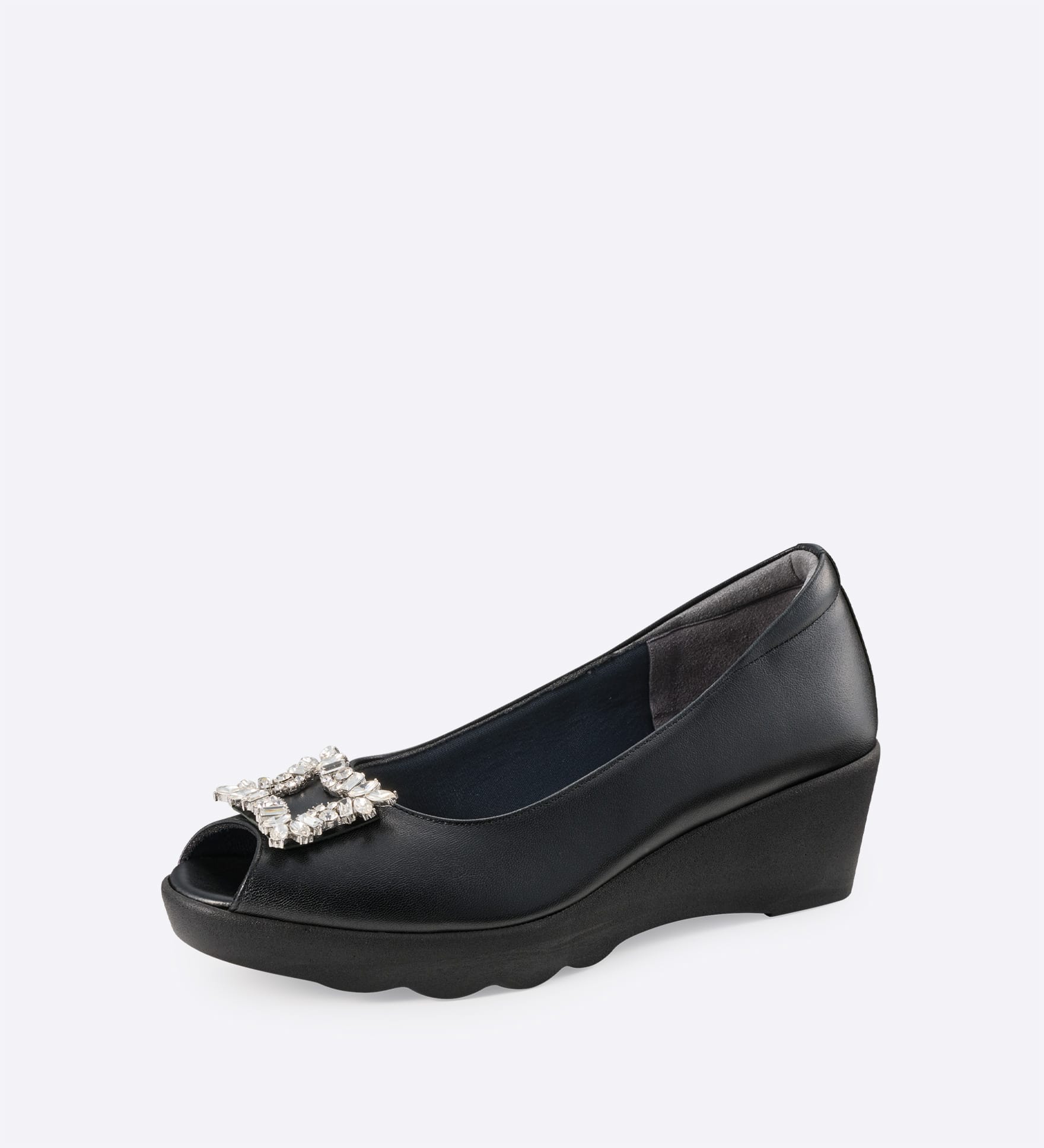 スクエアビジューが華やかに映えるオープントゥパンプス