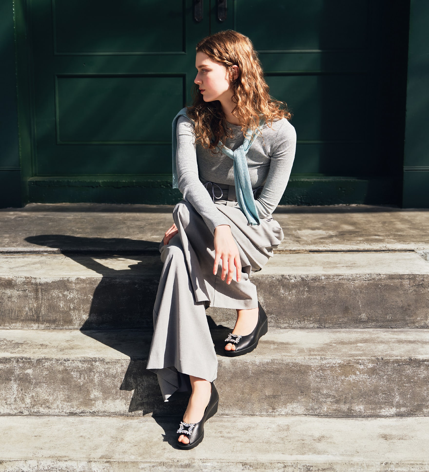 人気のビジューパンプスをベースにした、オープントゥデザインです。少しカーブを持たせたスクエアビジューが足元のアクセントになり、上品さと華やかさを両立。つま先の空き具合にも配慮したフォルムで、きれいめな印象に仕上げています。