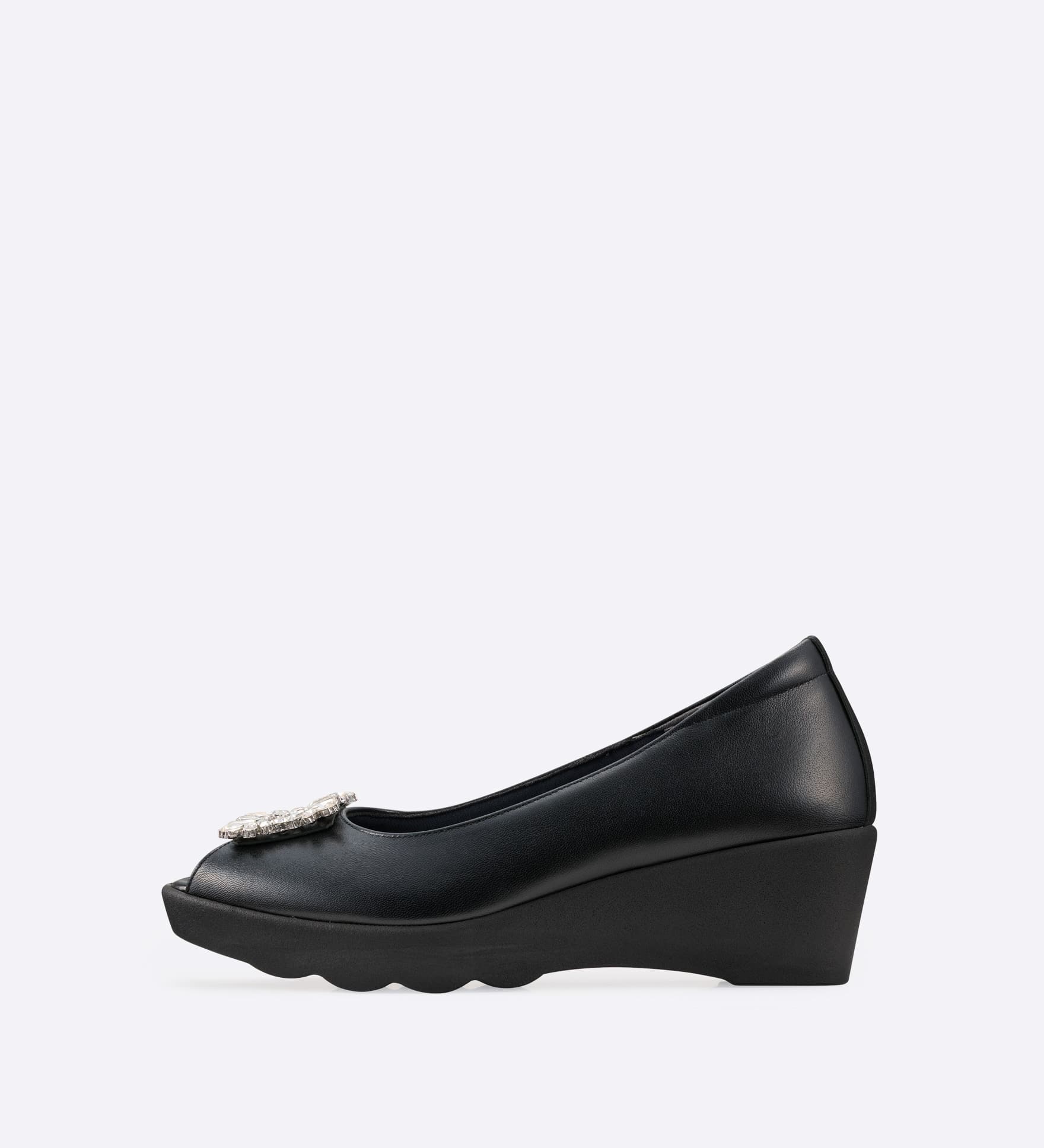 スクエアビジューが華やかに映えるオープントゥパンプス