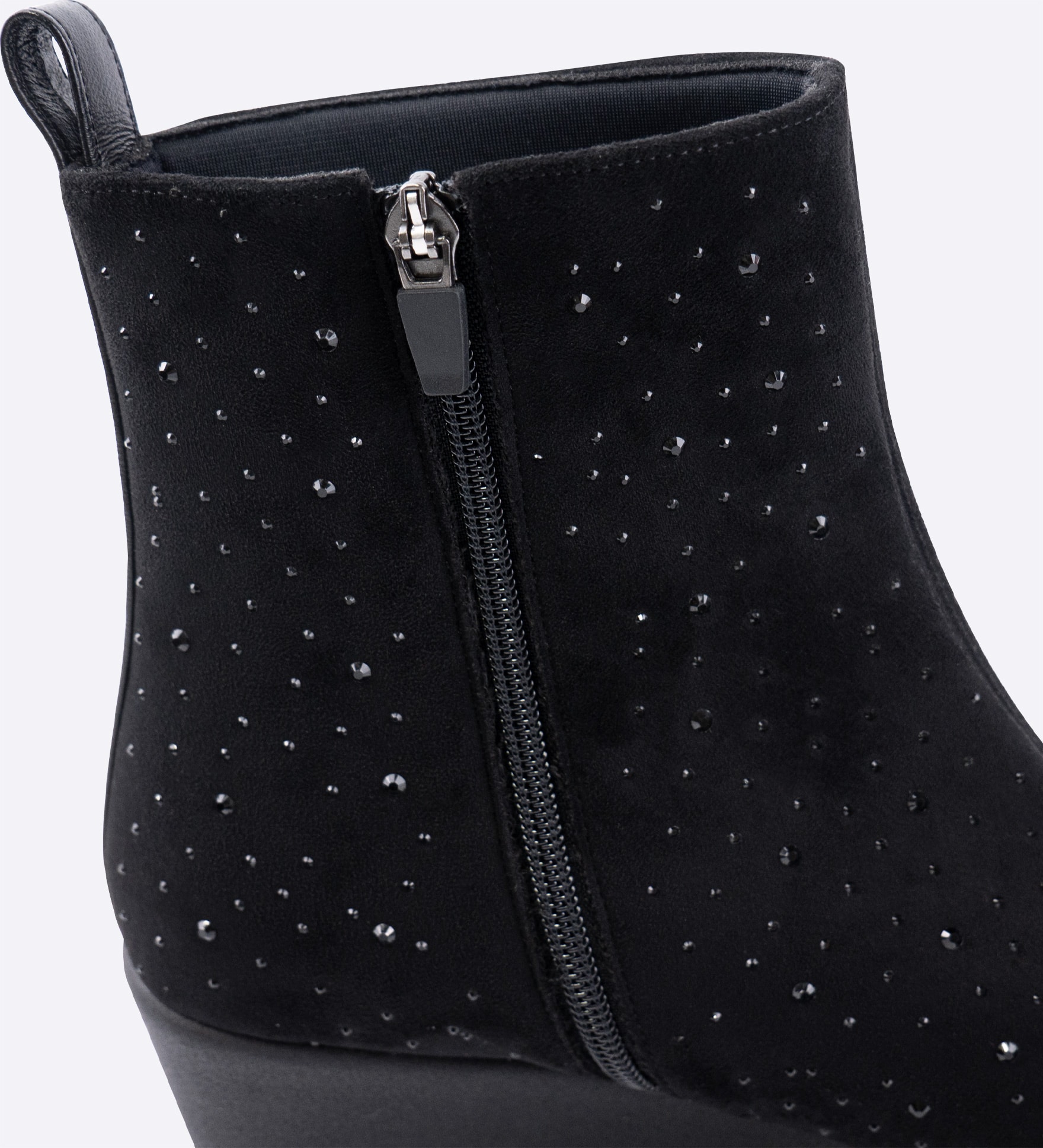 アッパー全体にラインストーンを散りばめ、光を受けて繊細に輝くショートブーツに仕上げました。つま先に添えたリボンが、足元に愛らしさとアクセントを加えます。高さのあるウェッジソールと内側ファスナーで、見た目の美しさと履きやすさを両立。アッパーに施したインナースポンジがやさしく足にフィットし、すっきりとしたシルエットの「クリアウェーブソール」のアイテムです。