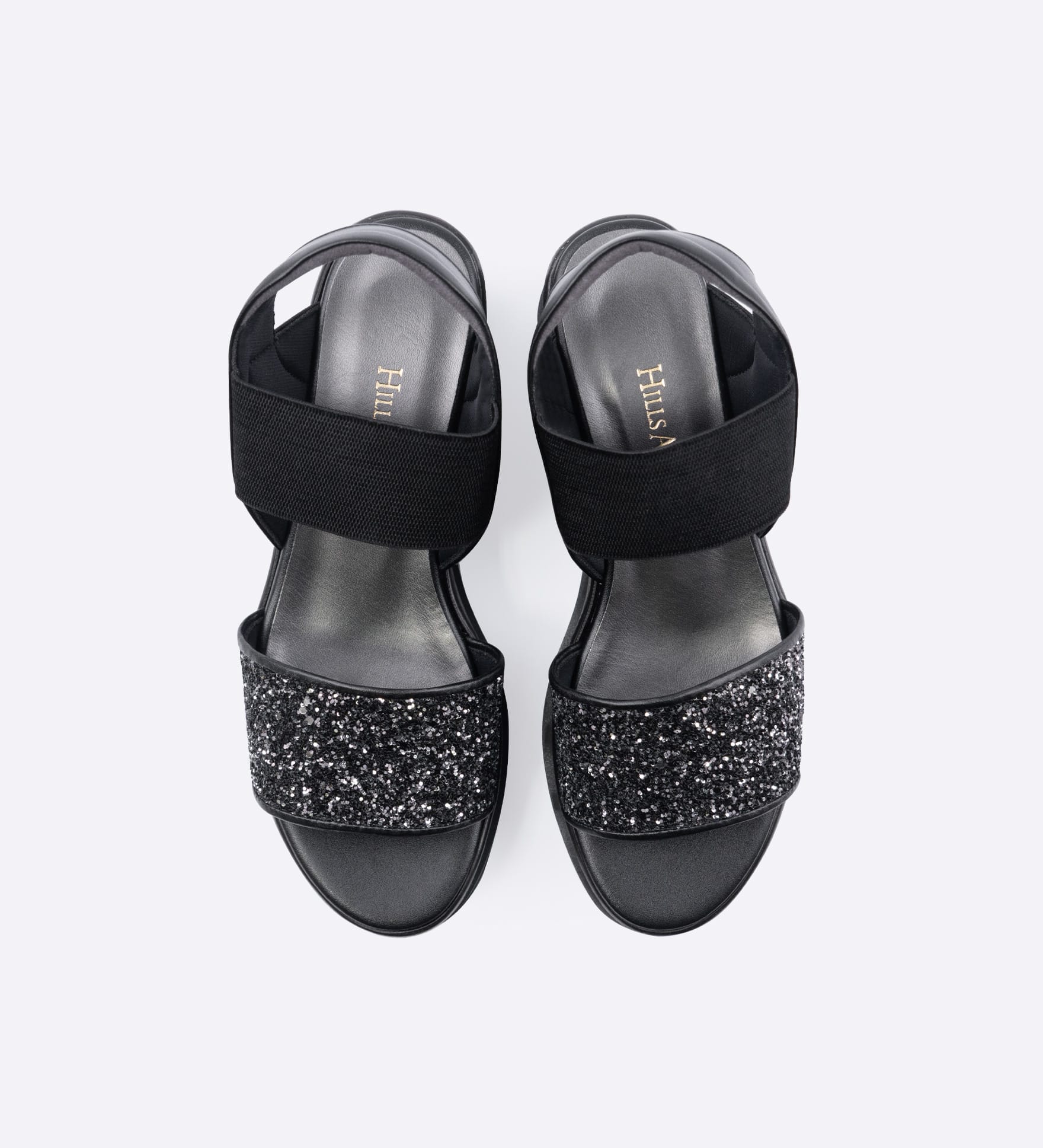 約7cmの厚みがありながら、高低差を抑えたプラットフォームソールで安定感のある履き心地。太めのベルトが足首をしっかりとホールドし、着脱もスムーズです。クッション性のあるウレタンミッドソールに、超軽量EVAアウトソールを組み合わせ、見た目以上に歩きやすい一足。グリッターやツイードなど多彩な素材展開で、装いの主役になります。