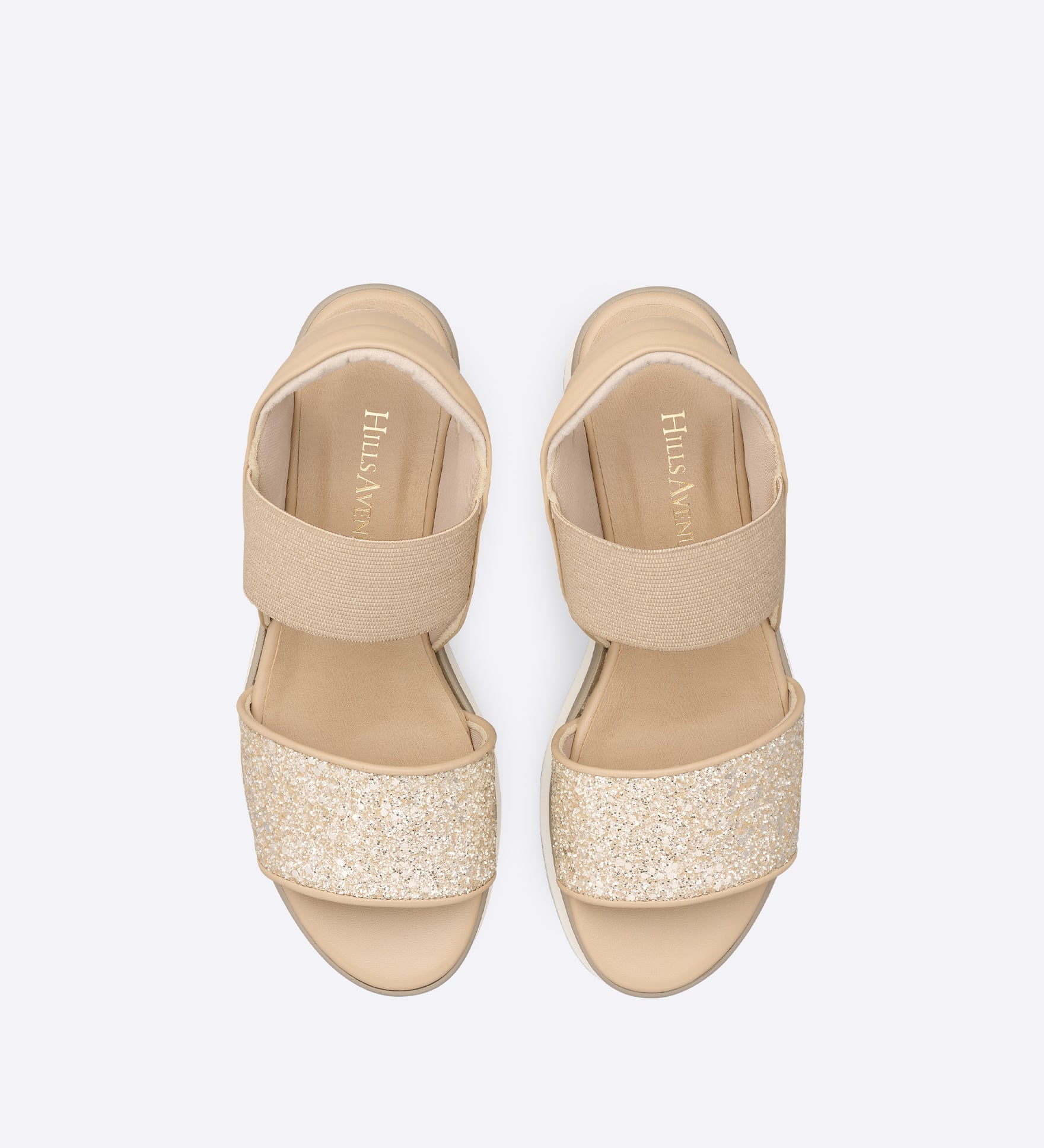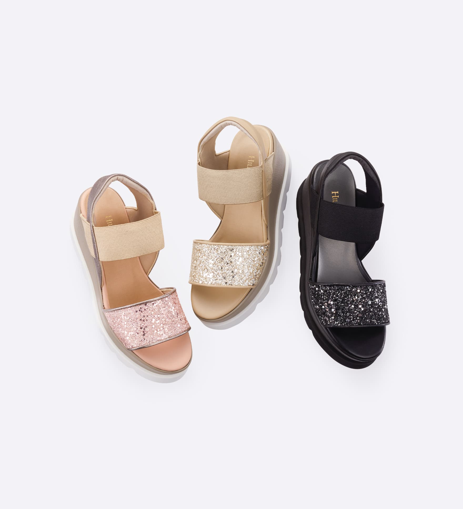 約7cmの厚みがありながら、前後差を抑えたプラットフォームソールで安定感のある履き心地。太めのベルトが足首をしっかりとホールドし、着脱もスムーズです。クッション性のあるウレタンミッドソールに、超軽量EVAアウトソールを組み合わせ、見た目以上に歩きやすい一足。グリッターやツイードなど多彩な素材展開で、装いの主役になります。