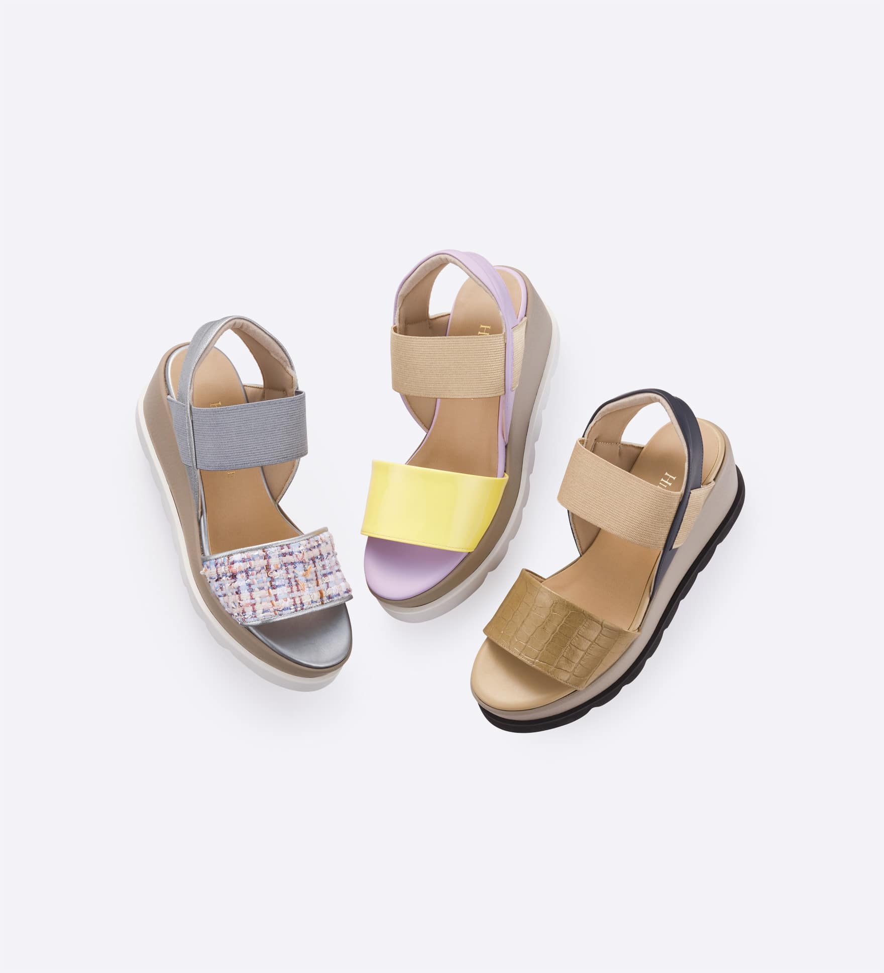 約7cmの厚みがありながら、前後差を抑えたプラットフォームソールで安定感のある履き心地。太めのベルトが足首をしっかりとホールドし、着脱もスムーズです。クッション性のあるウレタンミッドソールに、超軽量EVAアウトソールを組み合わせ、見た目以上に歩きやすい一足。グリッターやツイードなど多彩な素材展開で、装いの主役になります。