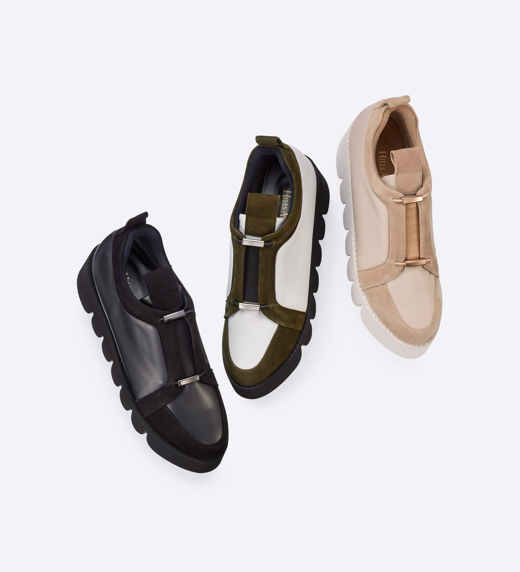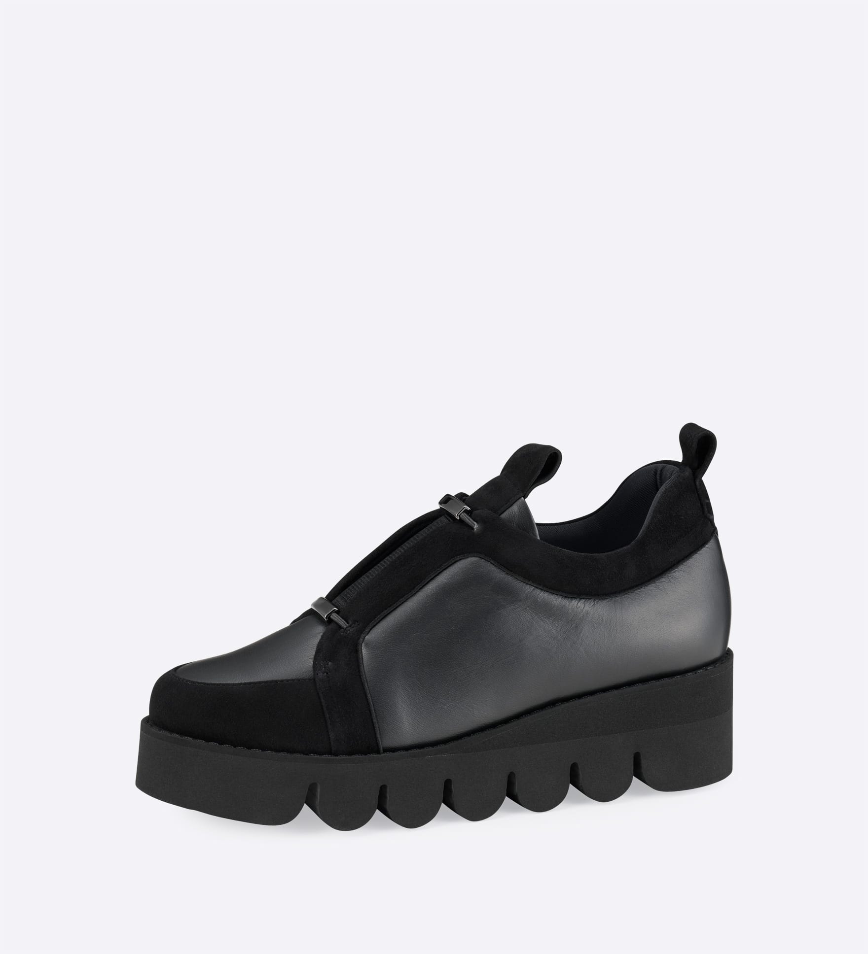 スムースとスエードの異素材を切り替えたアッパーに、中央のラインを引き締めるメタルパーツを添えました。スリッポン仕様で脱ぎ履きしやすく、すっきりとしたフォルムが大人のカジュアルスタイルにマッチします。アッパーに施されたインナースポンジがやさしく足にフィットし、滑りにくいEVAソールは厚底でありながら驚くほど軽く、安定感があります。