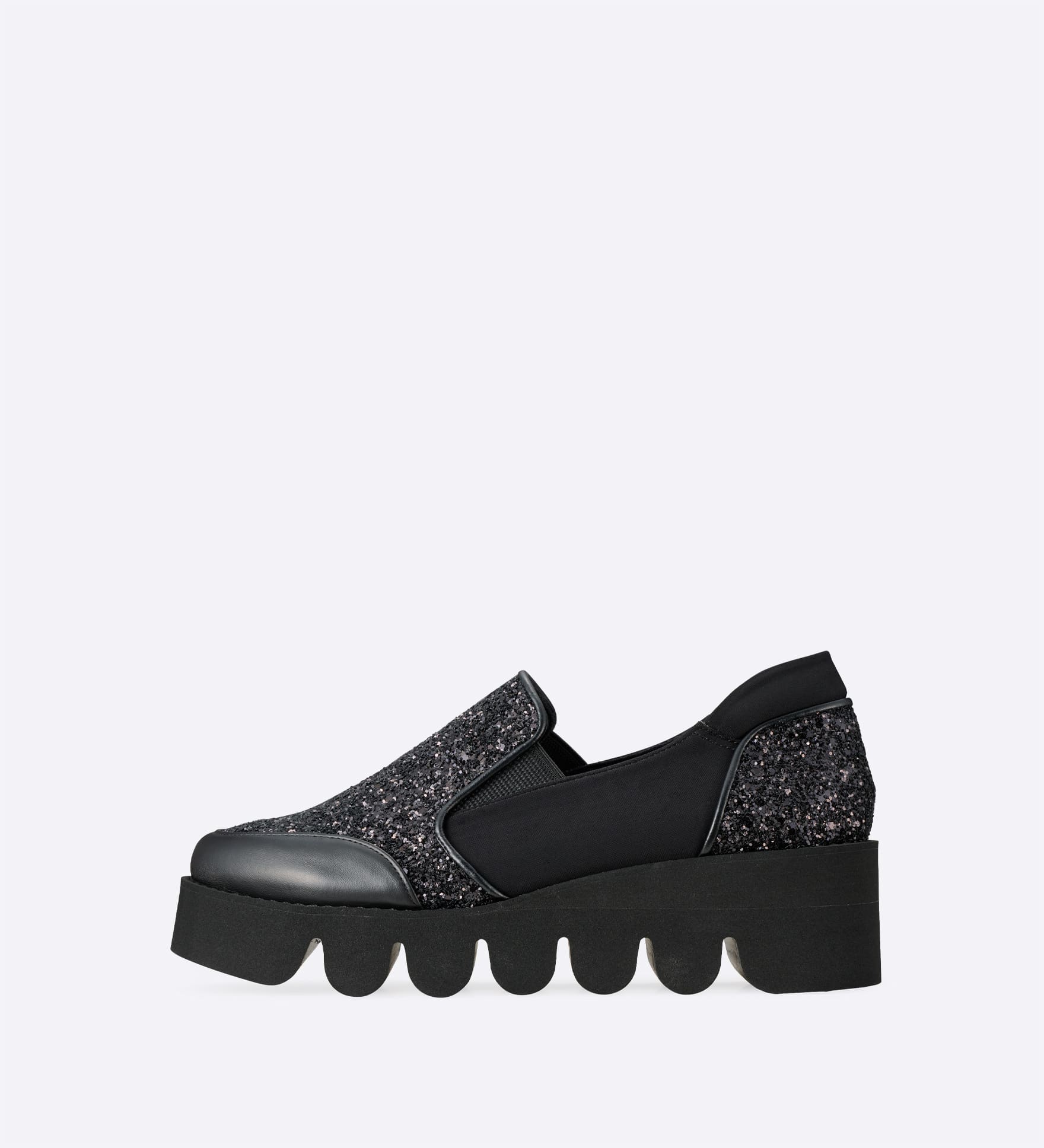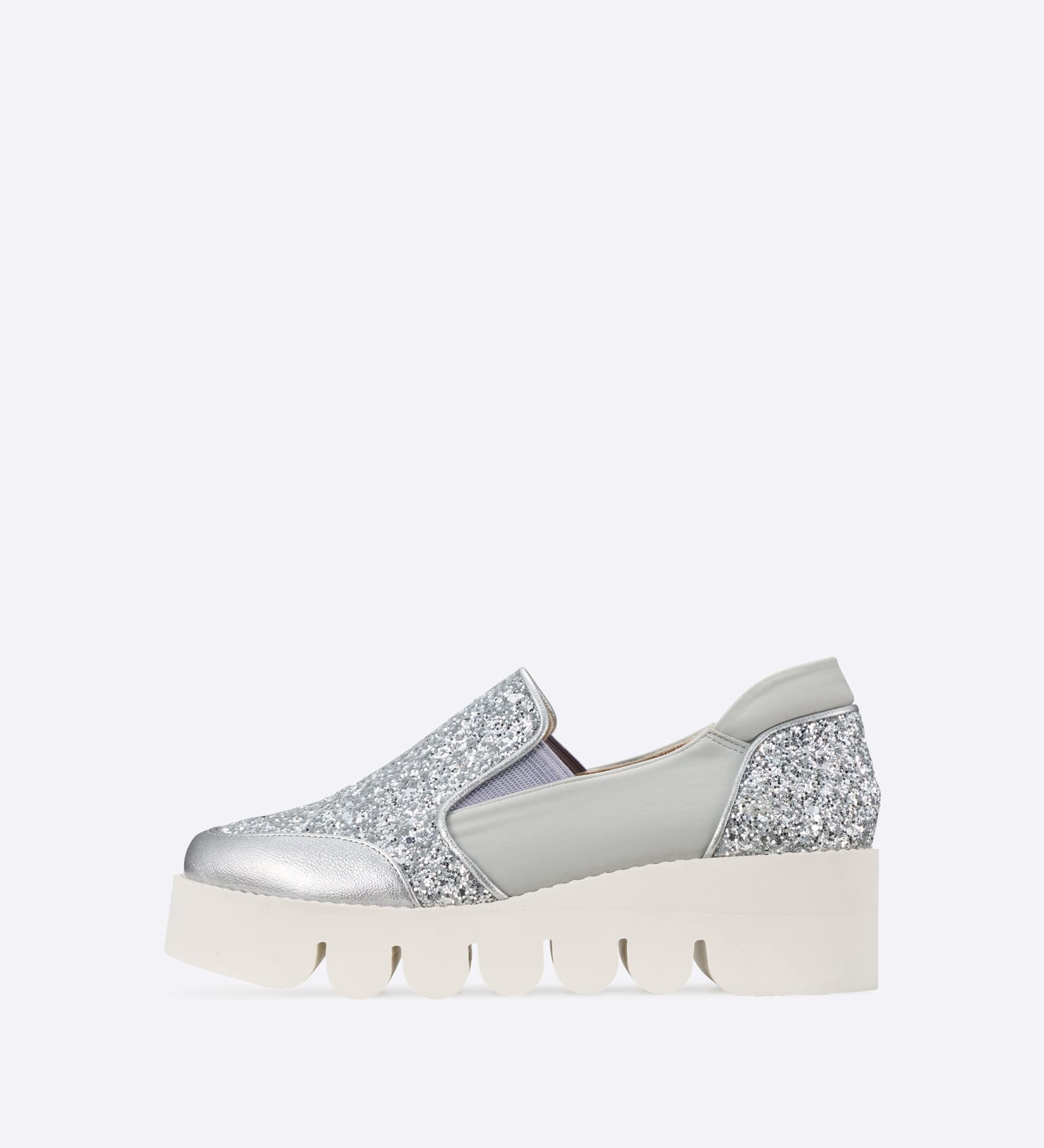 存在感のあるグリッター素材が足元を華やかに演出するスリッポンです。大小ミックスのグリッターが上品な輝きを放ち、カジュアルになりすぎず上質な印象に。サイドゴム仕様で足にしっかりフィットし、着脱もスムーズ。軽量なEVAソールと、かかと部分のスポンジで、見た目以上に快適な履き心地を実現しました。
