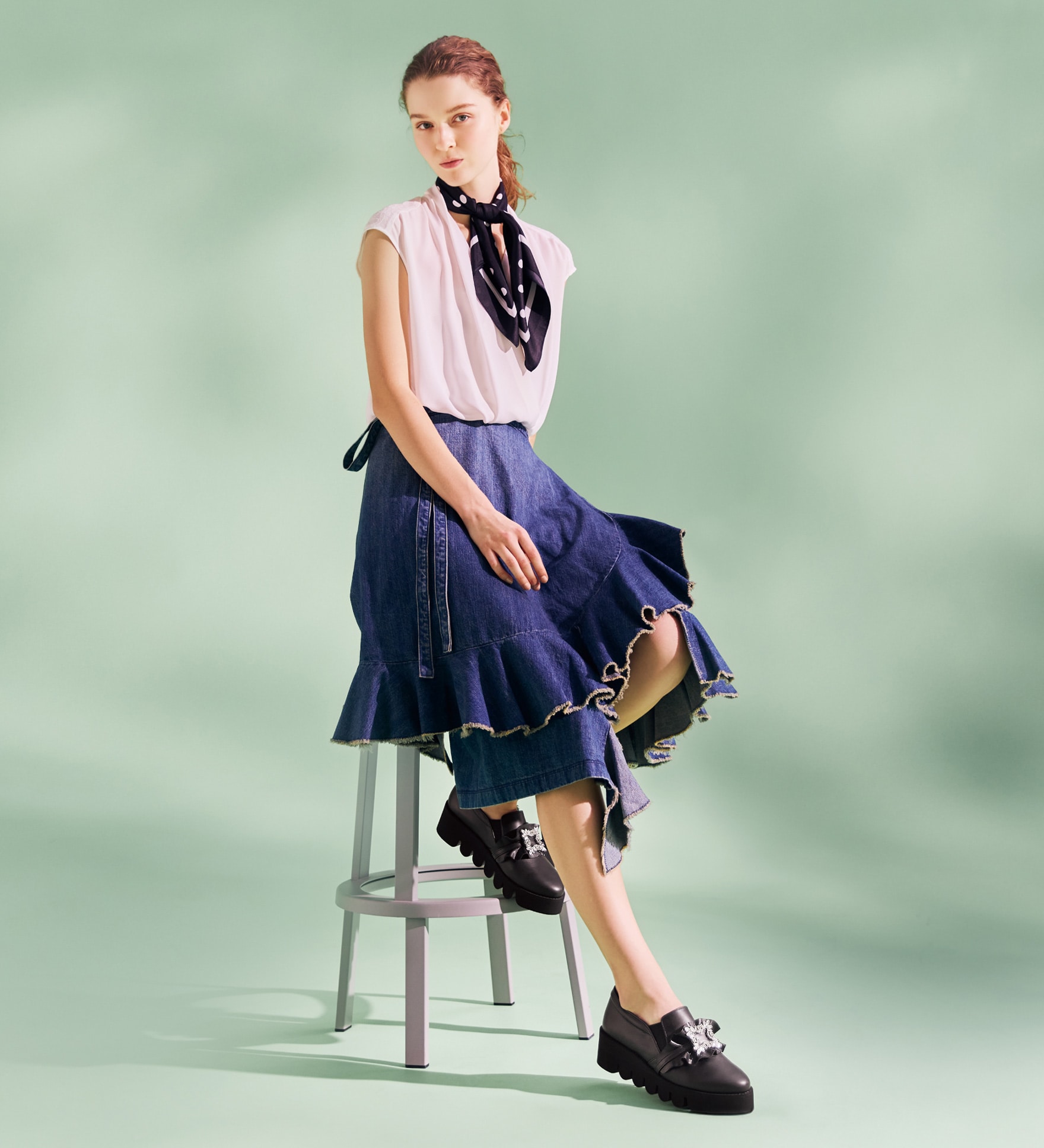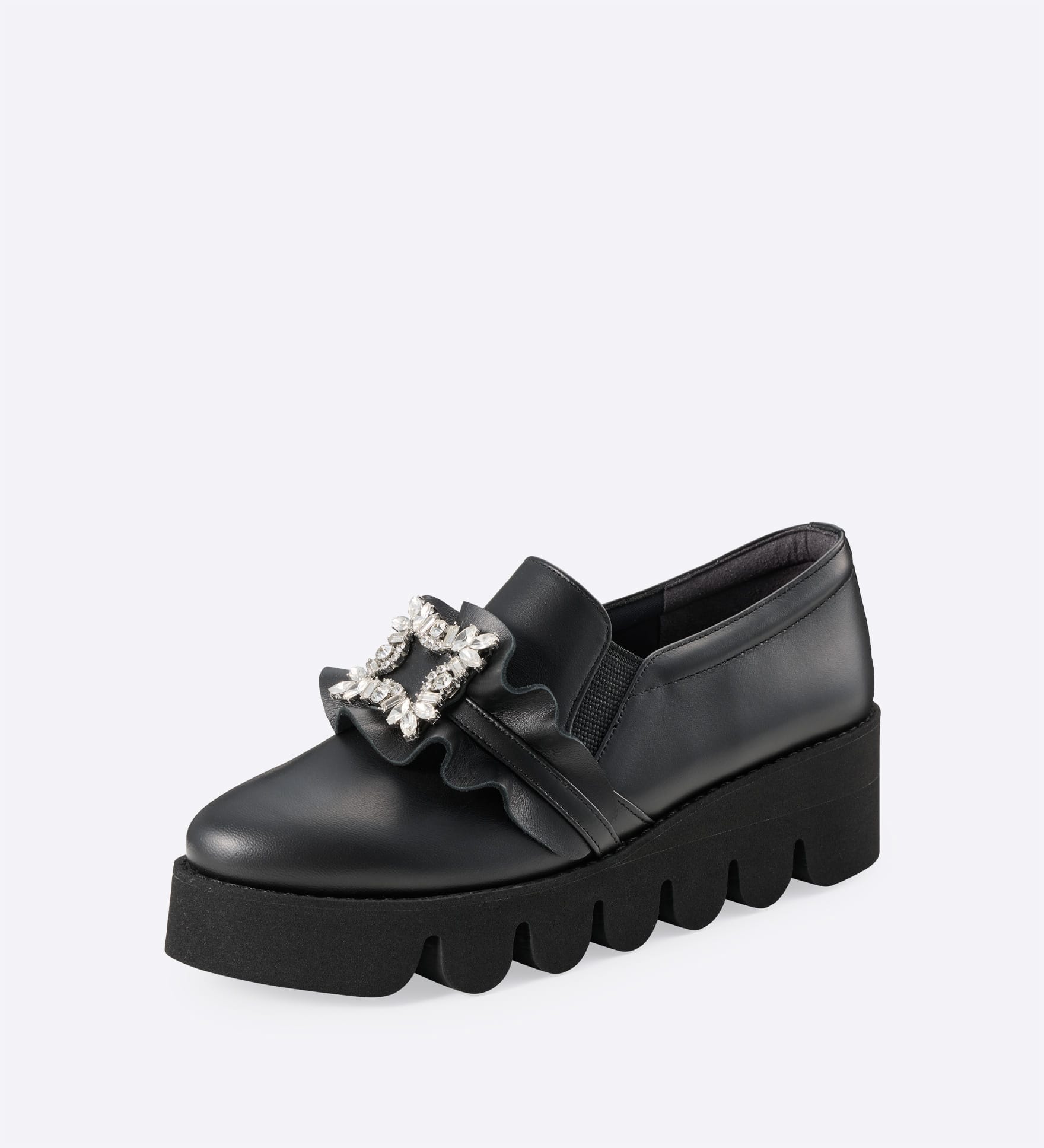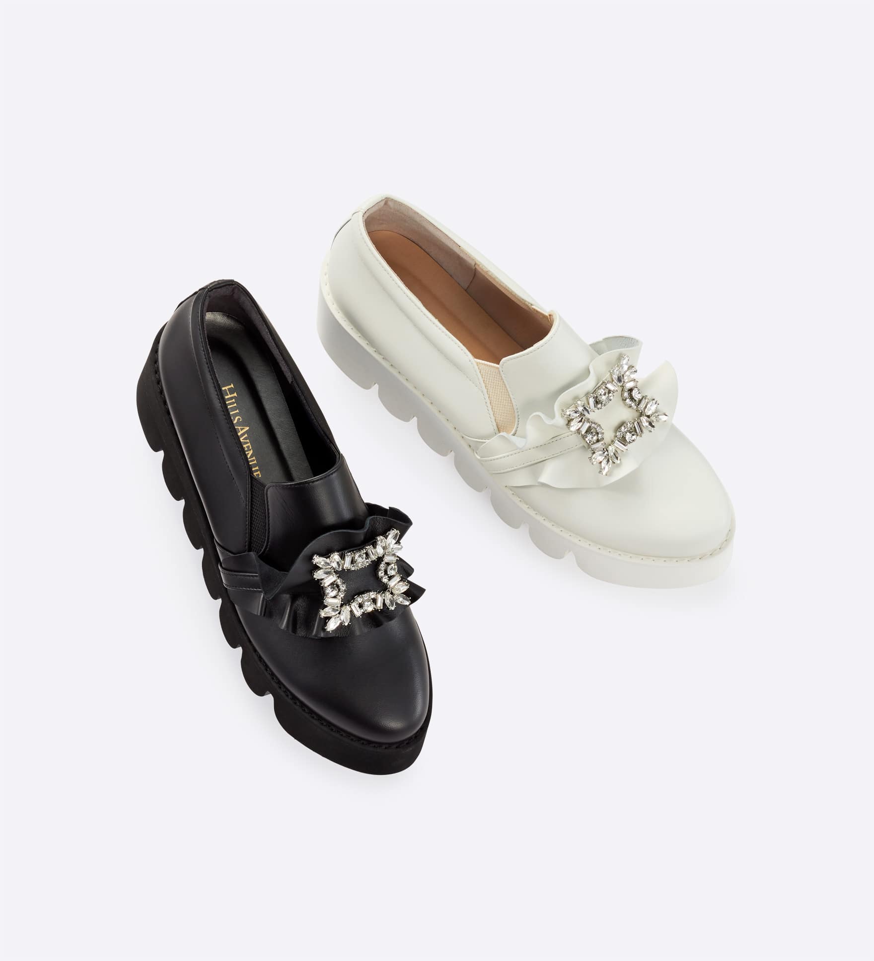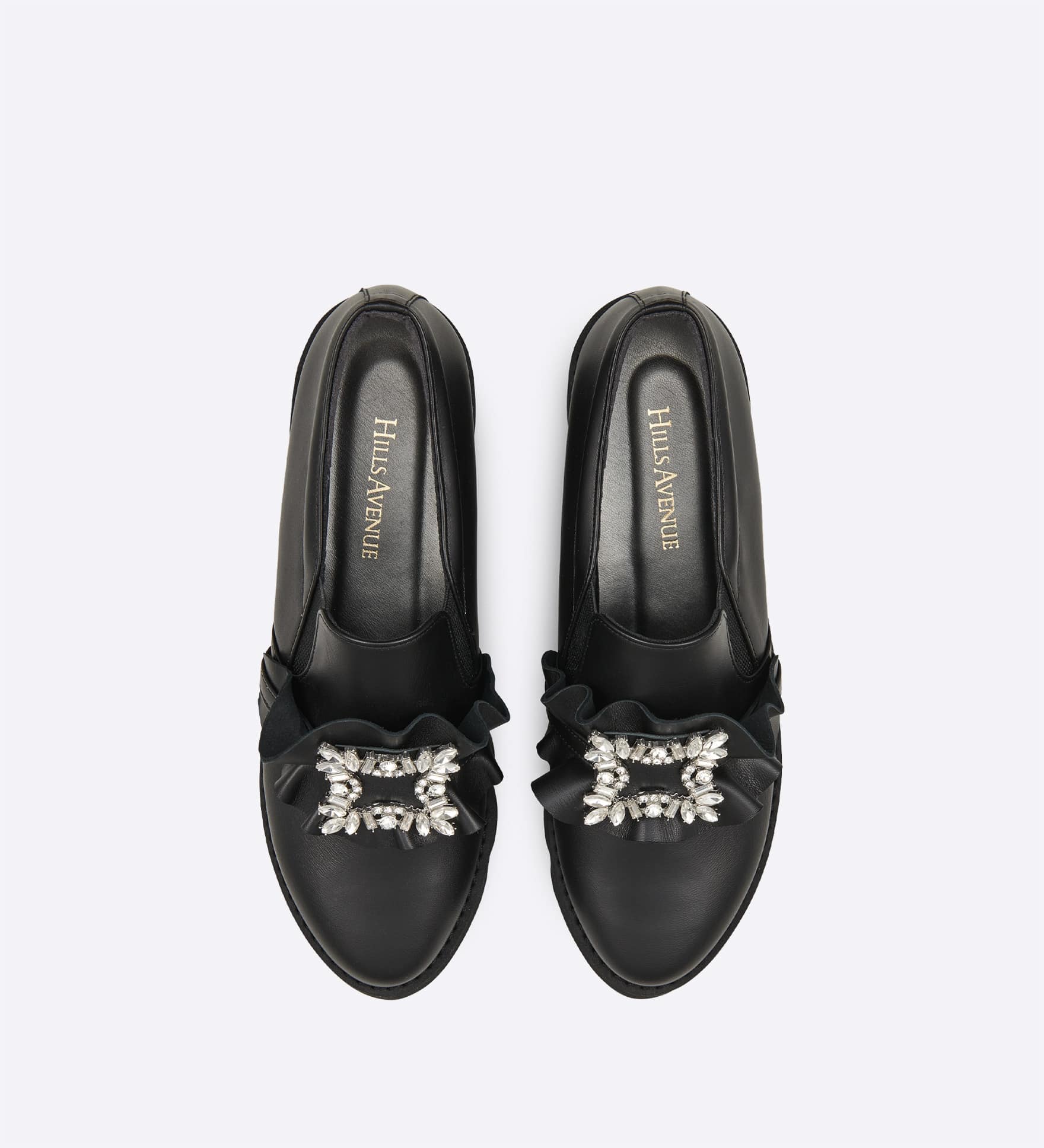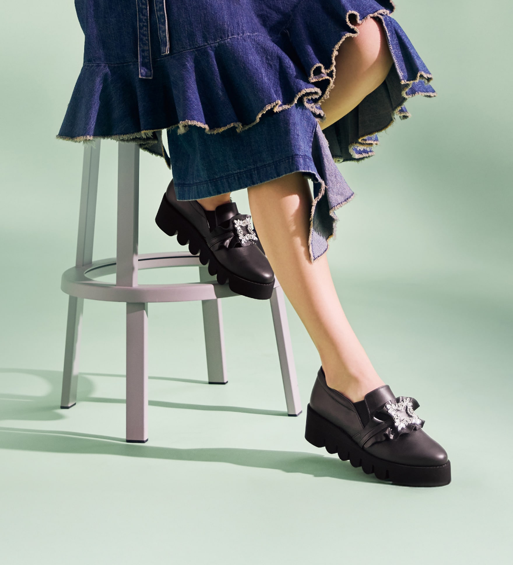 立体感のある本革フリルに、ビジューをあしらった存在感たっぷりのスリッポン。フリルは一つずつ丁寧に手作りされ、足元に上質な華やかさをプラスします。サイドゴム仕様で着脱しやすく、足に自然にフィット。軽量なEVAソールと甲裏まで施したインナースポンジで、見た目以上に快適な履き心地です。すっきりとしたアーモンドトゥで、甘さを抑えた大人の一足に仕上げました。