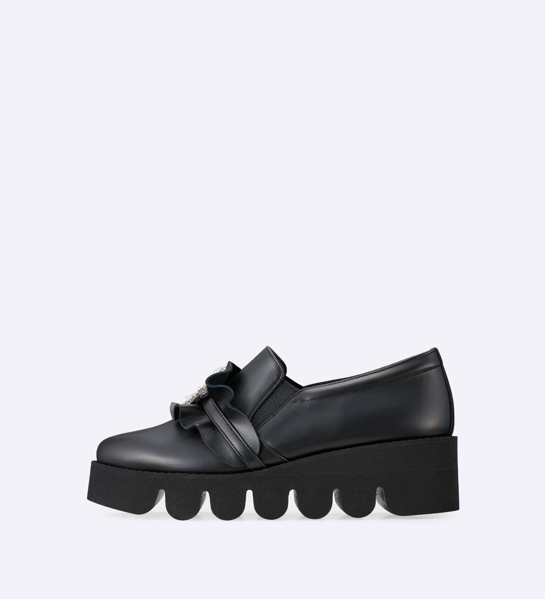 立体感のある本革フリルに、ビジューをあしらった存在感たっぷりのスリッポン。フリルは一つずつ丁寧に手作りされ、足元に上質な華やかさをプラスします。サイドゴム仕様で着脱しやすく、足に自然にフィット。軽量なEVAソールと甲裏まで施したインナースポンジで、見た目以上に快適な履き心地です。すっきりとしたアーモンドトゥで、甘さを抑えた大人の一足に仕上げました。