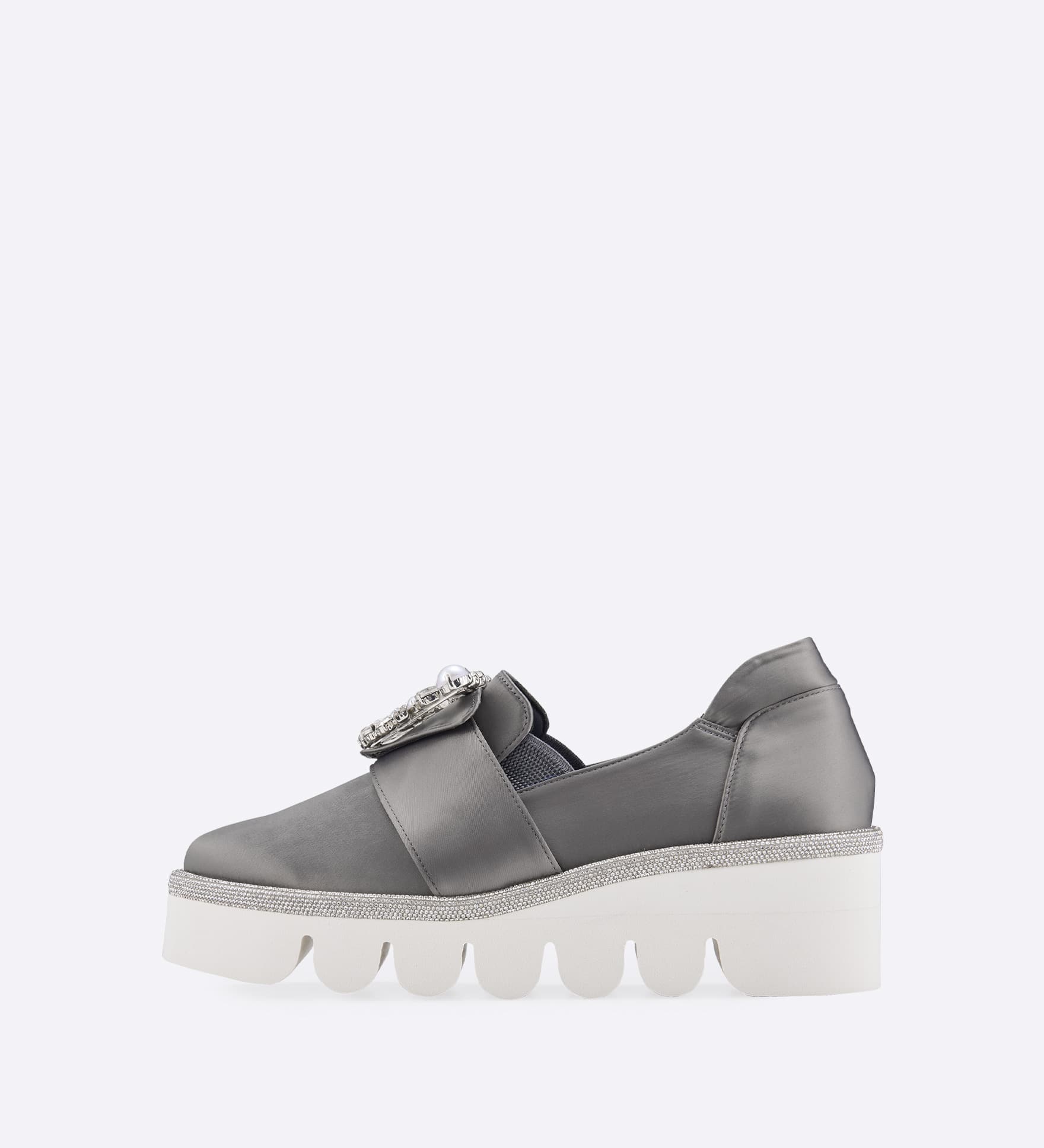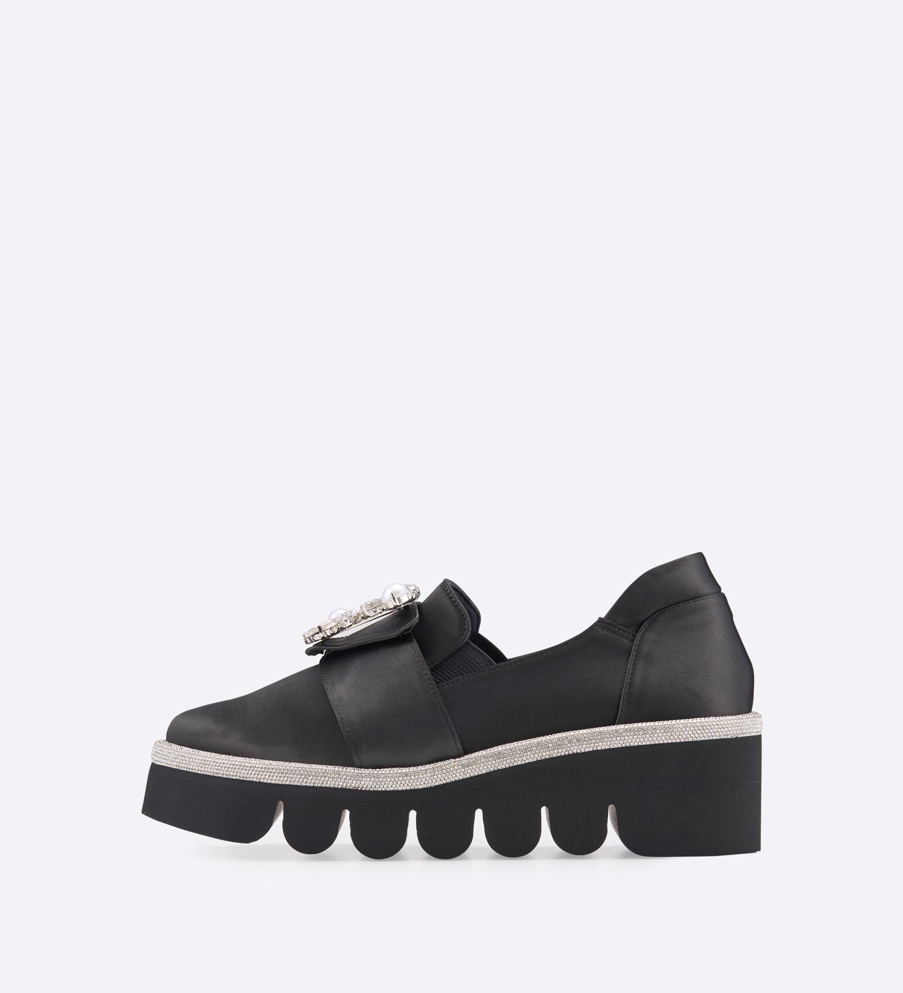 ストーンとパールをあしらった三角ビジュースリッポン。サテン調のストレッチ生地が足にやさしくフィットし、上品な艶感で足元をきれいに演出します。サイドゴム仕様で着脱しやすく、厚みのあるかかとスポンジと甲裏まで施したインナースポンジで、快適な履き心地を実現。ボリュームのあるEVAソールながら軽量で、すっきりとしたアーモンドトゥが落ち着いた印象に仕上げています。