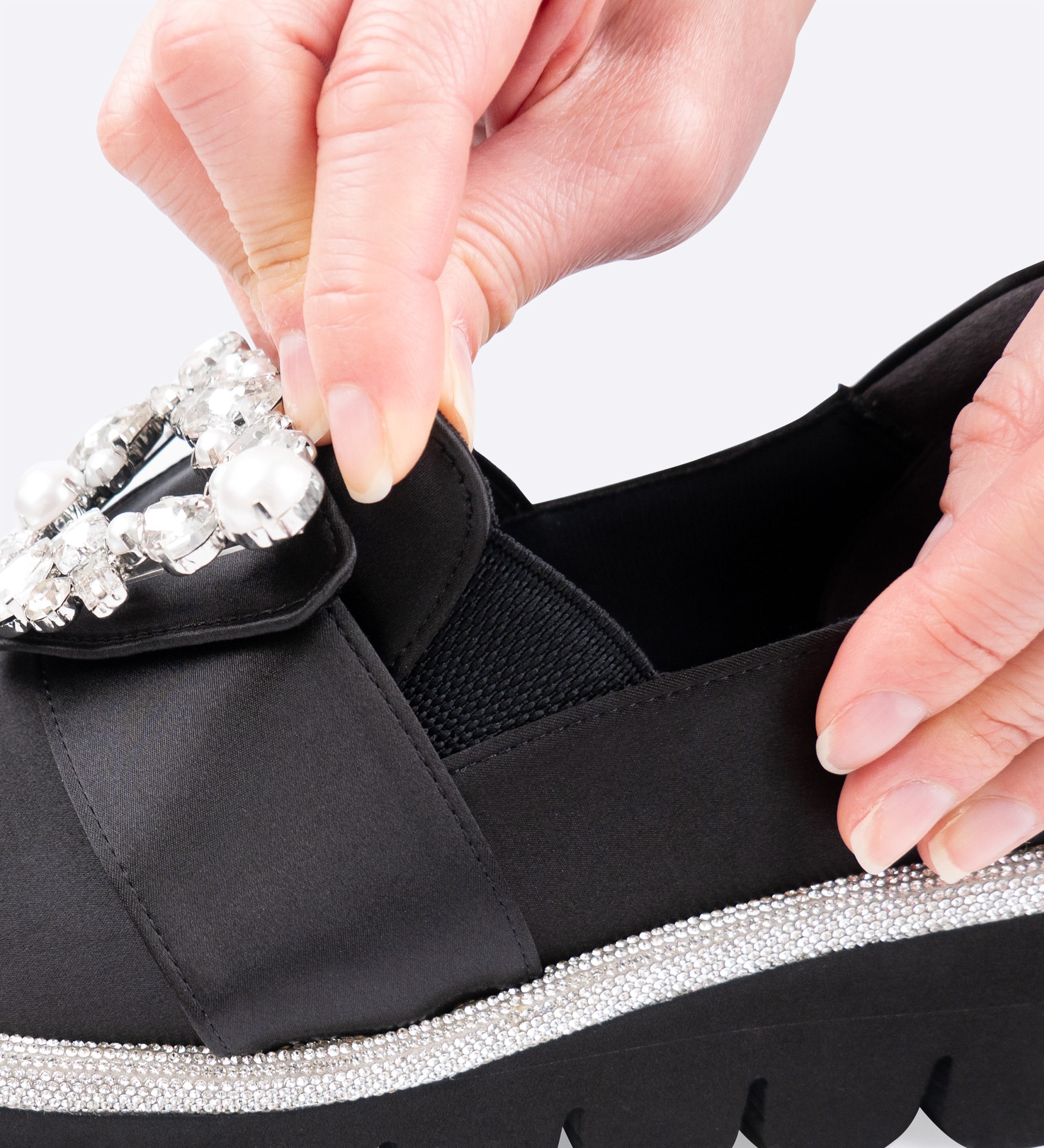 ストーンとパールをあしらった三角ビジュースリッポン。サテン調のストレッチ生地が足にやさしくフィットし、上品な艶感で足元をきれいに演出します。サイドゴム仕様で着脱しやすく、厚みのあるかかとスポンジと甲裏まで施したインナースポンジで、快適な履き心地を実現。ボリュームのあるEVAソールながら軽量で、すっきりとしたアーモンドトゥが落ち着いた印象に仕上げています。