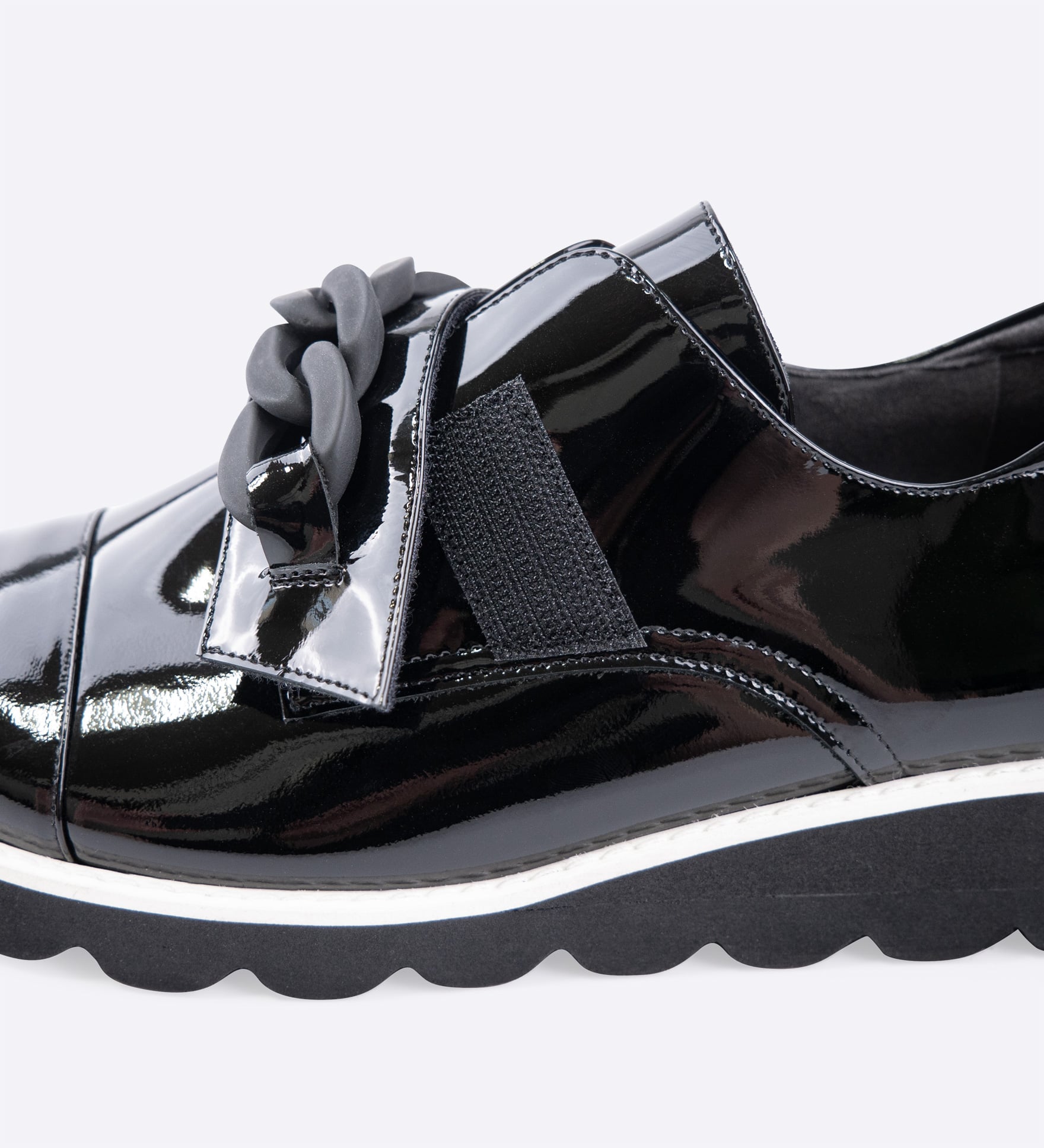 シンプルなベルトとチェーン風のアクセントベルト、気分や装いに合わせて付け替えられる2way仕様。ベーシックなデザインに遊び心をプラスできる一足です。落ち着いたトーンで、パンツにもスカートにも好相性。アーモンドトゥのすっきりとしたシルエットを、バイカラーソールが一層引き立てます。軽く、滑りにくいEVAソールを使用しています。