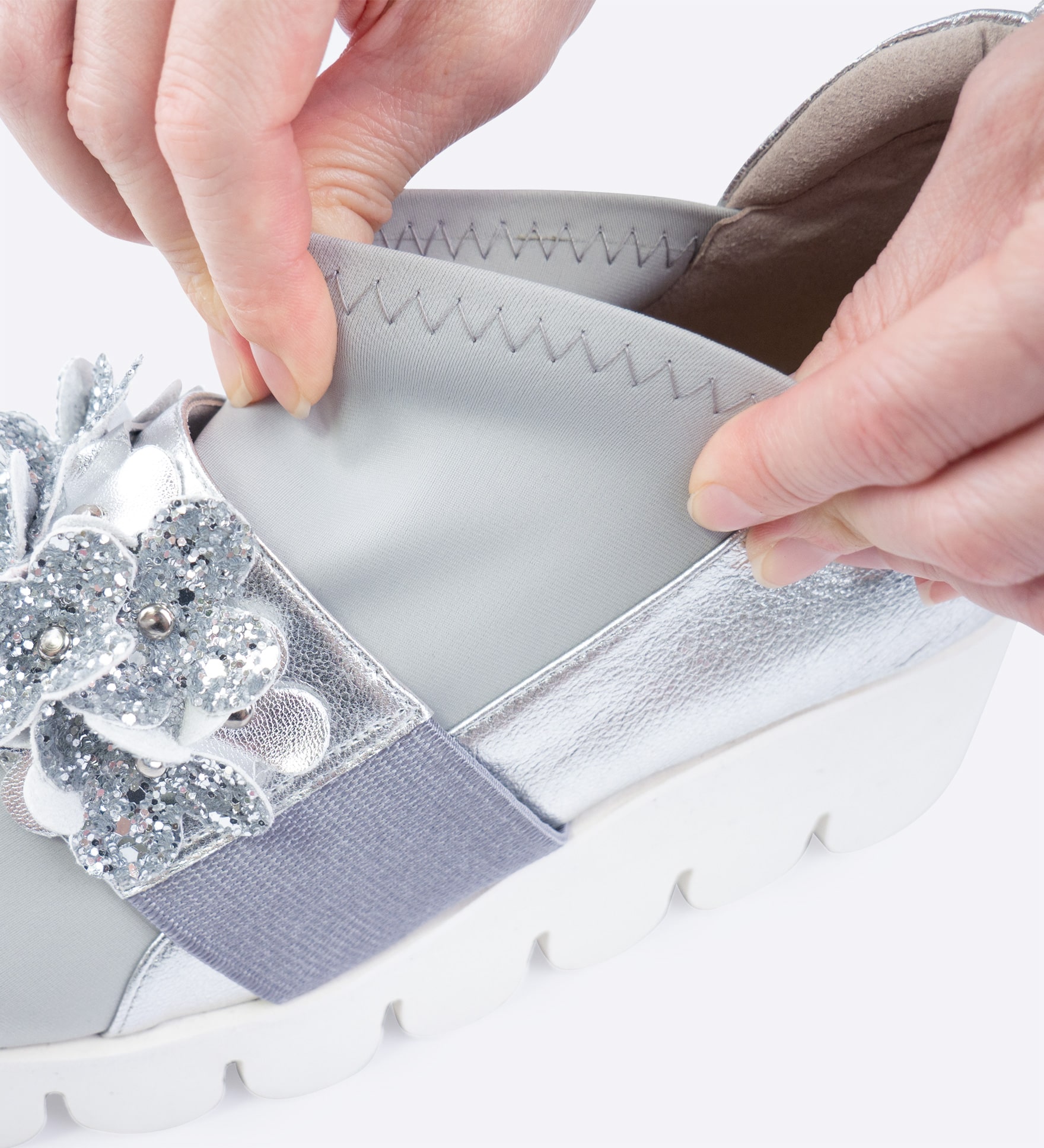 シルバー:ストレッチ素材、ゴート革型押し