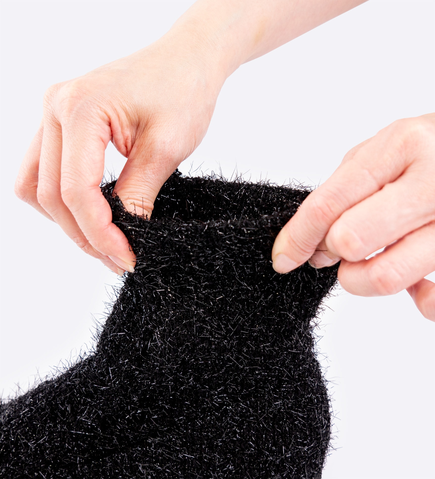 ファーのように毛足の長いラメ素材が足元に華やかさと個性を添える、モードなストレッチブーツ。柔らかな素材感が足首までやさしくフィットし、すっきりとしたラインを描きます。シンプルなコーディネートのアクセントとして取り入れやすく、デイリーから特別なシーンまで活躍します。滑りにくいEVAソールは厚底でありながら驚くほど軽く、安定感があります。