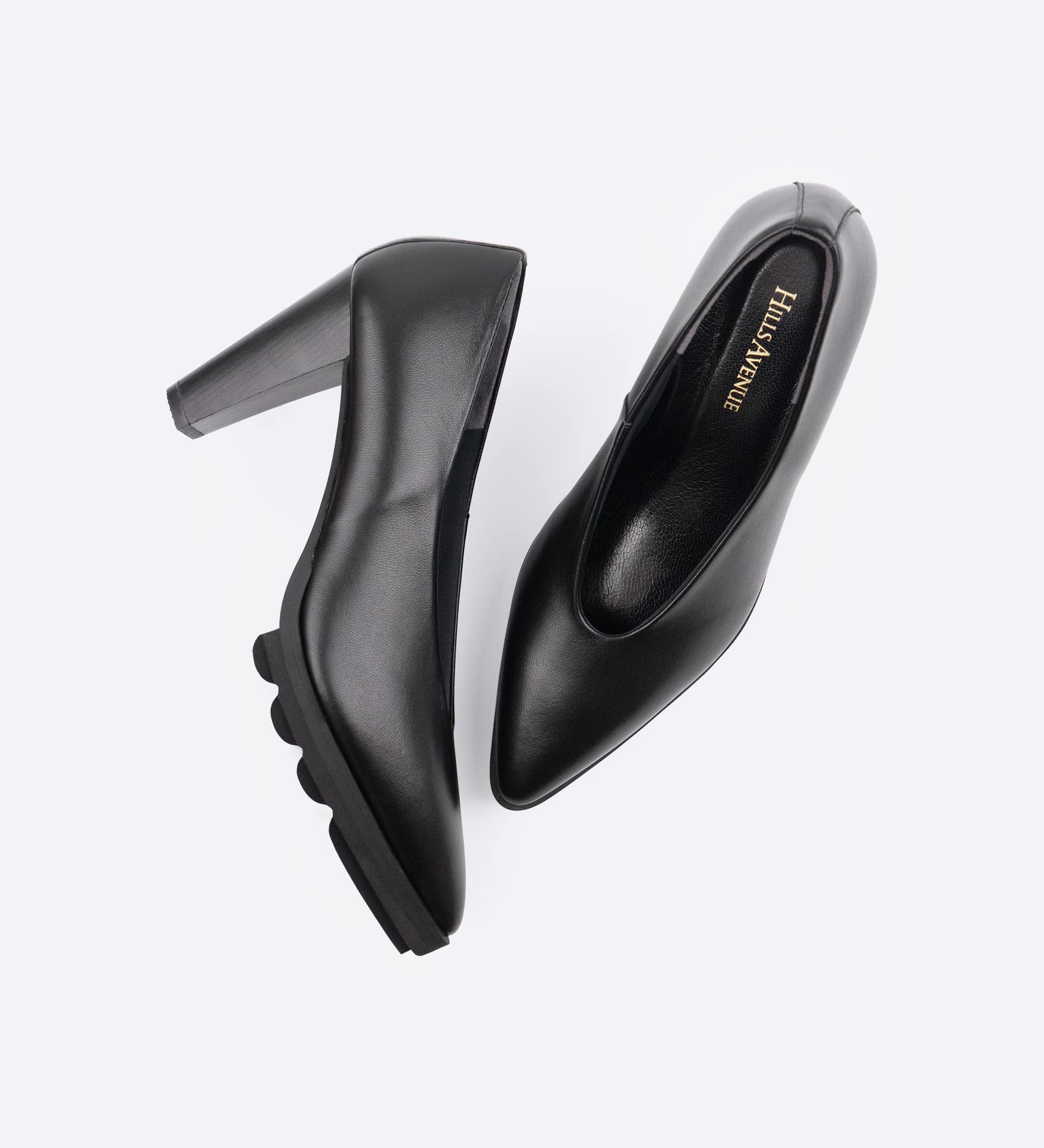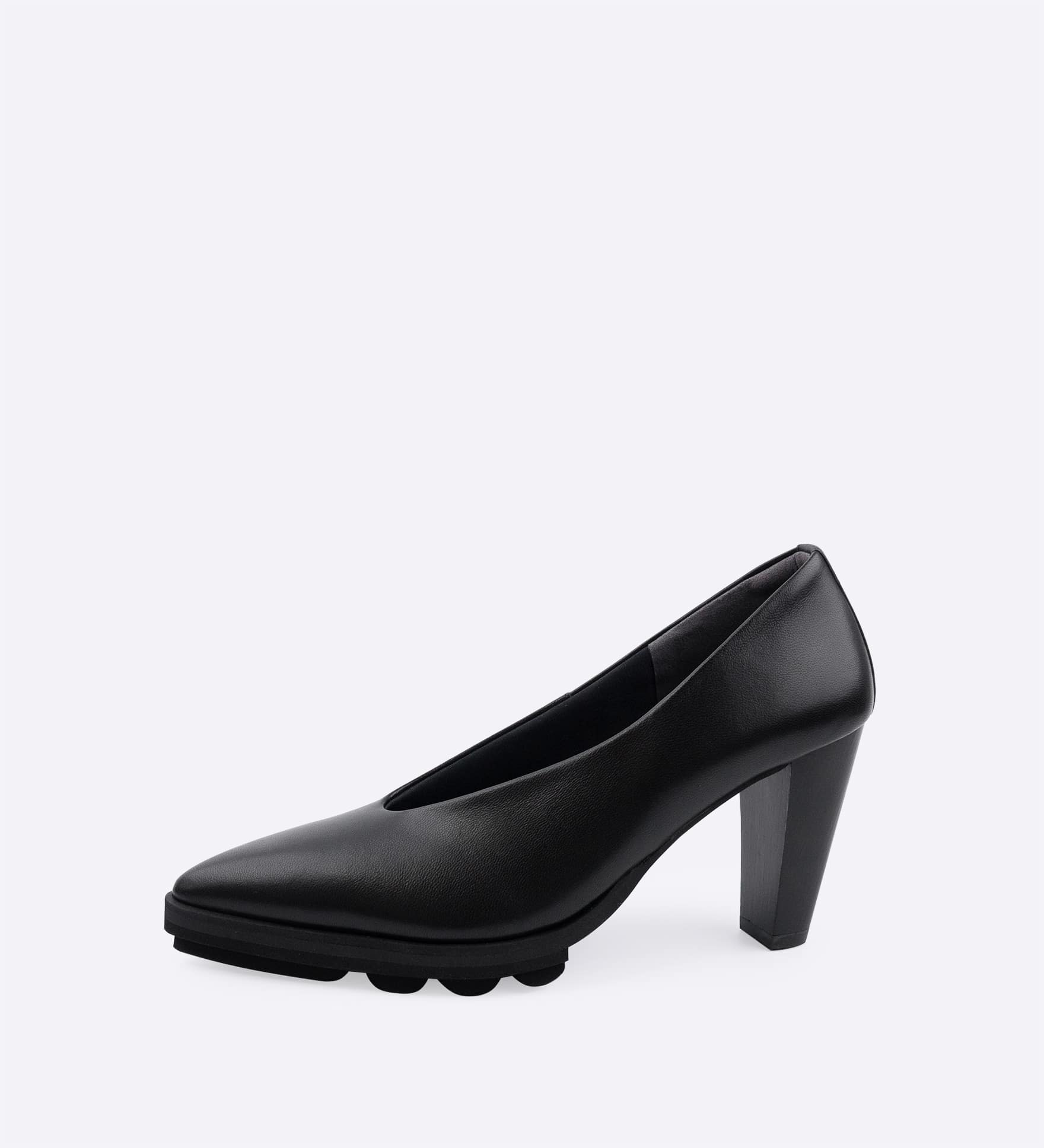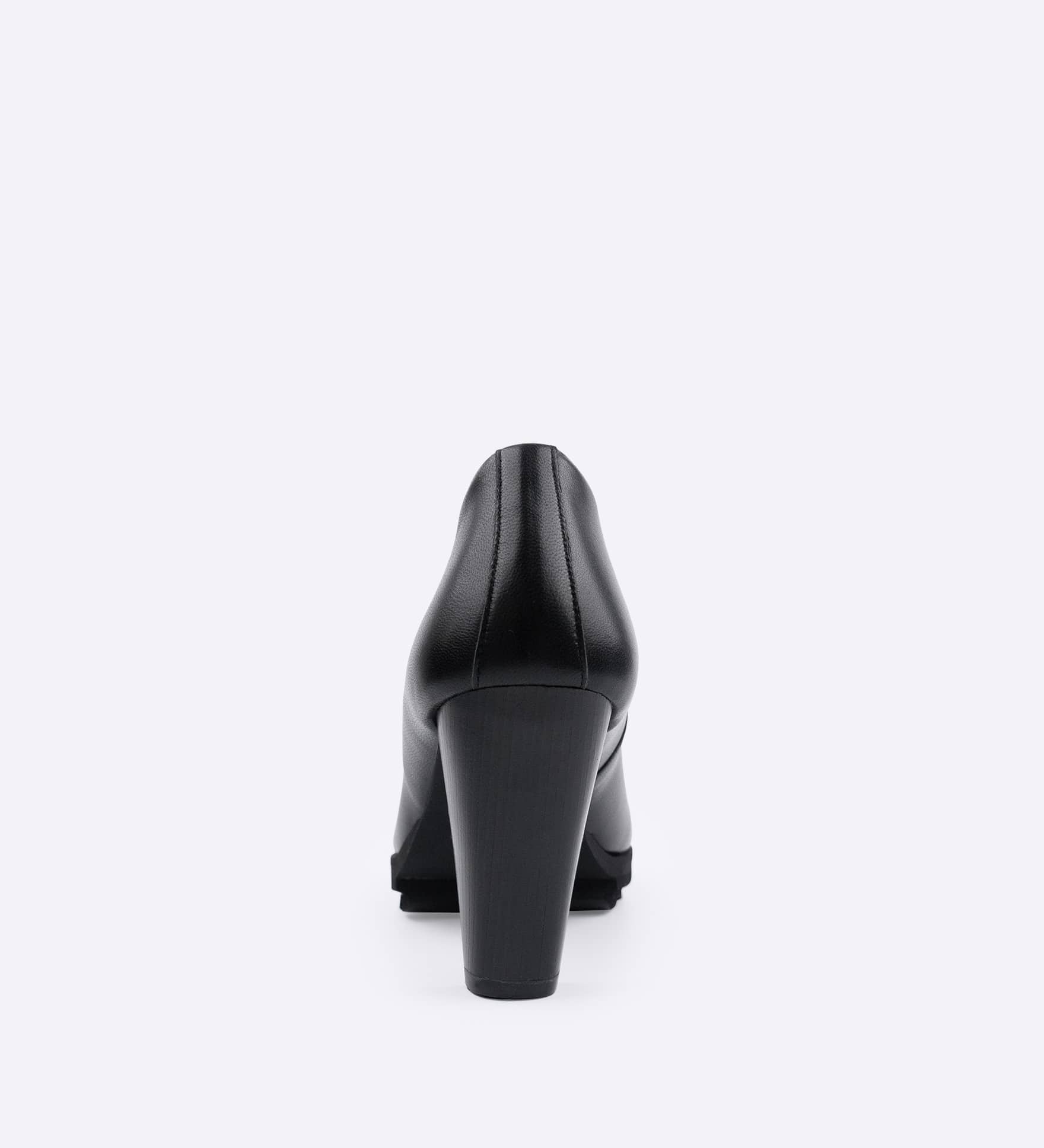8.5cmヒールが美しいシルエットを描き、黒木目調のスタックヒールが落ち着きのある印象を添えます。