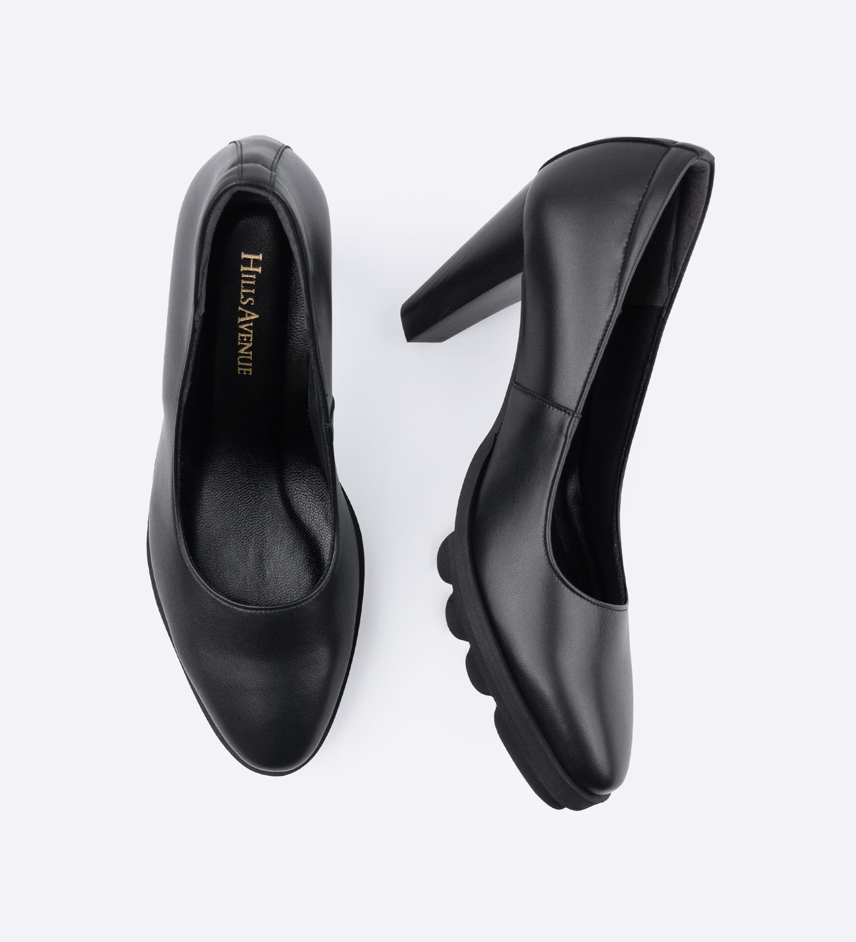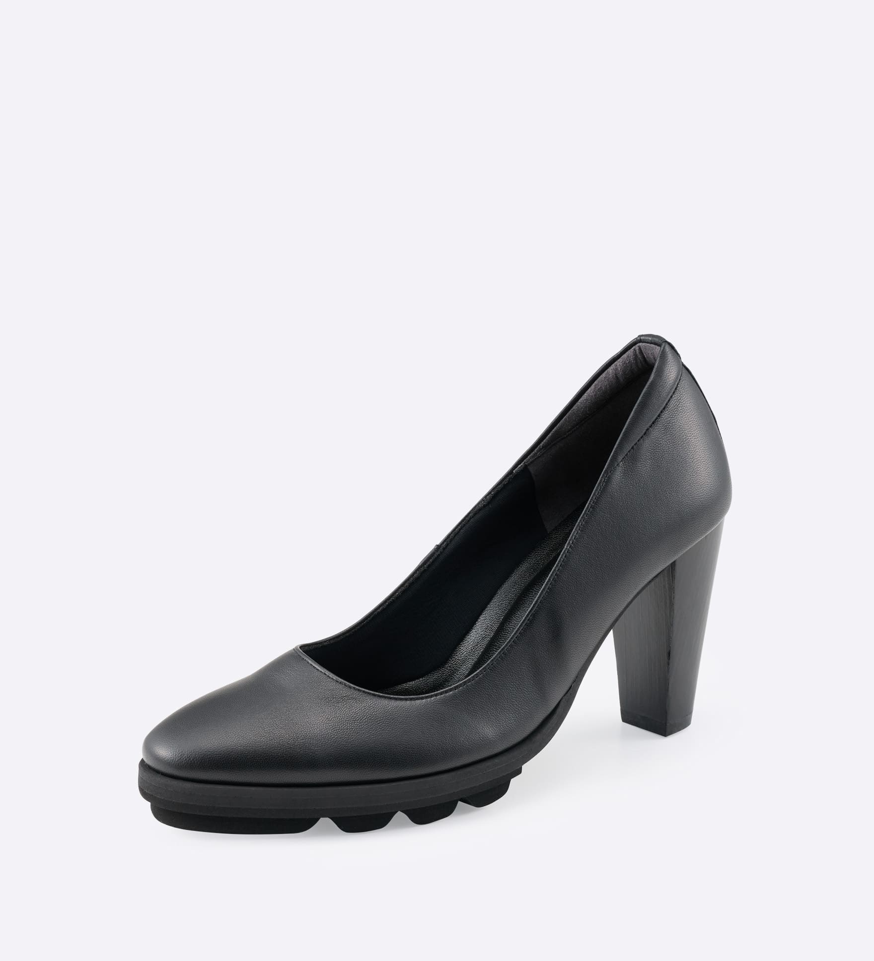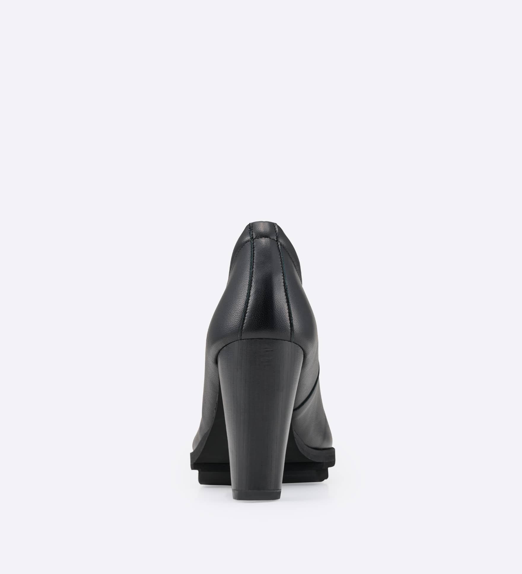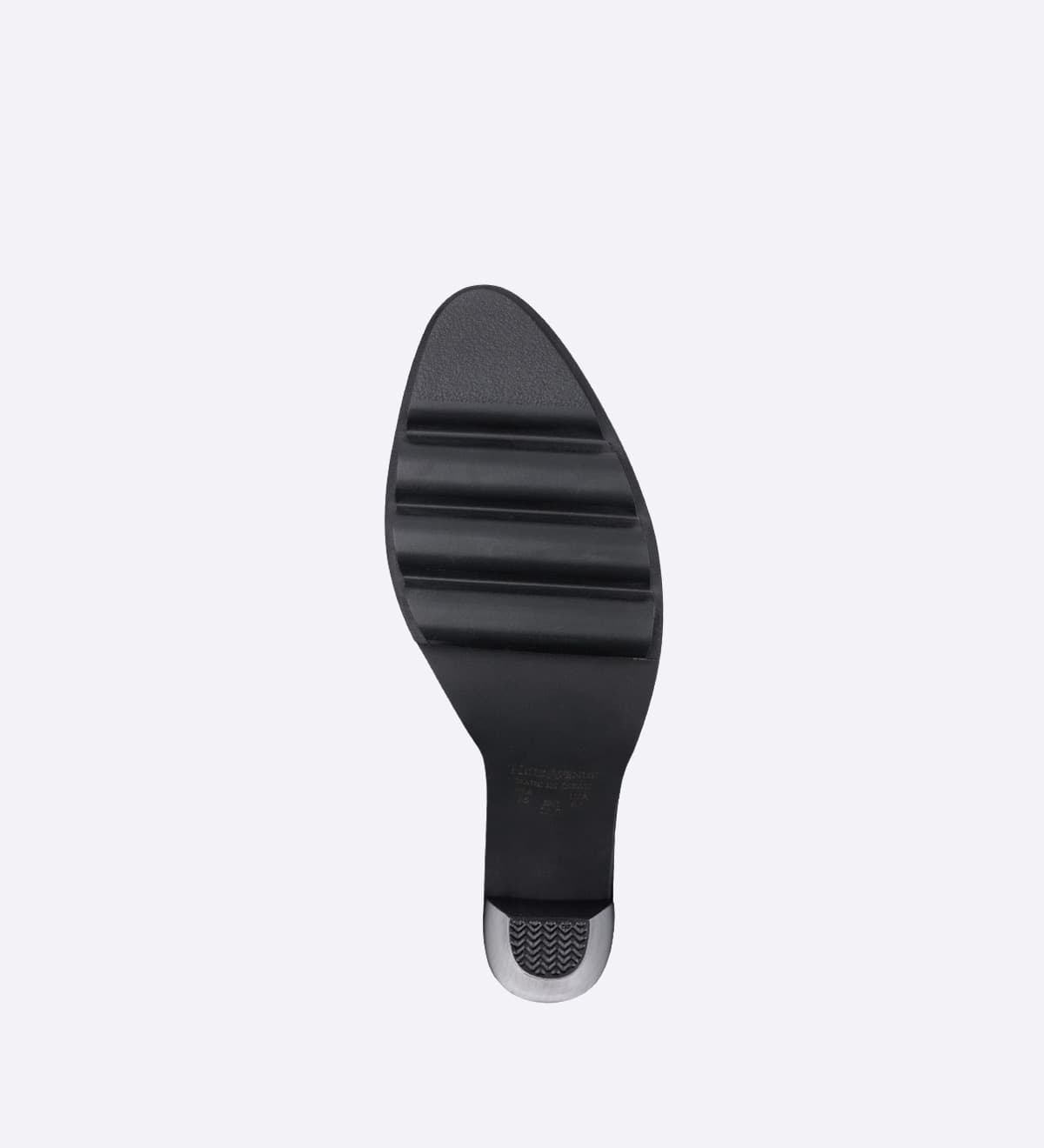 8.5cmヒールが描く端正なシルエットに、黒木目調のスタックヒールが落ち着いた印象を添えます。