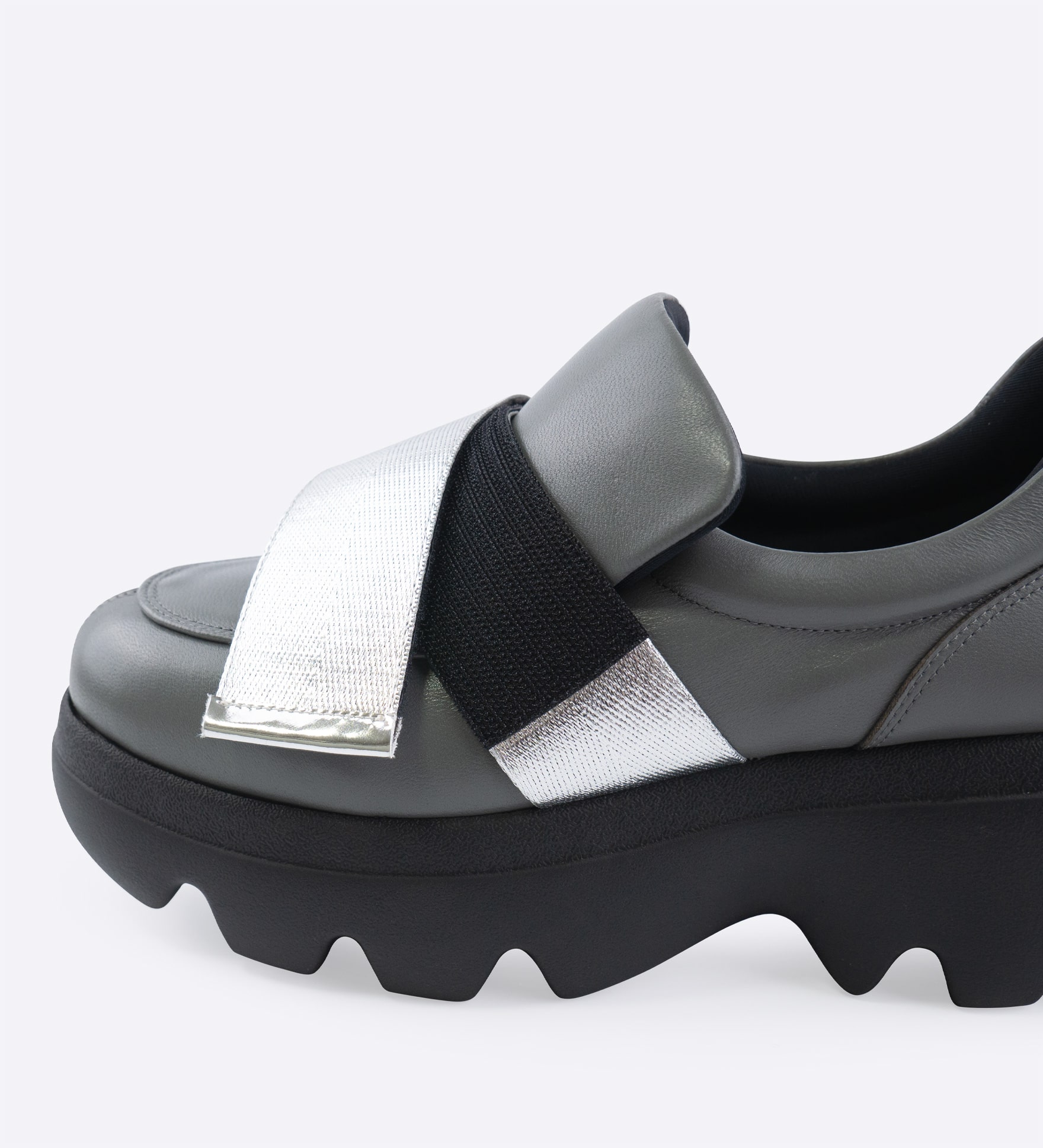 メタリック調のワイドベルトが目を引くスリッポン。面ファスナー仕様で着脱しやすく、見た目だけでなく実用性にも優れています。ソフトなアッパーとインナースポンジが足をやさしく包み込み、ボリュームのあるソールは驚くほど軽い履き心地です。