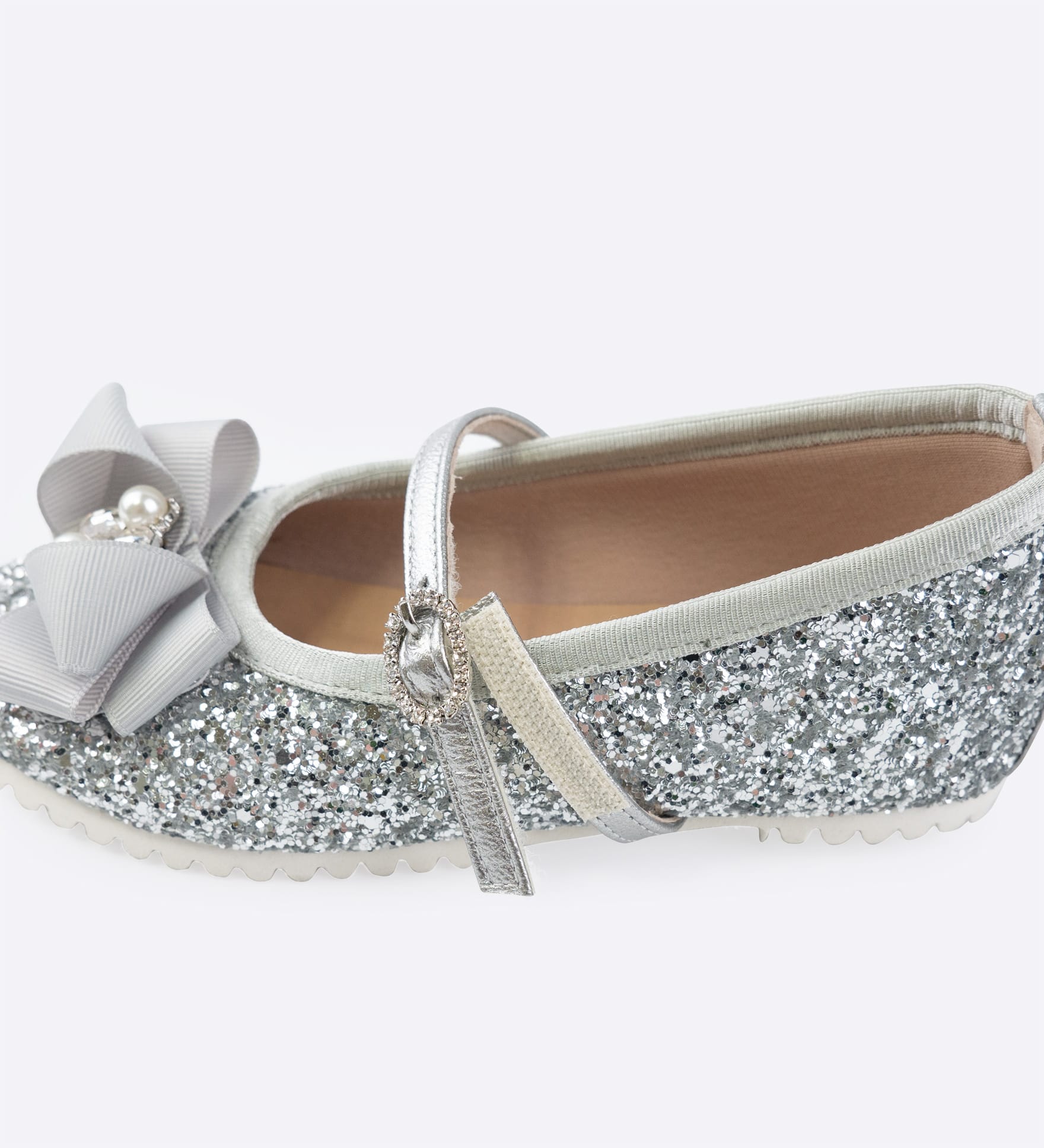グリッター素材にリボンとパールビジューをあしらいました。足首のストラップがしっかりとホールドし、元気に動くお子さまの足元をサポートします。アッパーには柔らかいインナースポンジを施し、クッション性のある中敷とEVAアウトソールを使用しています。大人向けデザインも展開していますので、お揃いで履いていただくこともおすすめです。
