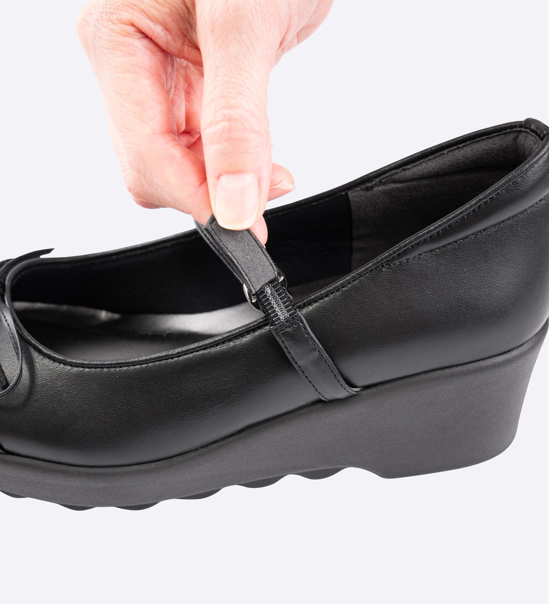 細いストラップとビット金具、小さなリボンをアクセントに添えました。クラシカルな佇まいの中にフェミニンさを感じさせ、きちんと感のあるスタイルにもやわらかさを添えます。アッパーに施したインナースポンジがやさしく足にフィットし、クッション性とグリップ力に優れた「スマートウェーブソール」を採用。すっきりとしたシルエットでありながら、ゆったりとした履き心地が魅力です。