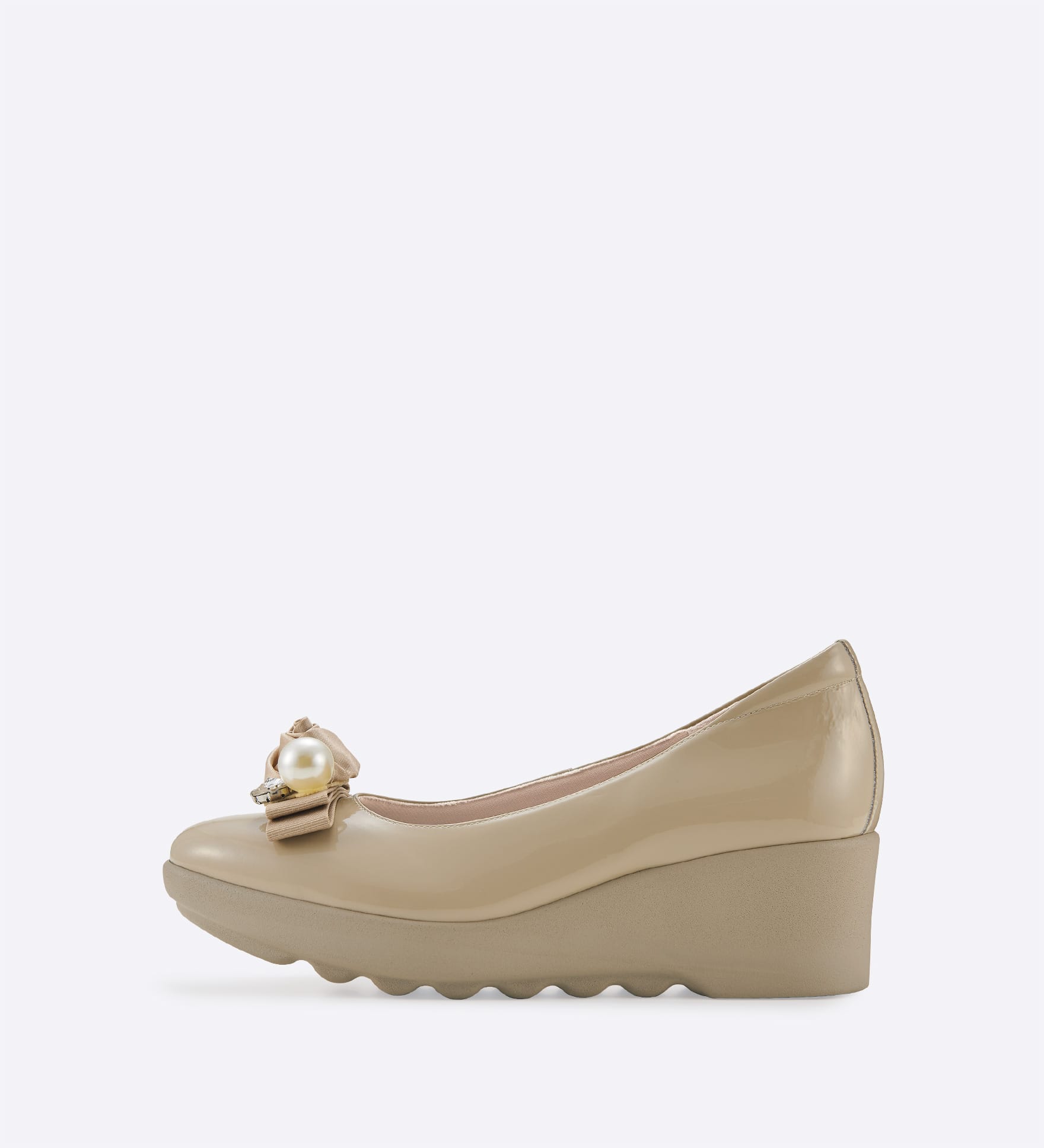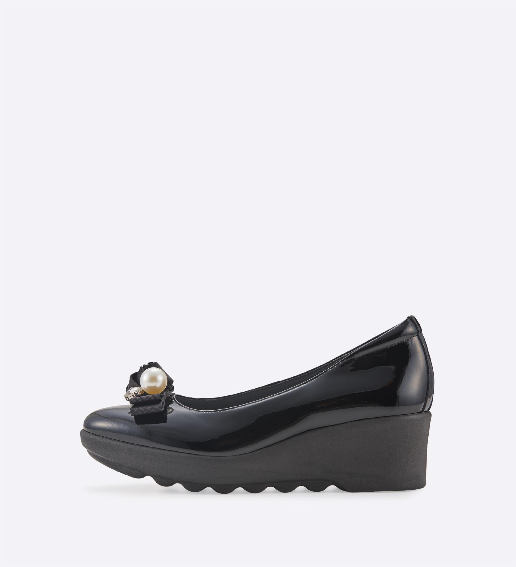 艶やかなエナメル素材に、立体感のあるローズモチーフとパール、ビジューをあしらいました。リボンの上に咲く花のような装飾が、足元に上品な華やかさを添えます。パーティーシーンにも、日常に少しの特別感を加えたい時にも活躍する一足です。アッパーに施したインナースポンジがやさしく足にフィットし、クッション性とグリップ力に優れた「スマートウェーブソール」を採用。すっきりとしたシルエットでありながら、ゆったりとした履き心地が魅力です。