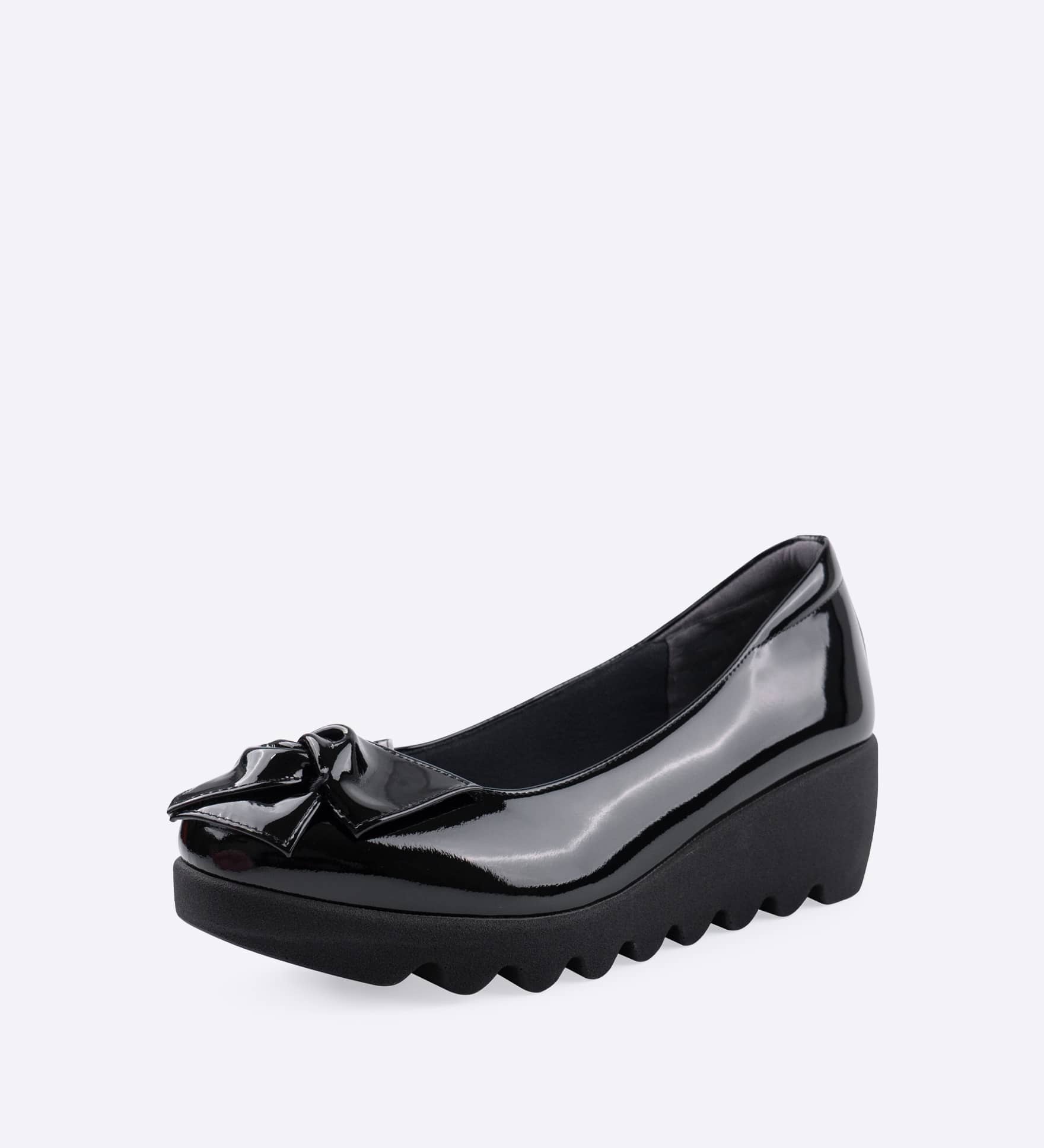 キュッと絞ったつぼみリボンのパンプス。アッパーに施されたインナースポンジで足あたりがよく、屈曲性とグリップ力に優れた「ウェーブソール」を採用しています。