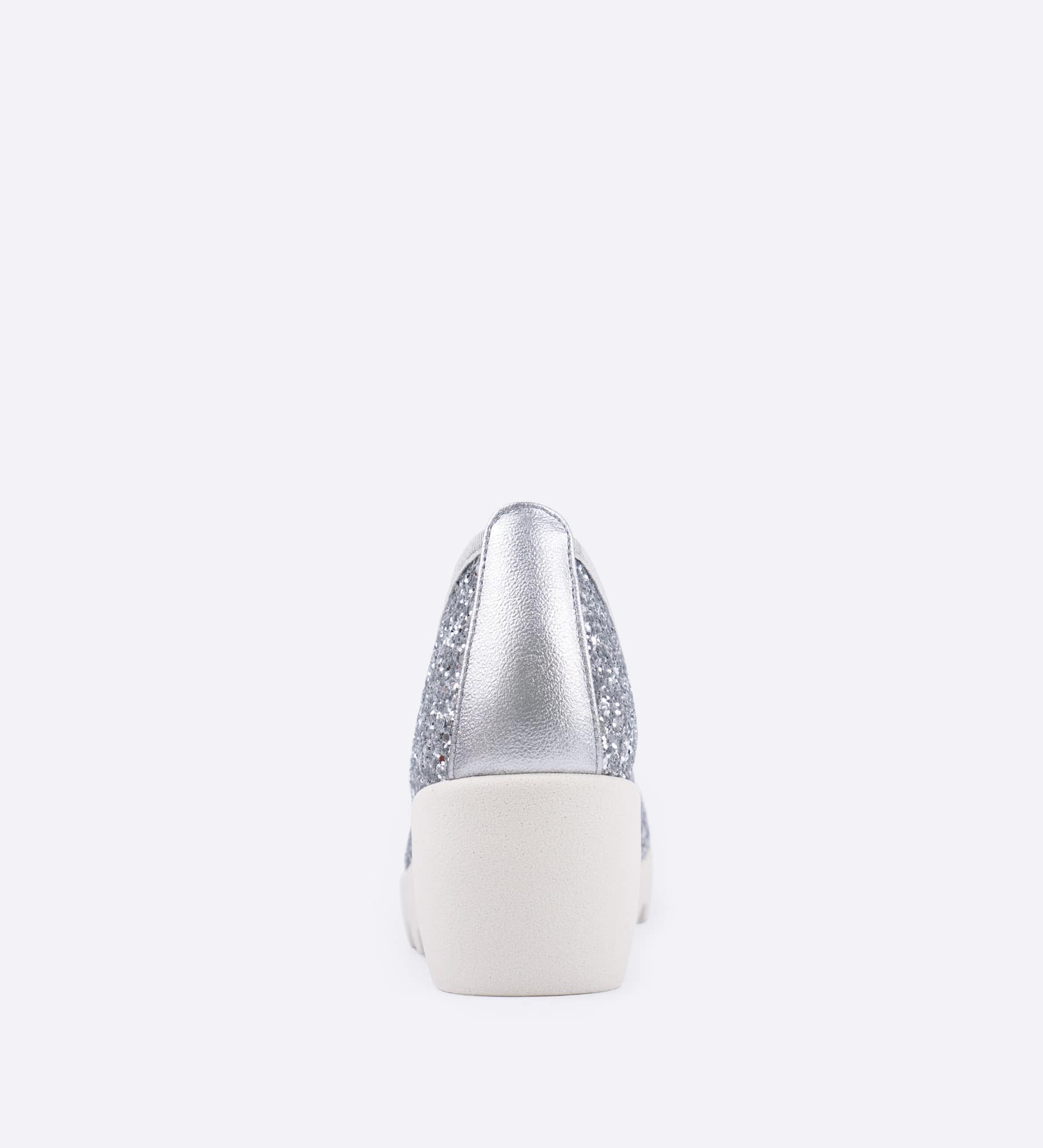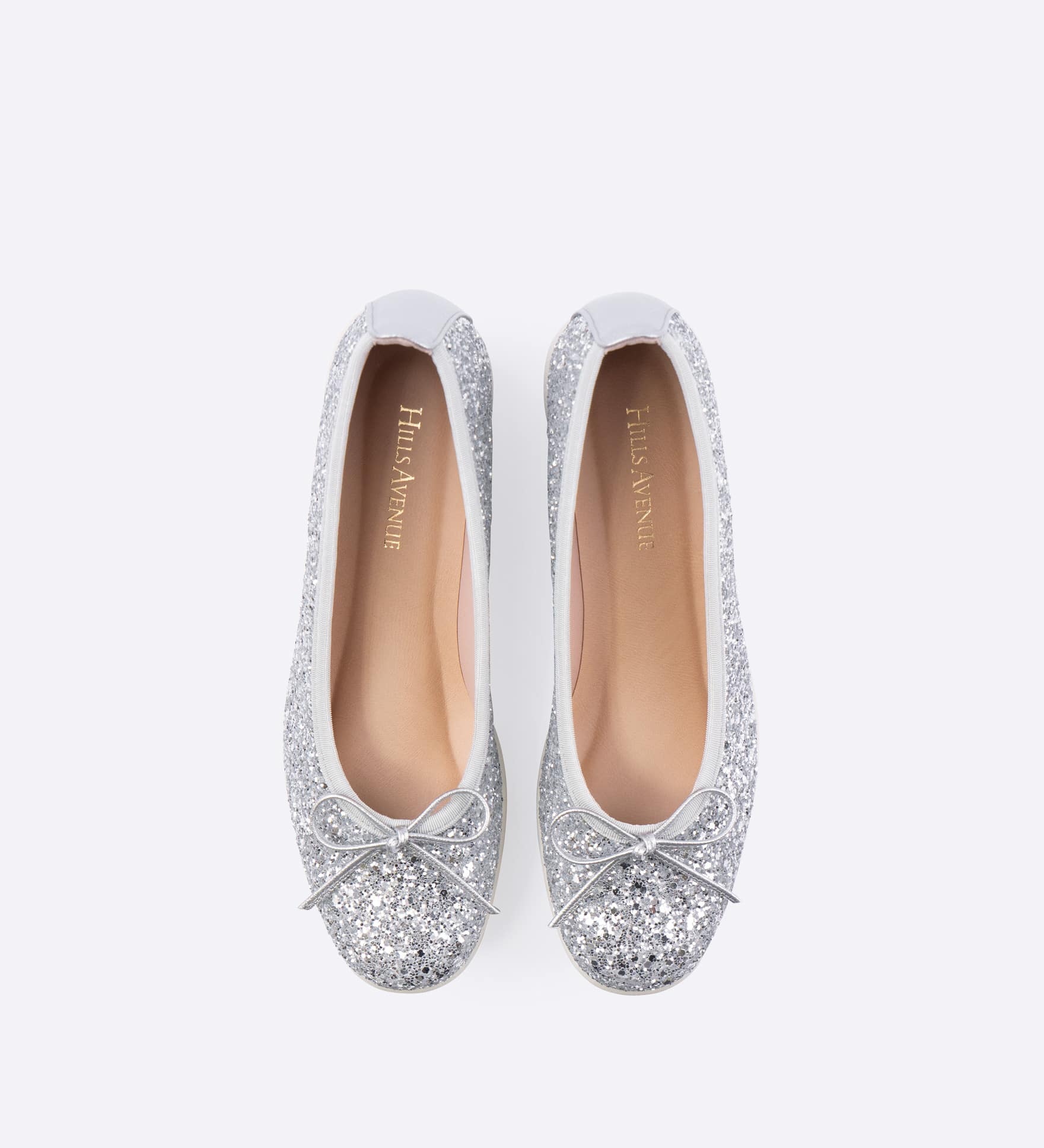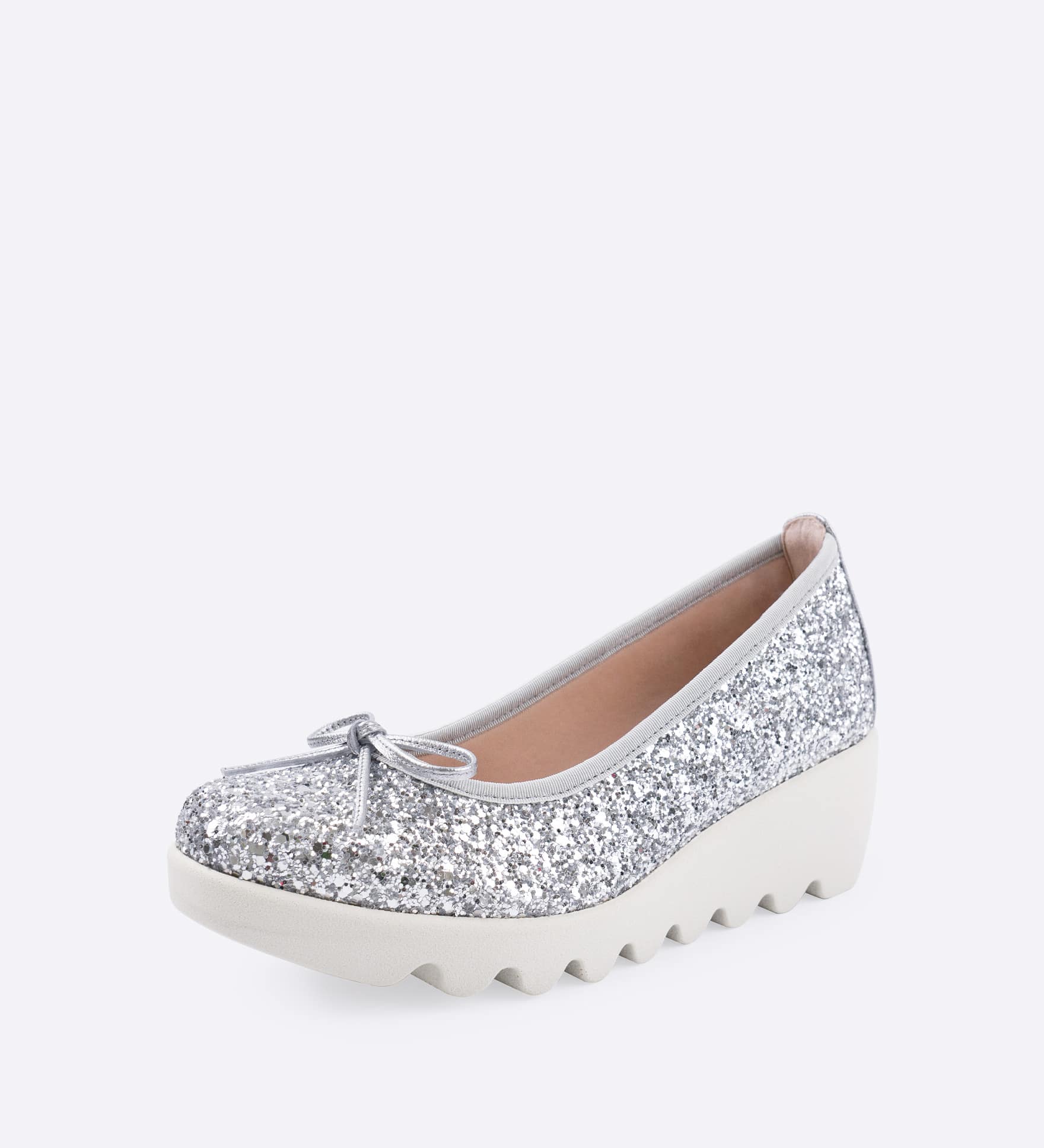 大小ランダムのグリッターが華やかに輝く、フェミニンなリボンパンプス。ウェーブソールを採用し、安定感のある履き心地とすっきりとしたフォルムを両立しました。履き口にはゴムテープを使用し、足にやさしくフィット。内側にはウレタンを施し、長時間でも快適です。親子でお揃いも楽しめる、遊び心のある一足。