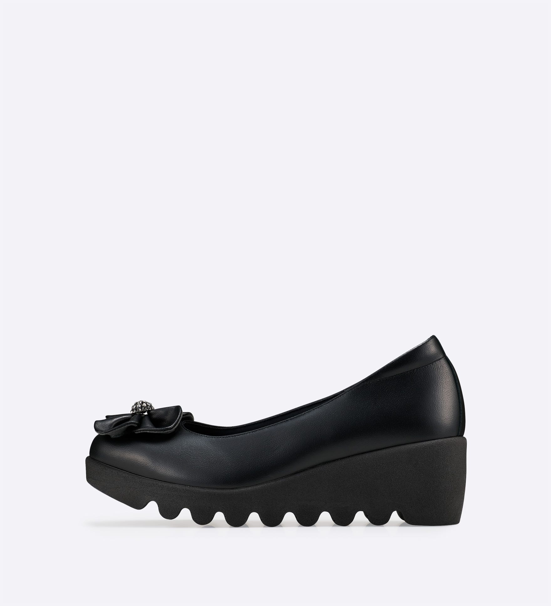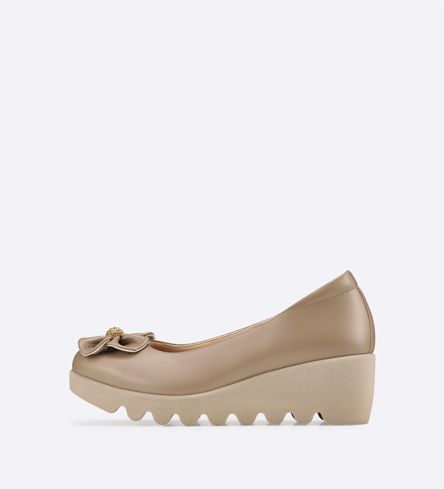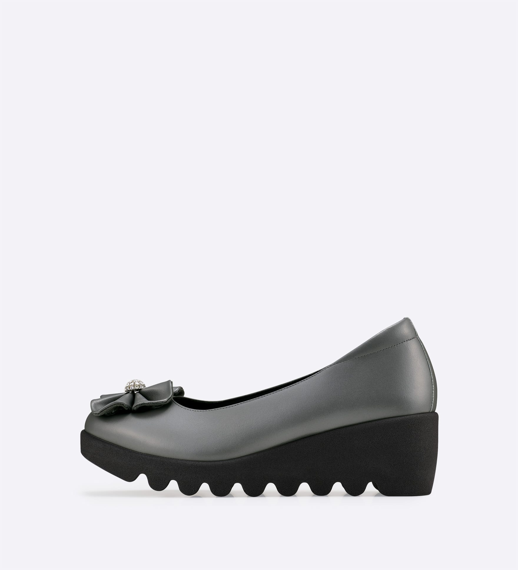 柔らかいスムースレザーに、小さなビジューをあしらった、立体感のあるフラワーモチーフを添えて仕上げました。アッパーに施したインナースポンジがやさしく足にフィットし、屈曲性とグリップ力に優れた「ウェーブソール」が、快適な歩行をサポートします。