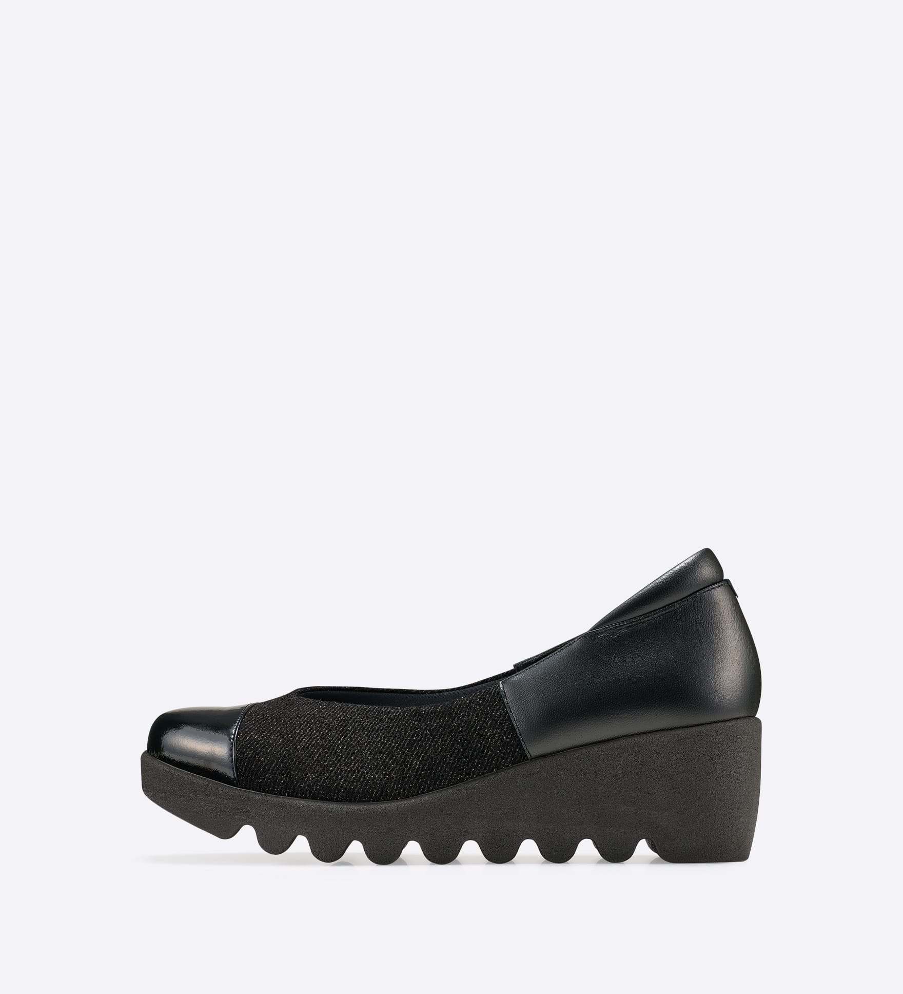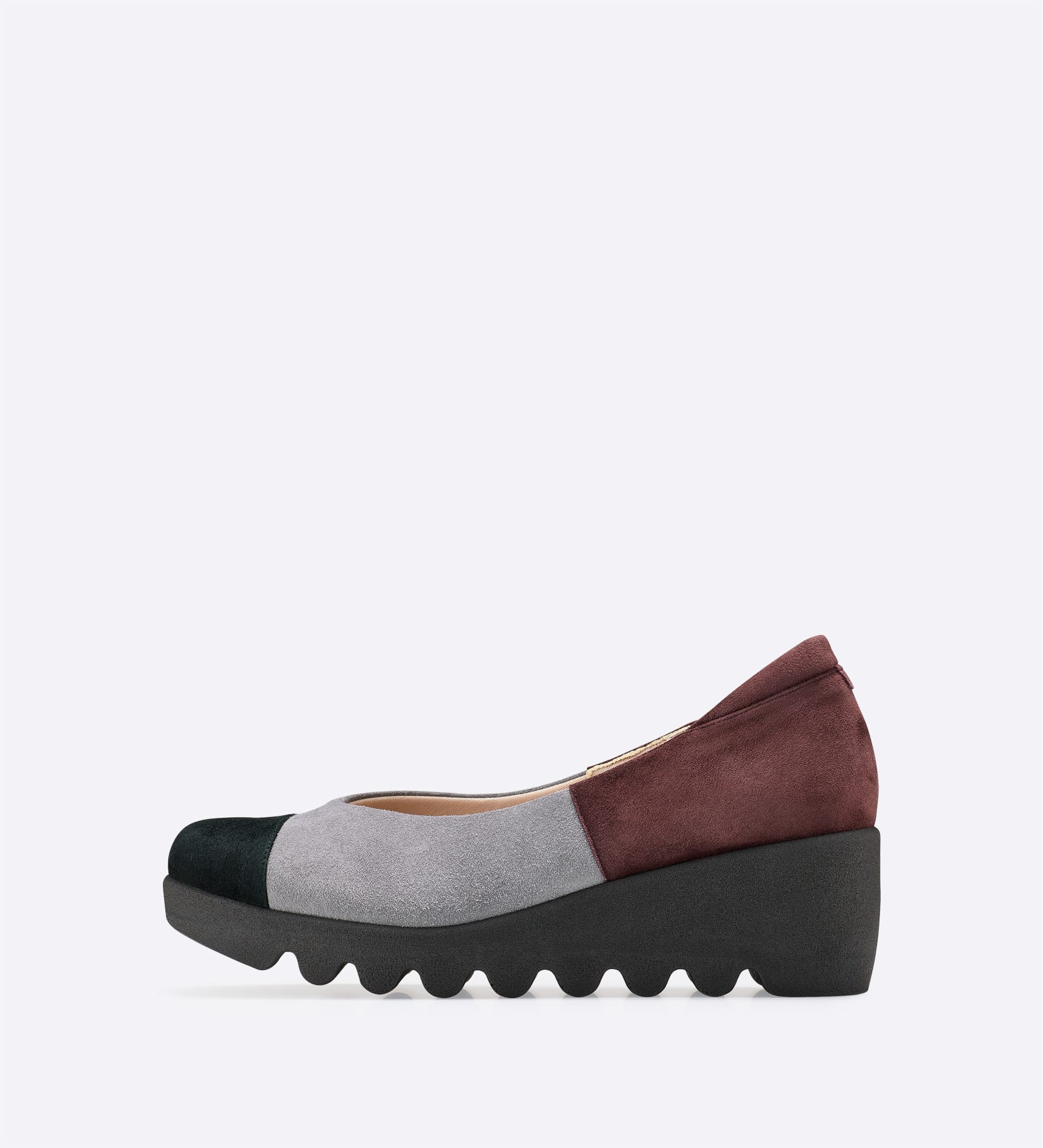異素材や異カラーを巧みに切り替え、モダンな印象を演出するパンプスに仕上げました。Uカットの履き口が足を綺麗に見せるとともに、安定感も与えます。アッパーに施したインナースポンジがやさしく足にフィットし、屈曲性とグリップ力に優れた「ウェーブソール」が、快適な歩行をサポートします。