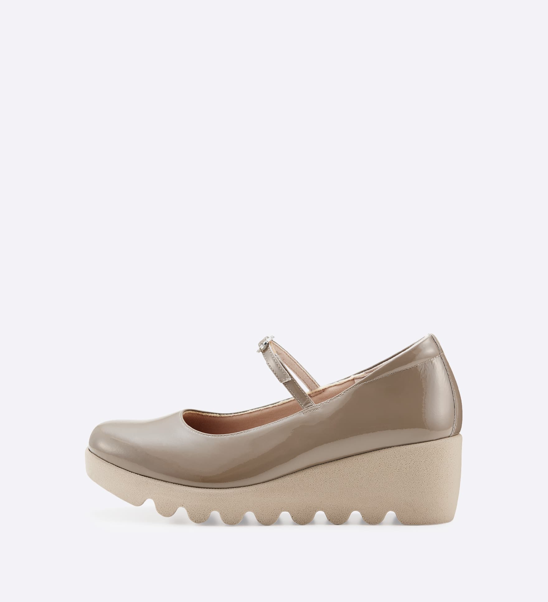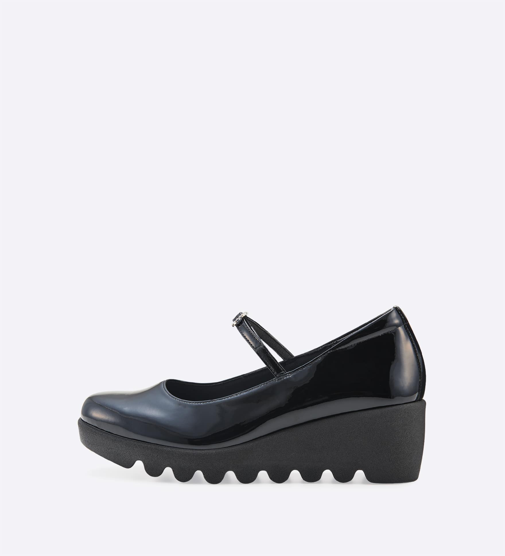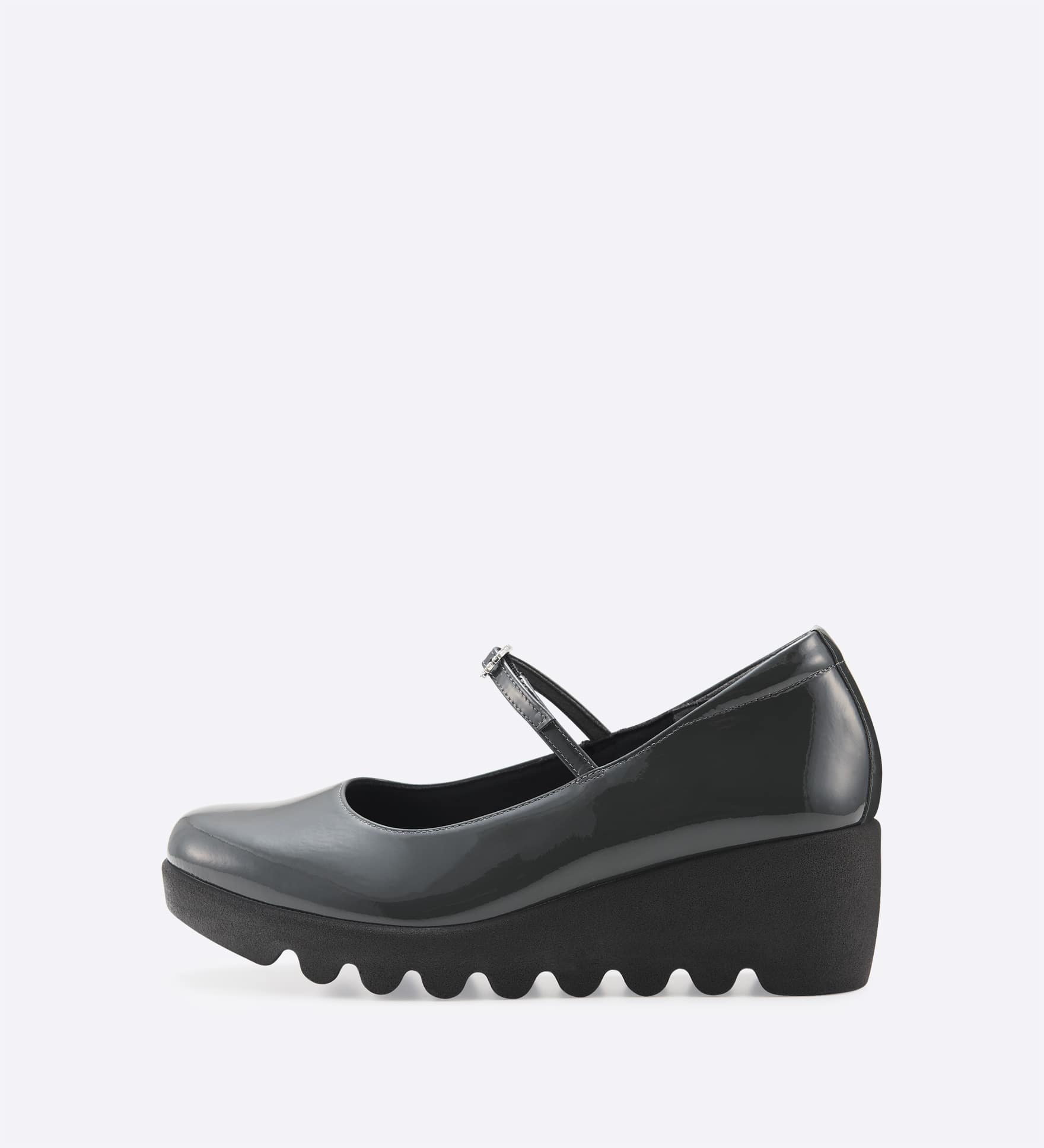 艶やかなエナメル素材に、煌めくビジュー付きストラップを配し、華やぎを添えるメリージェーンに仕上げました。クラシカルな佇まいながら、日常にも馴染む気品ある一足です。アッパーに施したインナースポンジがやさしく足にフィットし、屈曲性とグリップ力に優れた「ウェーブソール」が、快適な歩行をサポートします。