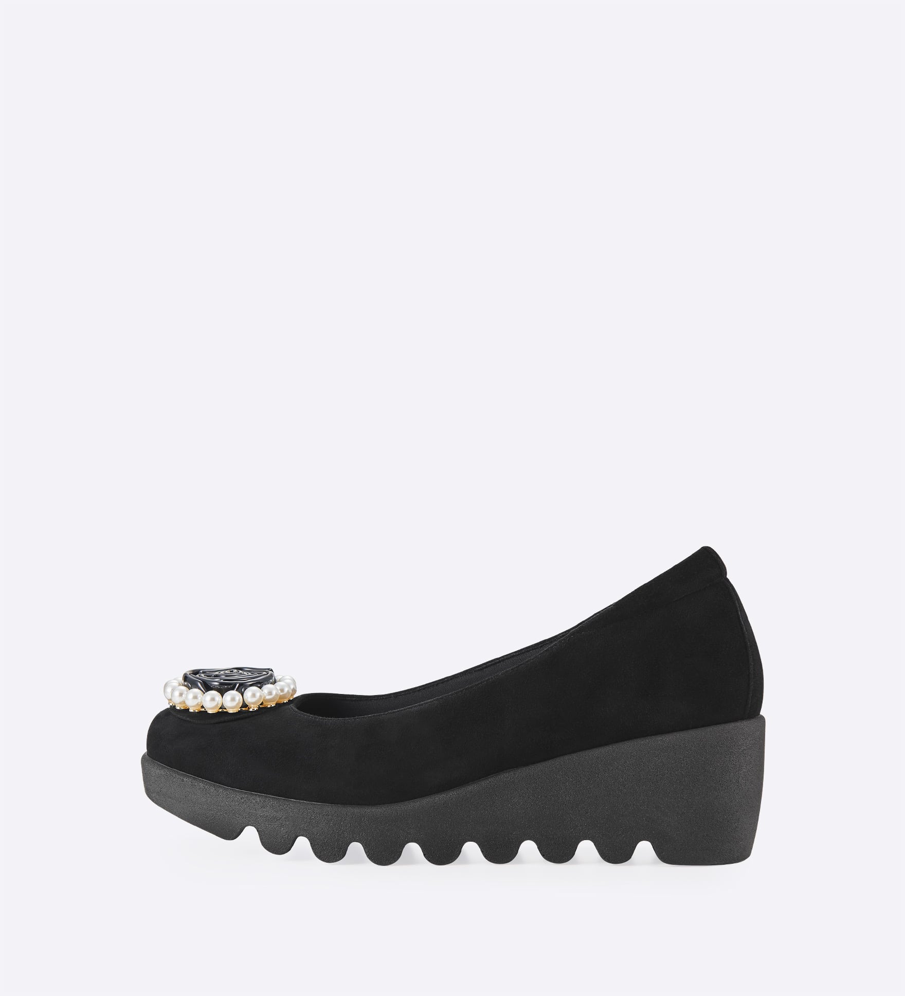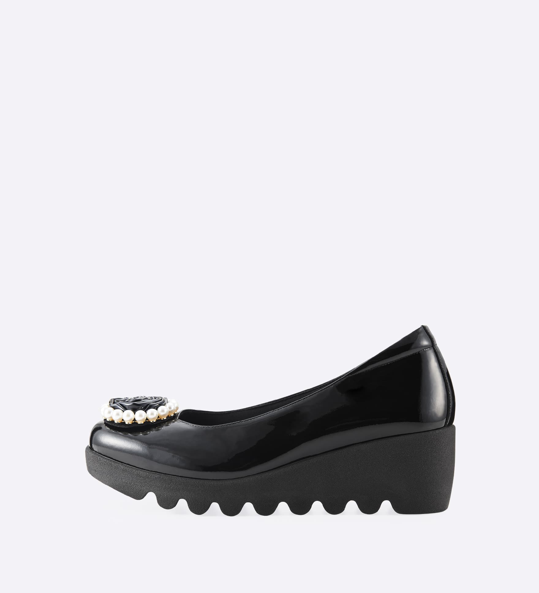 艶やかなブラックローズモチーフを、パール調ビーズで上品に囲んだ、華やかなアクセントが印象的な一足。足元にクラシカルな気品と華やぎを添え、シンプルな装いにも映えるデザインです。ブラックを基調としたカラーリングで、フォーマルにも対応。アッパーに施したインナースポンジがやさしく足にフィットし、屈曲性とグリップ力に優れた「ウェーブソール」が、快適な歩行をサポートします。