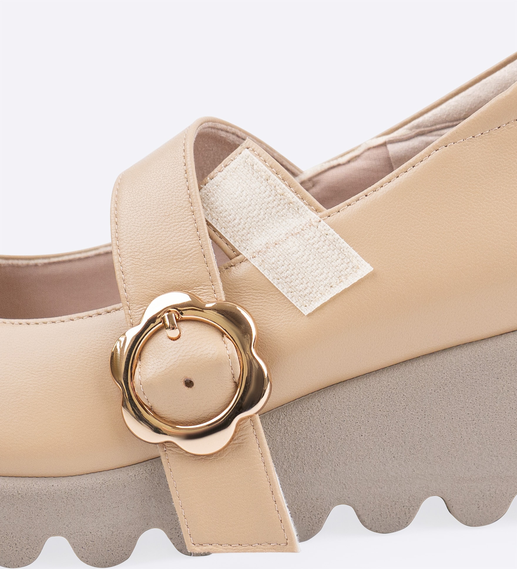 太めのベルトが足元をしっかりと支え、きちんと感のある佇まいに仕上げた一足です。丸みのあるトゥに、さりげなくあしらったメタリックラインが上品なアクセントに。通勤や日常のお出かけなど、幅広いシーンで取り入れやすい、落ち着いた表情のデザインです。