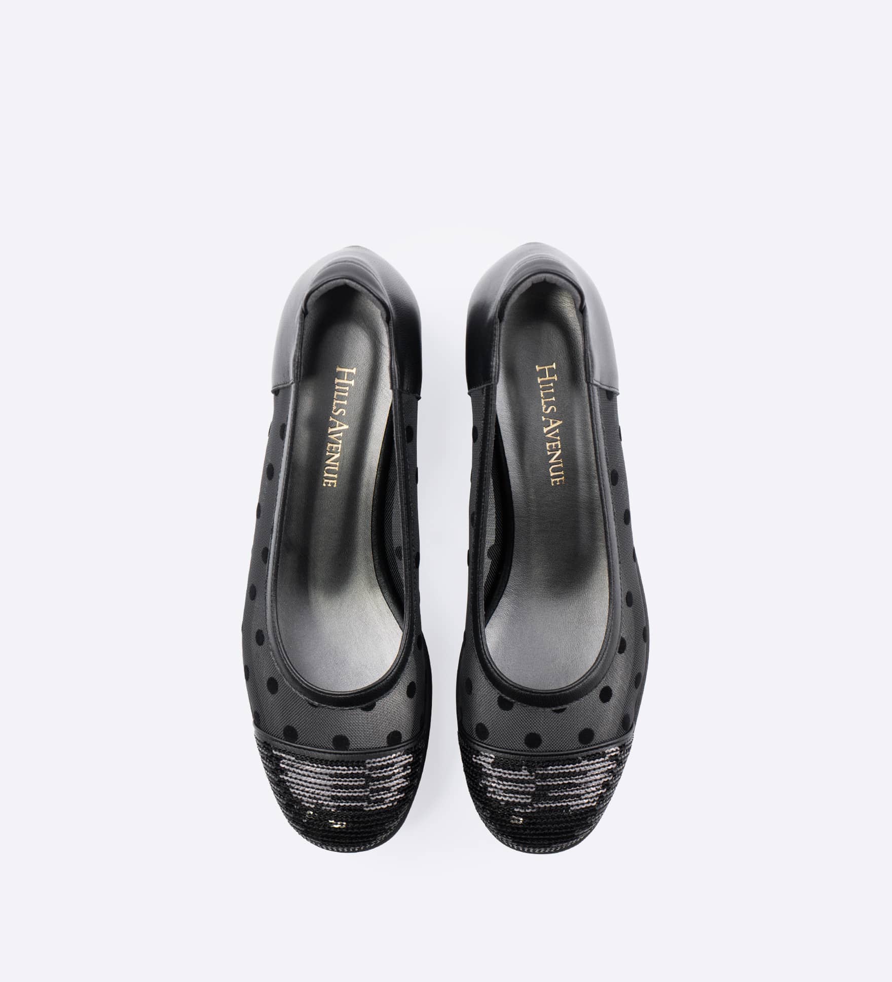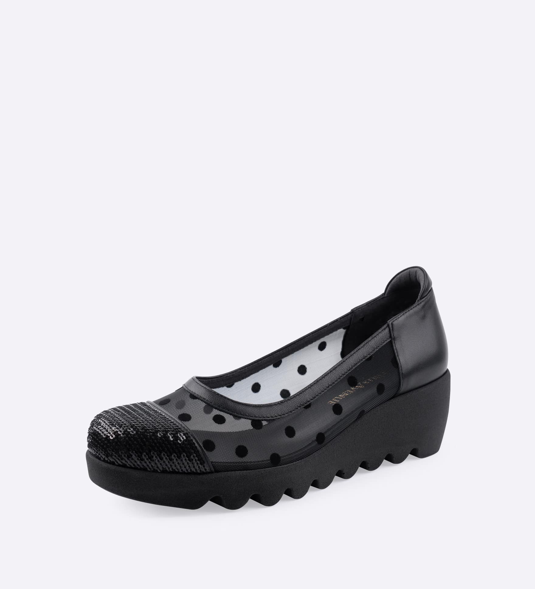 チュール素材のアッパーに、つま先のスパンコール刺繍の輝きが映えるパンプスです。抜け感のある表情が足元を軽やかに見せ、季節感のあるスタイリングを楽しめます。デイリーからお出かけまで取り入れやすい一足です。