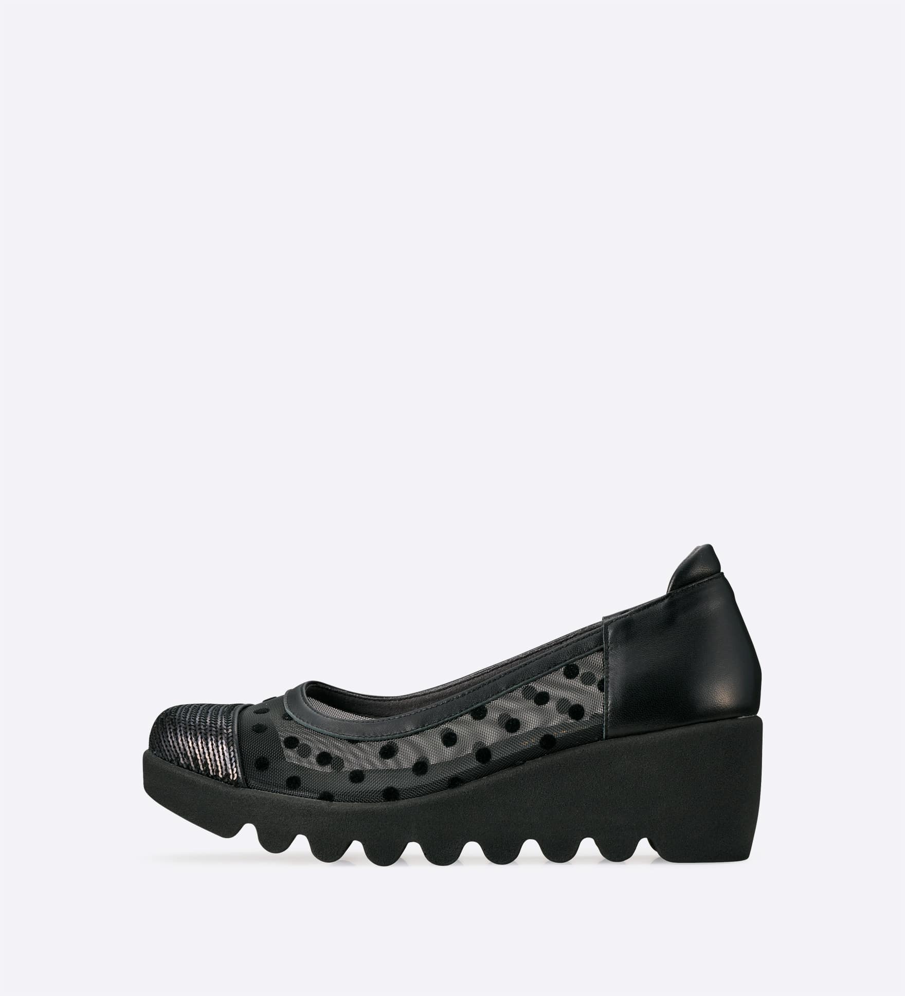 チュール素材のアッパーに、つま先のスパンコール刺繍の輝きが映えるパンプスです。抜け感のある表情が足元を軽やかに見せ、季節感のあるスタイリングを楽しめます。デイリーからお出かけまで取り入れやすい一足です。