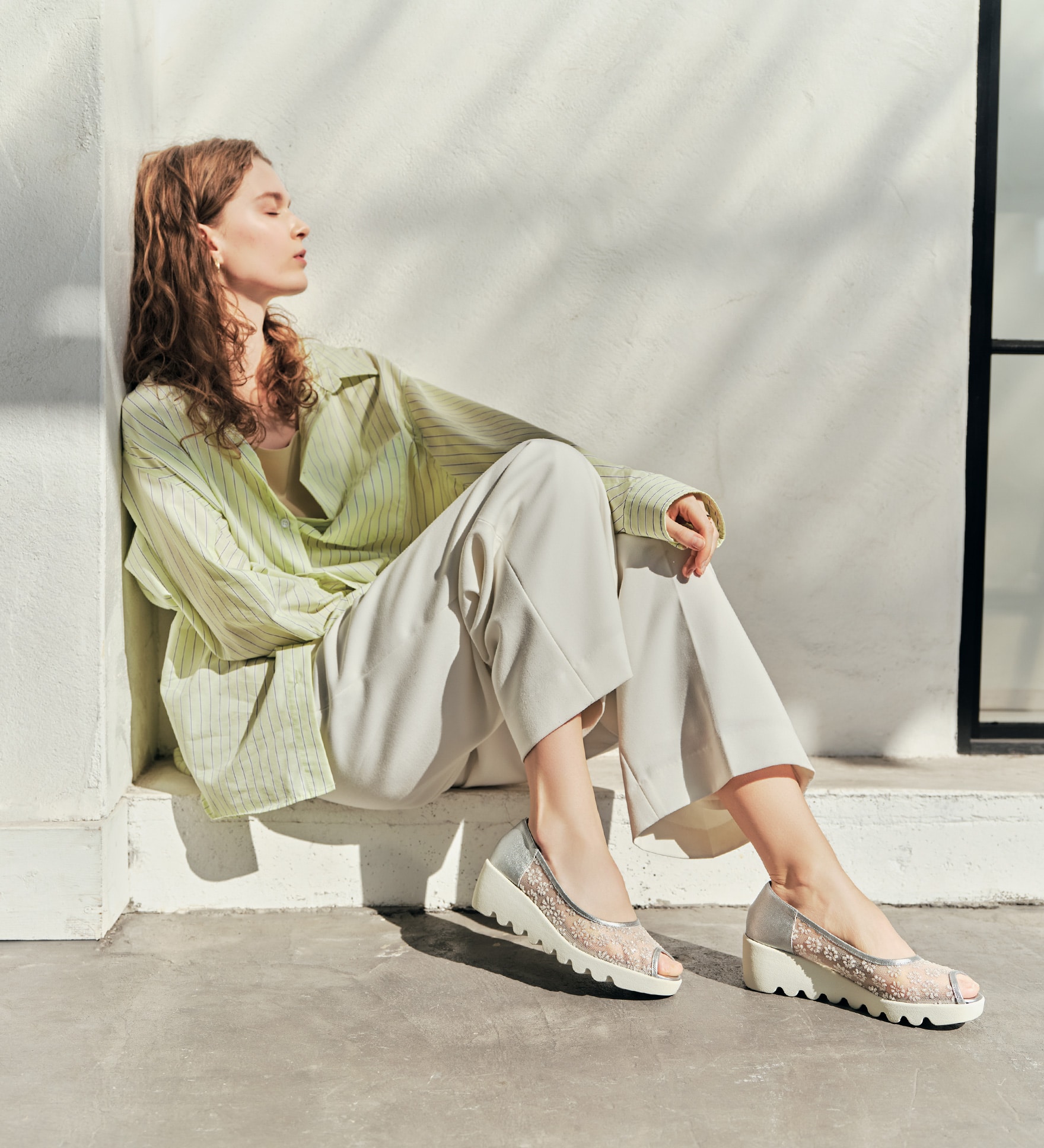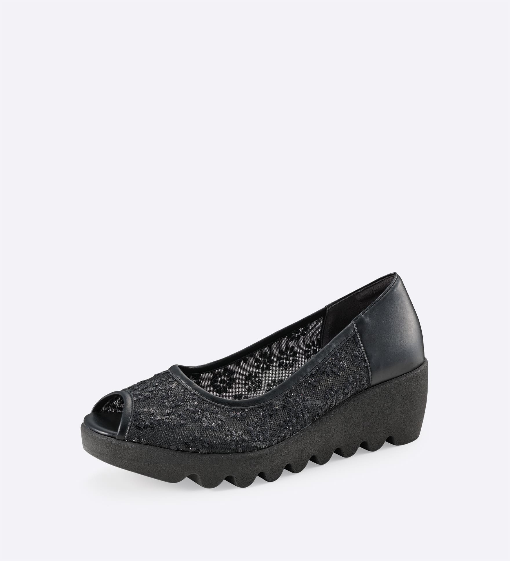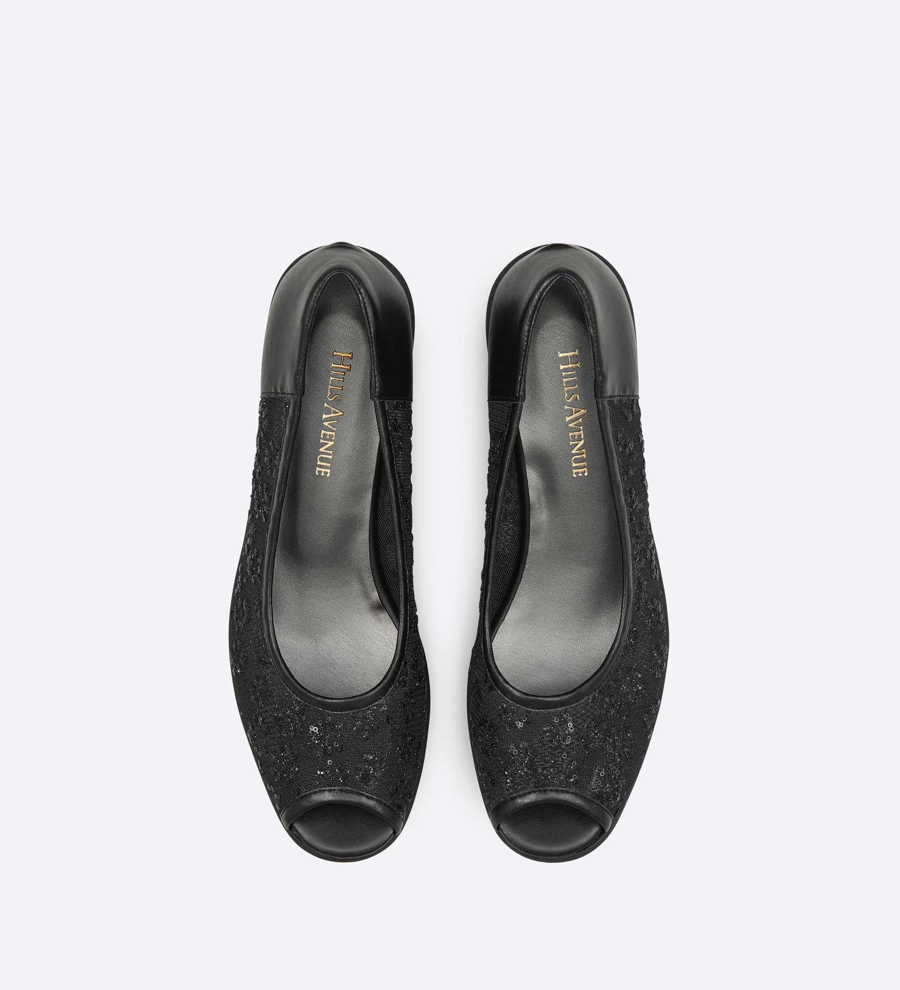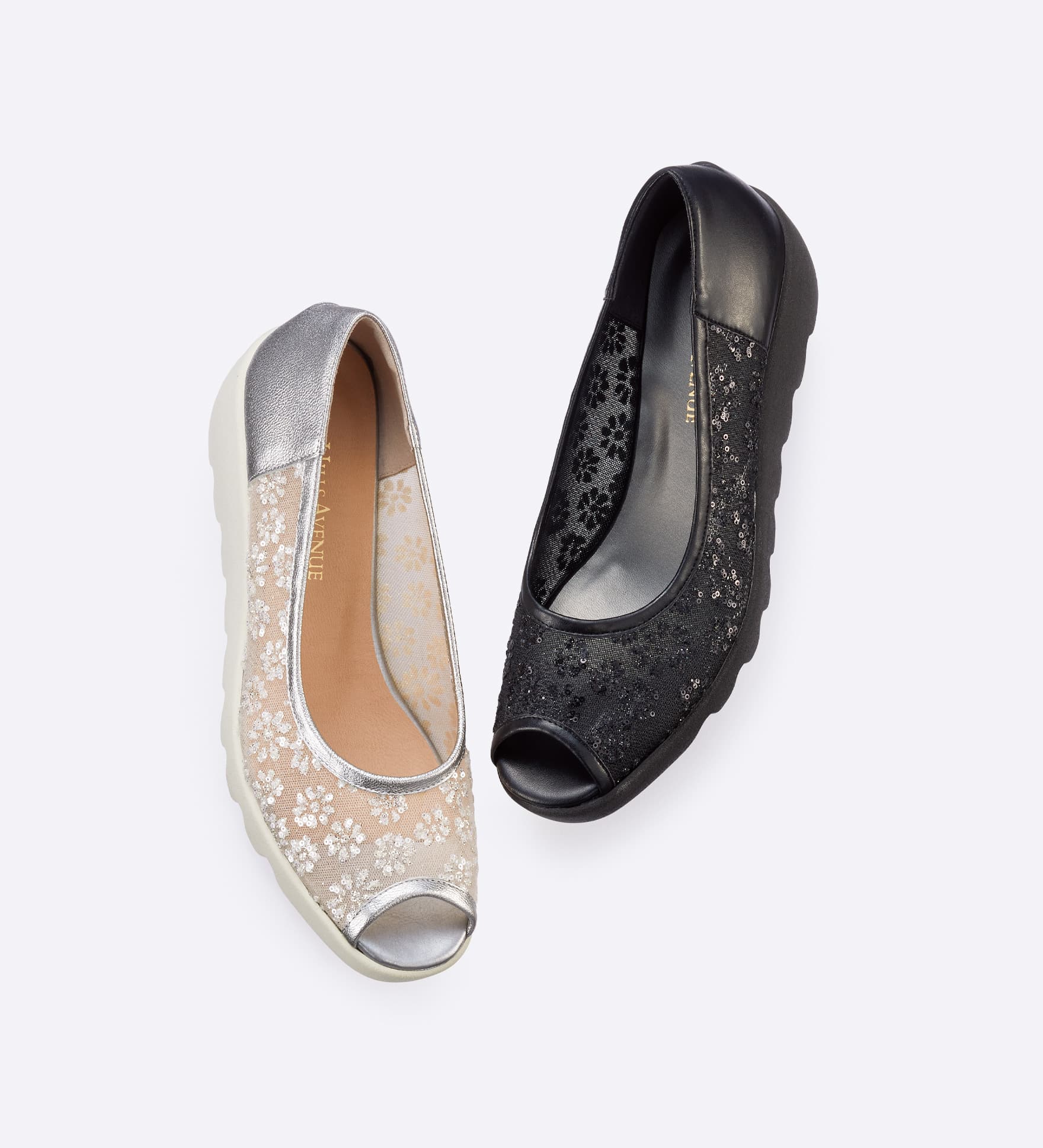 チュール素材にグリッターのお花模様を重ねた、華やかさと上品さを兼ね備えたパンプスです。つま先の空き具合にも配慮したオープントゥデザインで、足元を軽やかに演出。やさしい印象の素材使いで、デイリーからお出かけまで幅広く活躍します。