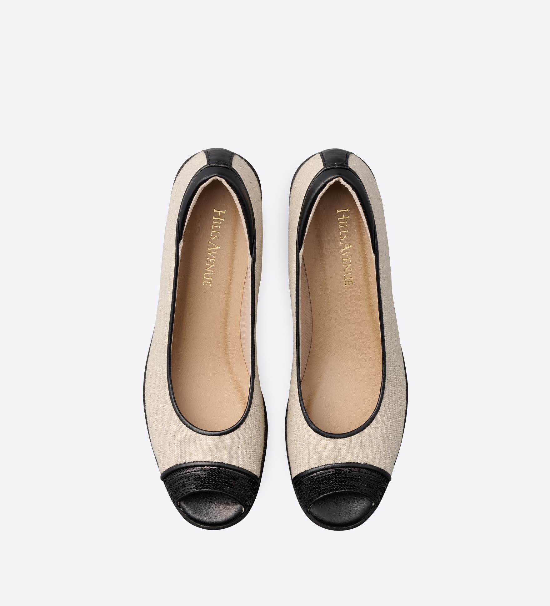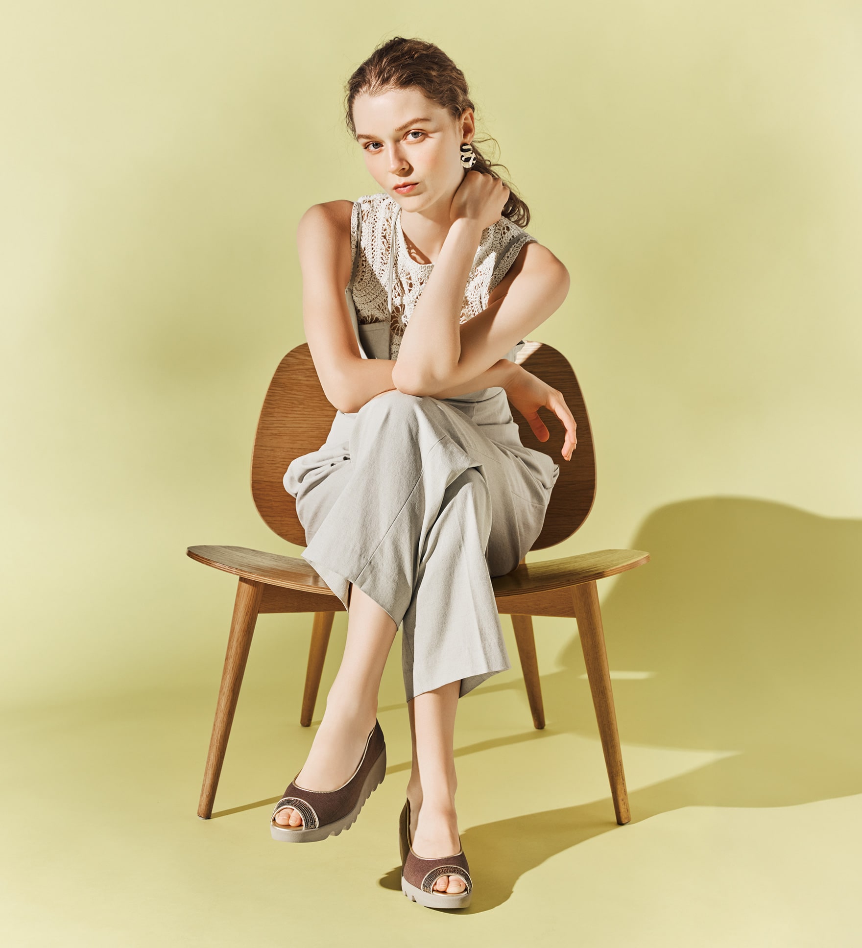 人気のヴィーナスシリーズから、麻素材を取り入れたオープントゥパンプスです。つま先には一枚ずつ丁寧に施したスパンコール刺繍をあしらい、さりげないきらめきをプラス。つま先の空き具合にも配慮したデザインで、足元をすっきりときれいに見せます。季節感のある素材使いで、デイリーからお出かけまで活躍します。
