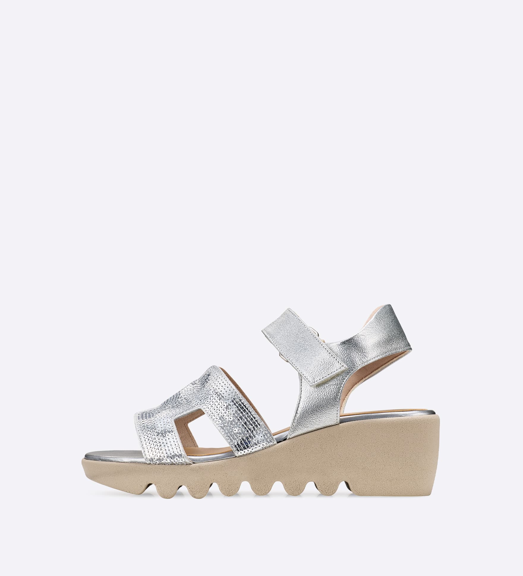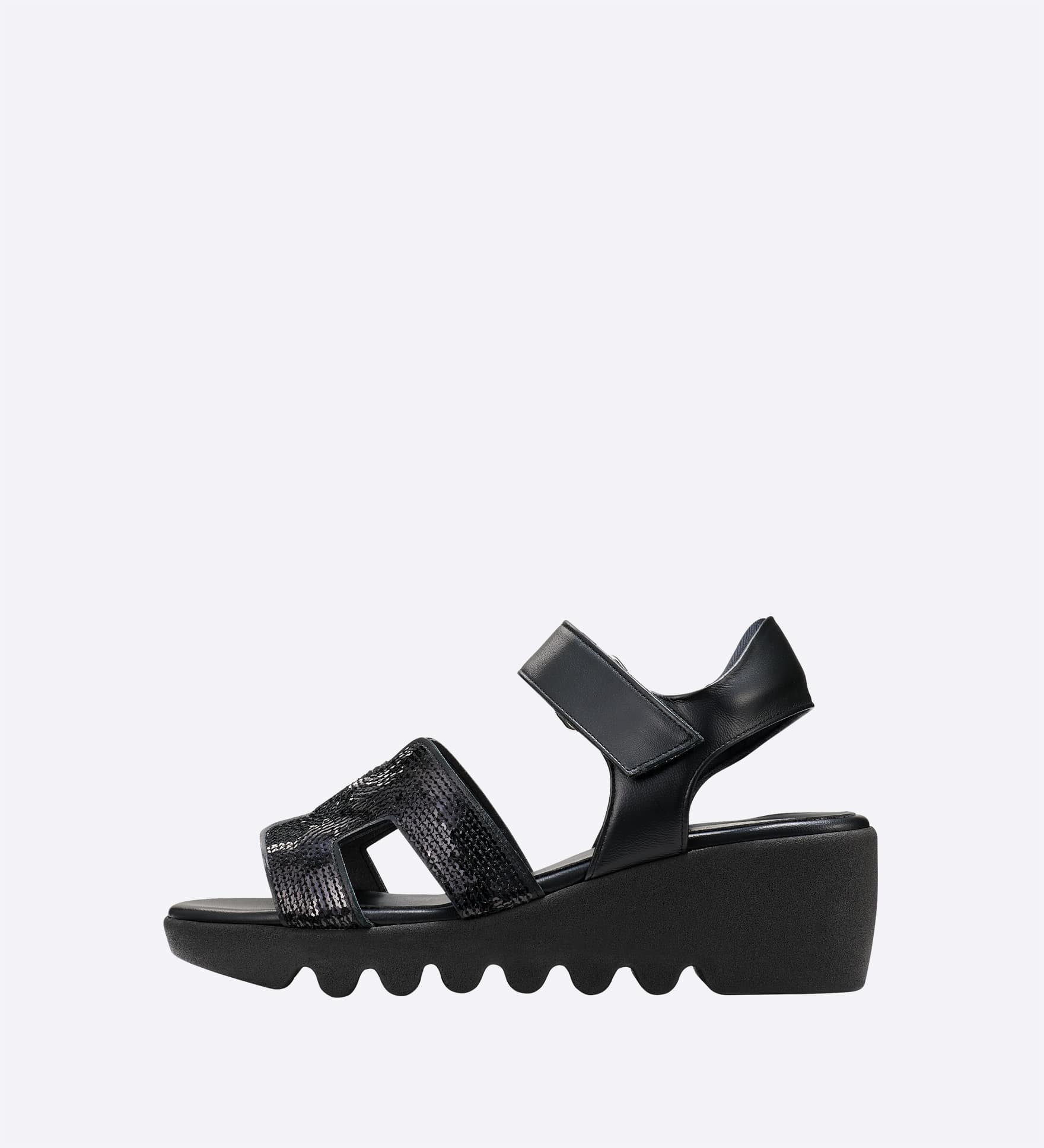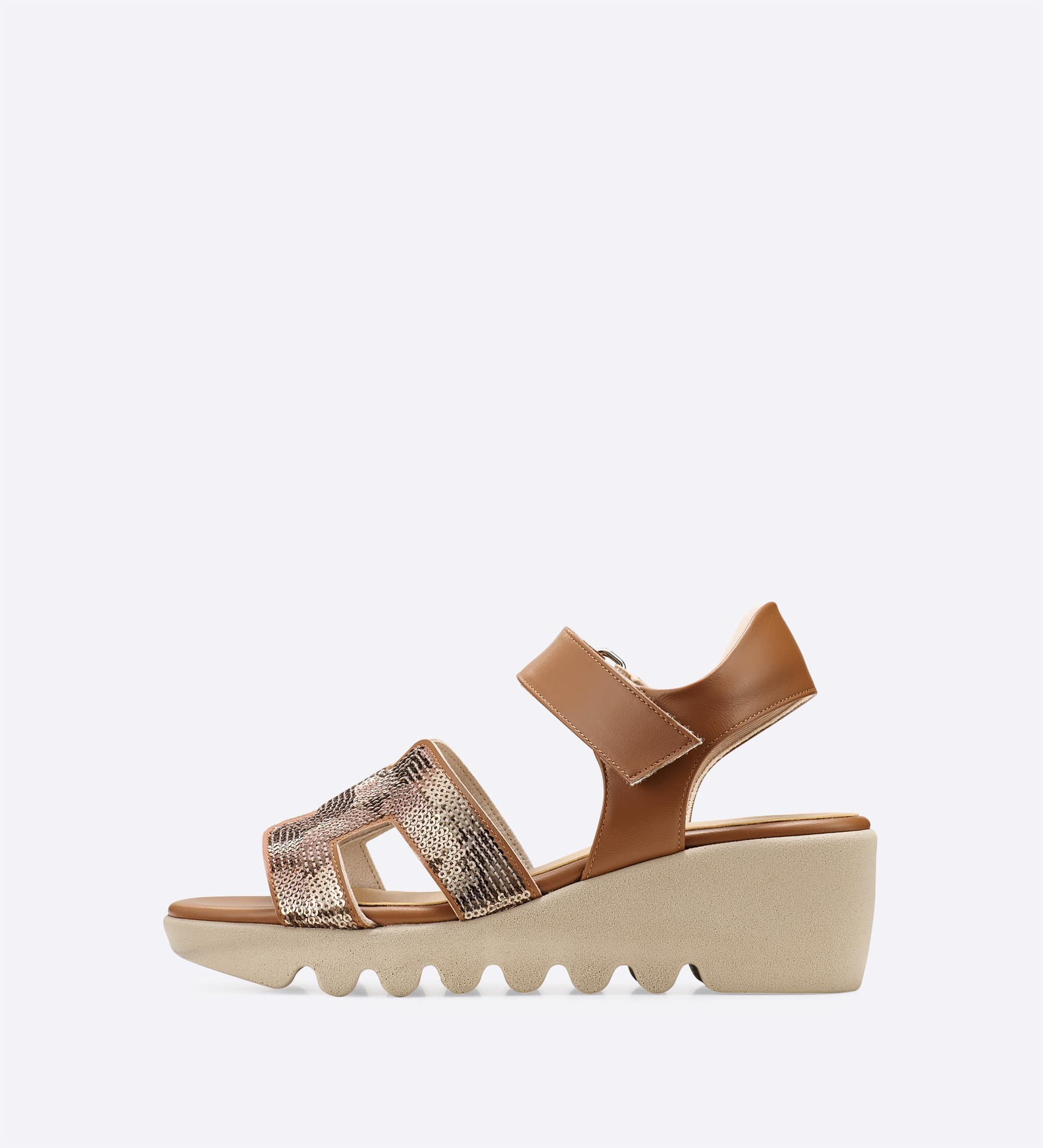 甲部分にスパンコールをあしらい、足元にほどよい華やかさを添えたサンダルです。甲まで覆うデザインとストラップ仕様で、安定感を意識したつくりに。ストラップは面ファスナーで調整しやすく、デイリーからお出かけまで幅広く活躍します。