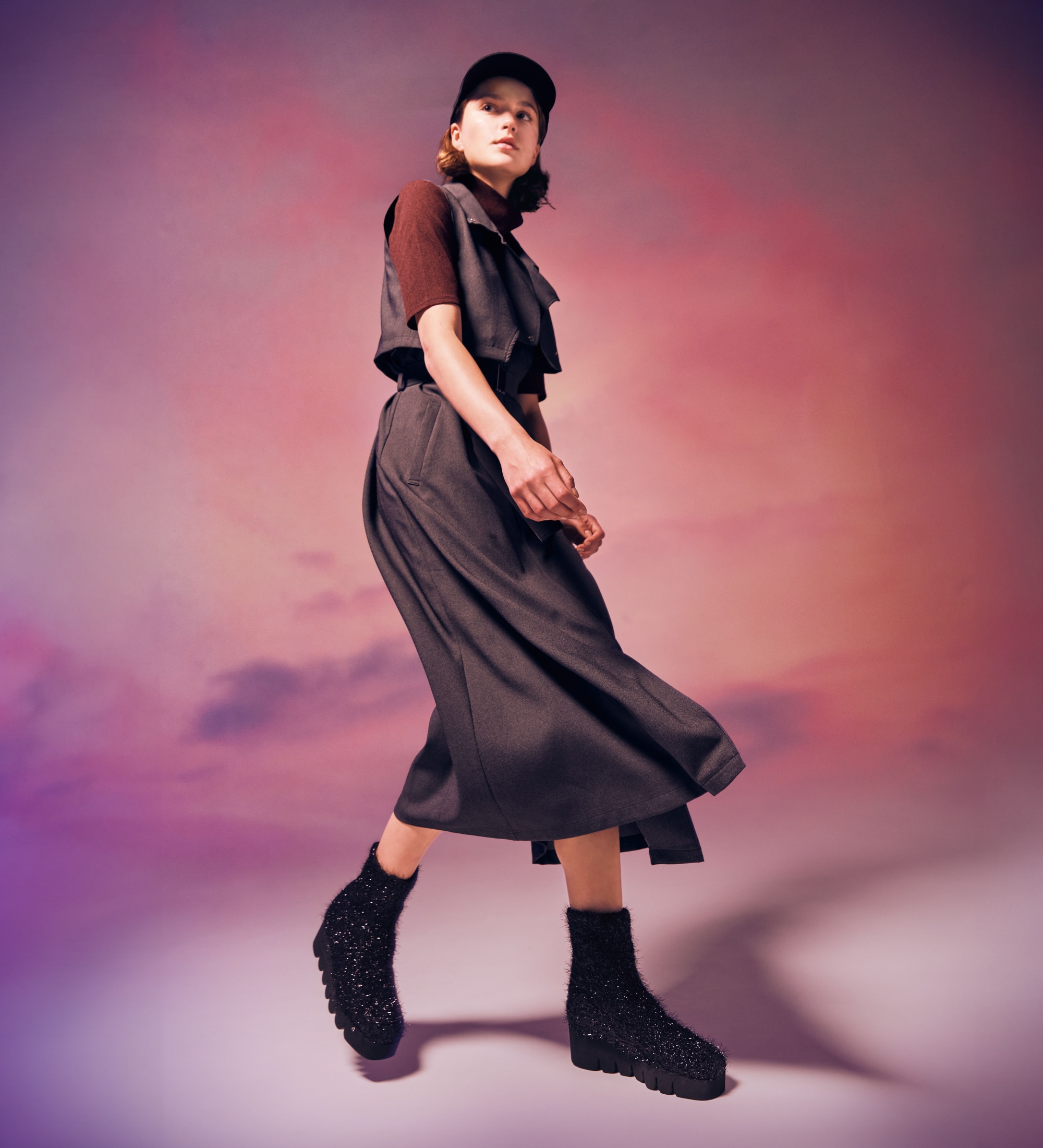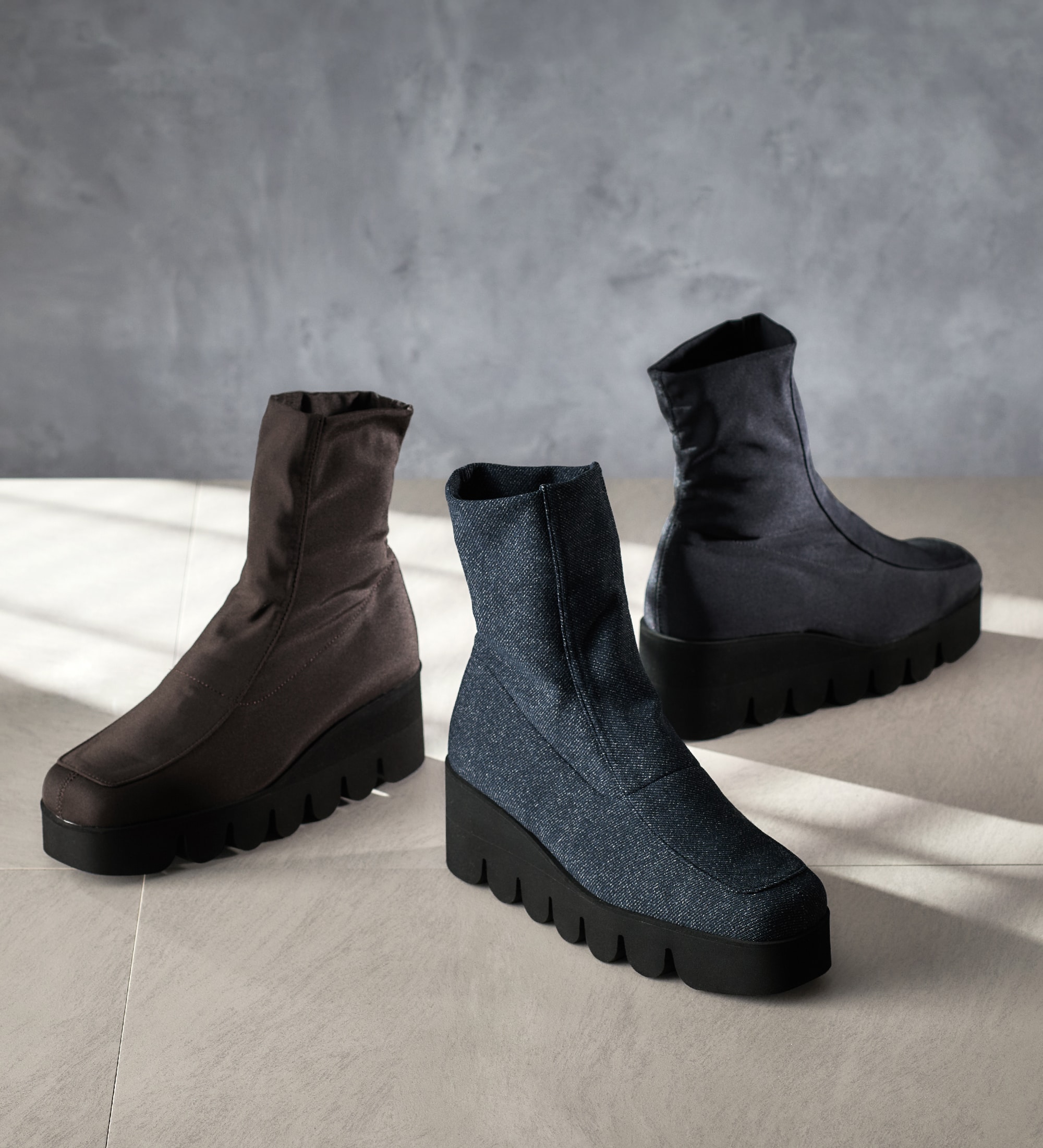 伸縮素材が脚のラインにフィットして、美しいラインを描くストレッチブーツ。今季は様々な素材やディテールを揃えました。滑りにくいEVAソールは厚底でありながら驚くほど軽く、安定感があります。